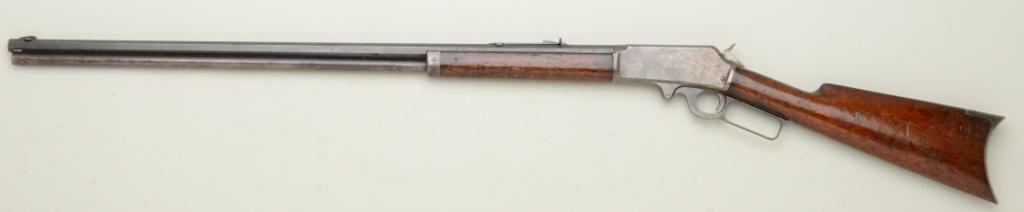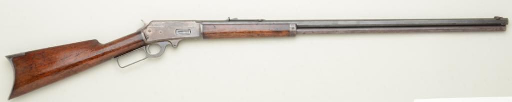 Marlin Model 1893 lever action rifle, .38-55 cal., 30” octagon barrel, blue and case hardened finish, wood stocks, #157894. This gun is in overall very good to near fine condition showing considerable muted bluefinish on the barrel and loading tube, “Special Smokeless Steel” marked left barrel flat, traces of case colors on receiver, lever, hammer and crescent butt plate with balance gone to silver toning and brownpatina; very good to fine bore, crisp action and markings, good to very good wood with scattered old mars and scratches from carry and storage; desirable caliber and barrel length. Est.: $600-$1,200.