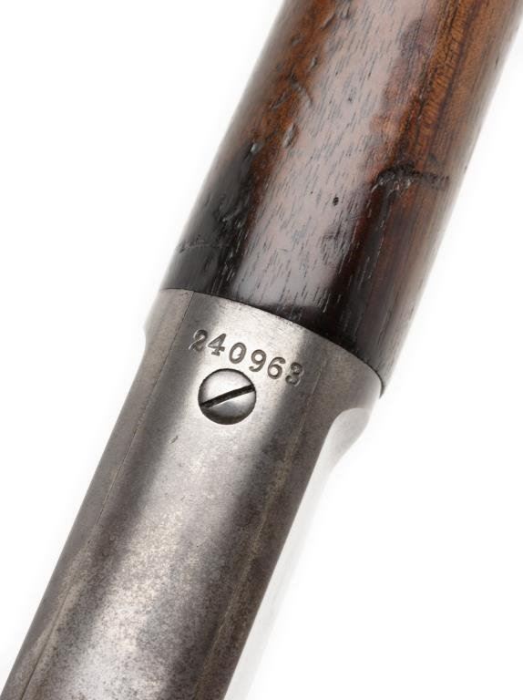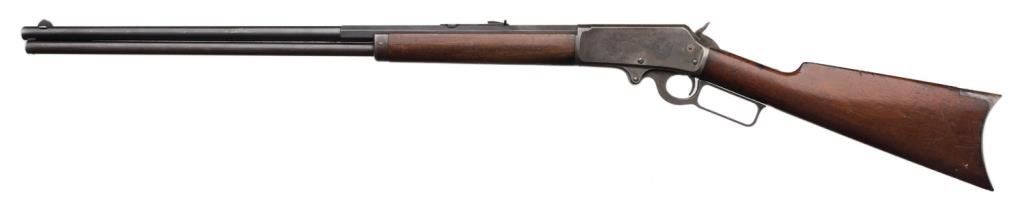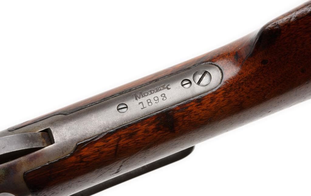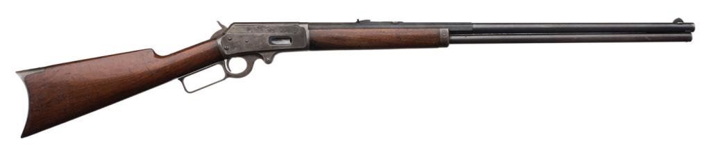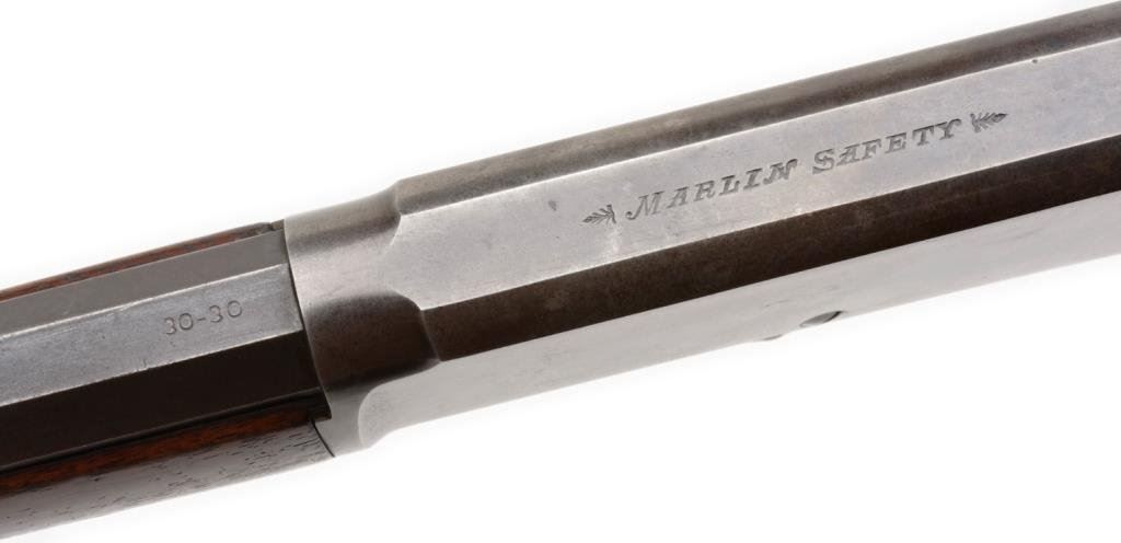 Marlin Model 1893 special order rifle in .30-.30 Cal with 26” half-round, half-octagon BBL, blue and cased hardened finish, SN: 240963 made about 1902. In good to very good condition with 75%-85% original blue, 50%-60% case colors drifting to silver gray with rainbow hues still evident. Good markings and crisp metal. The stocks show 50%-70% varnish with storage scratches and minor imperfections. Good action and bright bore. Est.: $800-$1600