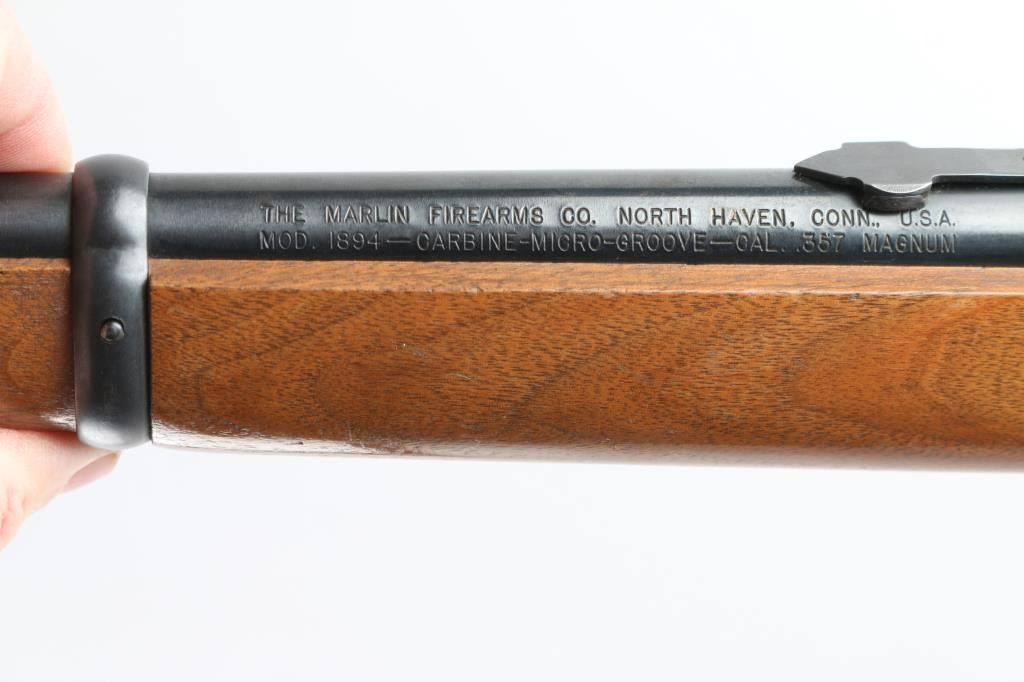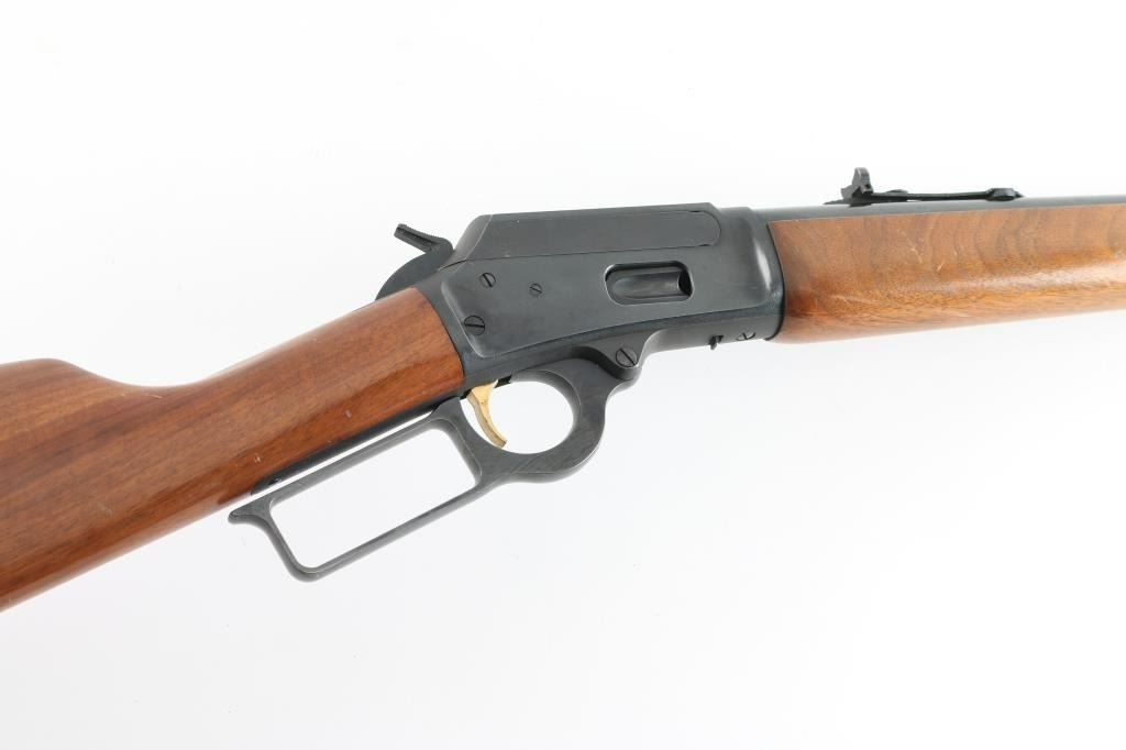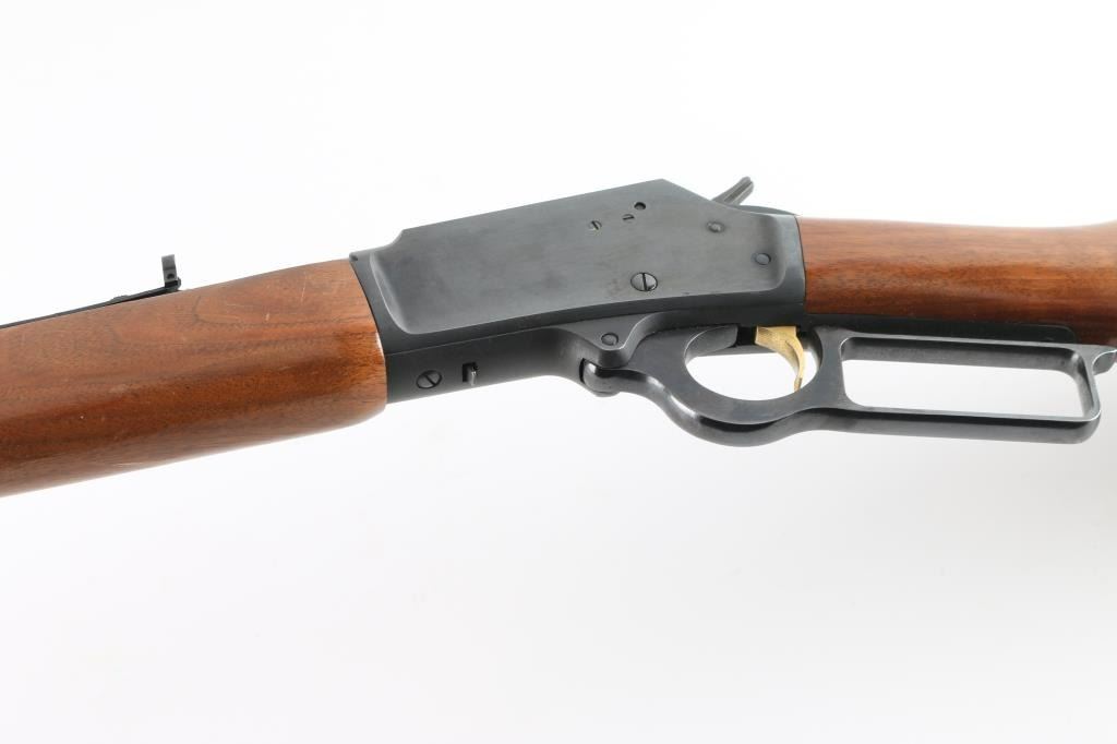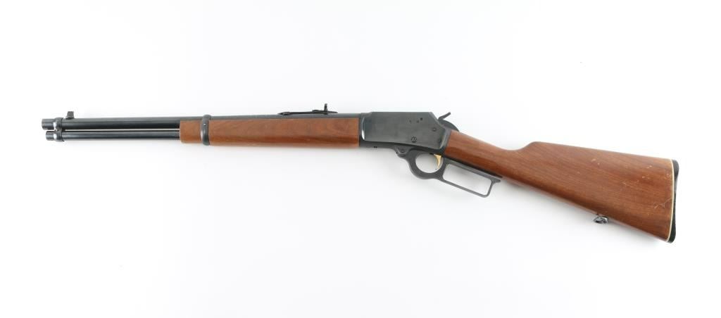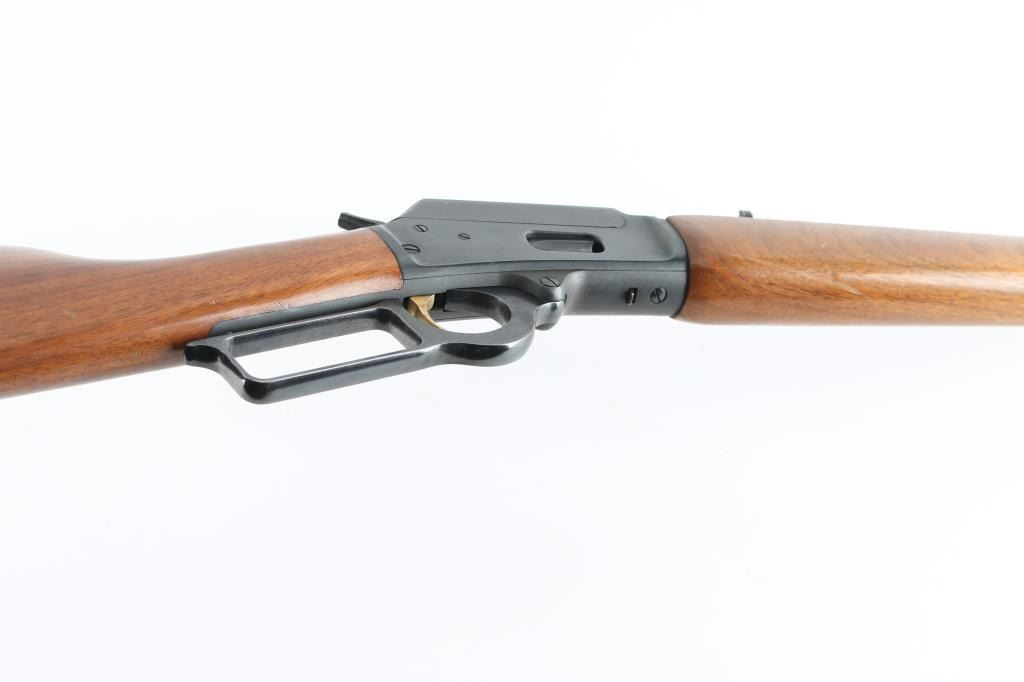 Lever-Action. Carbine configuration. Manufactured 1980. 18" round barrel with post/bead front and u-notch flip rear sporting sights. "JM" stamped on lower barrel. Straight walnut stock/forearm. Black plastic factory buttplate, with white spacers. Receiver drilled/tapped for scope mount. Gold toned smooth trigger. Action is crisp/tight. Bore appears dark/dirty, but strong rifling, needs cleaning. Blued metal finish is about 96%. with some scratches/rubs. There is a small area of very minor pin-prick on the right receiver. Wood is very good with a few minor scratches.