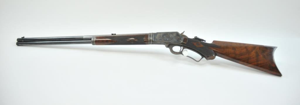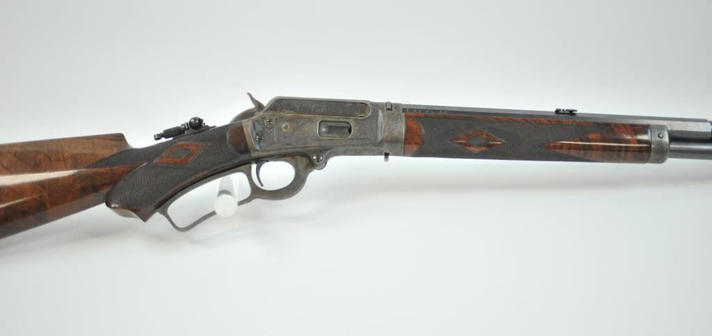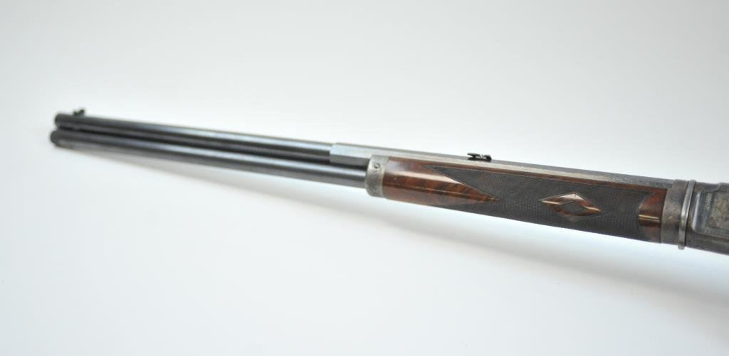 in .38-40 with a 24” barrel, full mag, takedown, fancy checkered deluxe pistol gripped burl wood stock, crescent butt, S/N 128460. The rifle remains in excellent original condition with 95%-98% original blue, 90%-95% bright and fiery case colors, just slight toning and minor normal age. The stocks are fine with most original varnish and just a few scratches and slight handling. The engraving of a higher grade with engraving also on the breach end of the barrel. A fine interior and bore. Sharp. (Antique) Est.: $8,000-$16,000