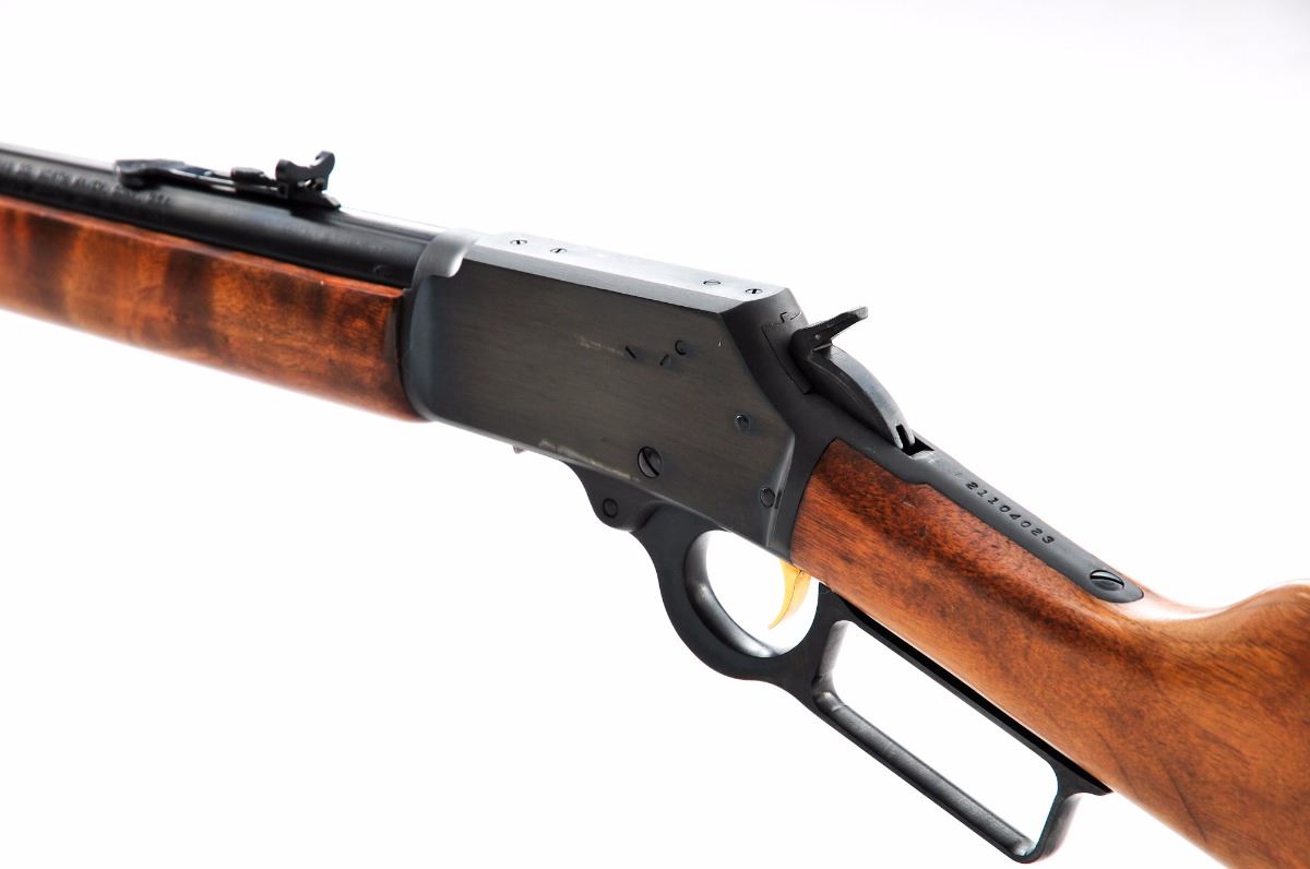 Marlin Model 1894 Lever Action Rifle, #21104023, .44 mag. cal., 20'' round micro-groove barrel, blue finish, smooth straight walnut stock and forend, factory black checkered Marlin buttplate, hooded brass bead front sight, semi-buckhorn rear sight, with gold-plated trigger. Condition is about fine retaining approx. 97% blue. Receiver with a few scattered small scratches and mars to the top edge. Stock with general fine impressions; forend with original Marlin sticker. Mild toning to the gold-plated trigger. Action is crisp, bore is bright with nice rifling. Est.: $300-$500. (Modern)