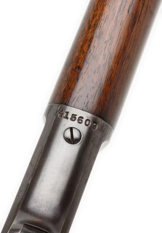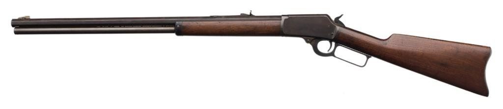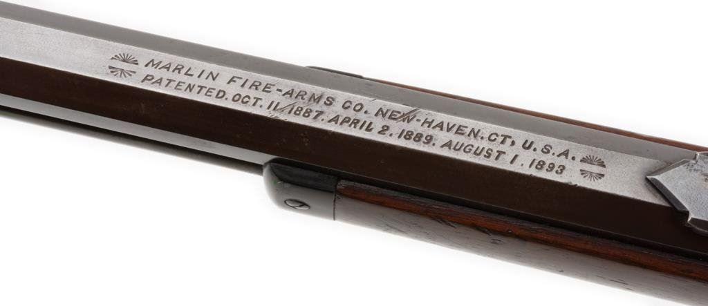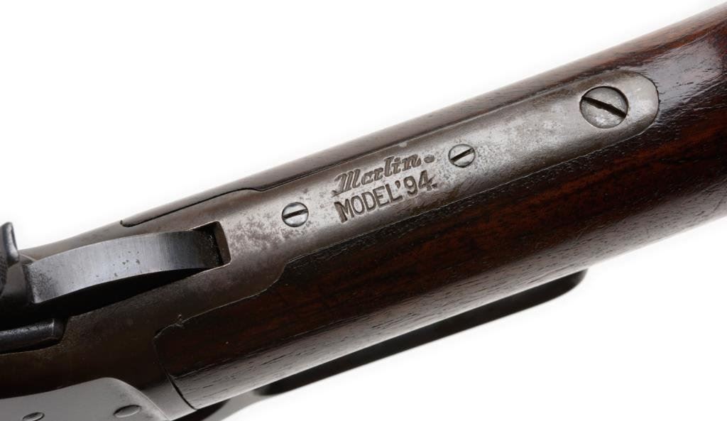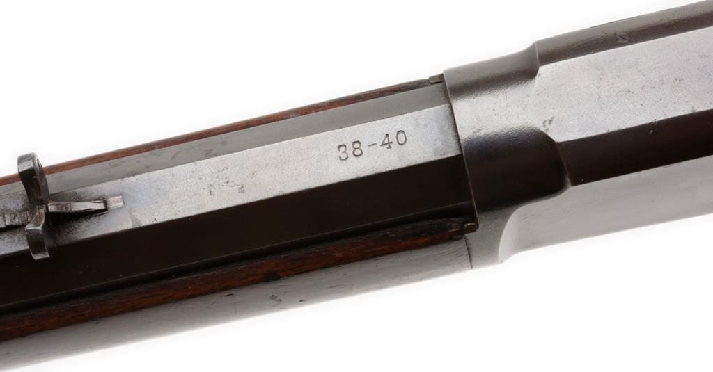 *Marlin Model 1894 lever action rifle, 38-40 cal., serial #415609. The rifle is in overall very good condition with a 24” octagonal barrel, silver knife blade front sight and adjustable buckhorn rear. The rifle retains a significant amount of its thinning blued finish on the barrel with some light surface rust noted. The receiver still shows muted case color with some brighter colors evident in the lever. The smooth wood stocks show wear consistent with use but are in overall very good condition. The butt stock is completed by a metal crescent butt plate. The bore is very good, the action is crisp and markings are legible on this fine, old Marlin. Est.: $500-$900.