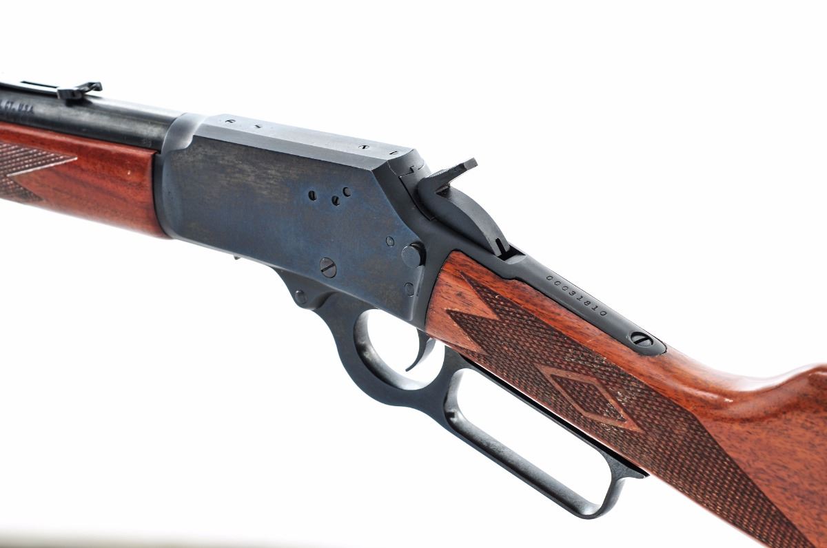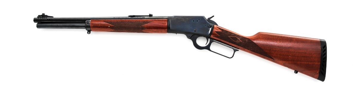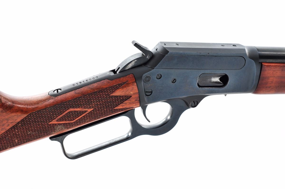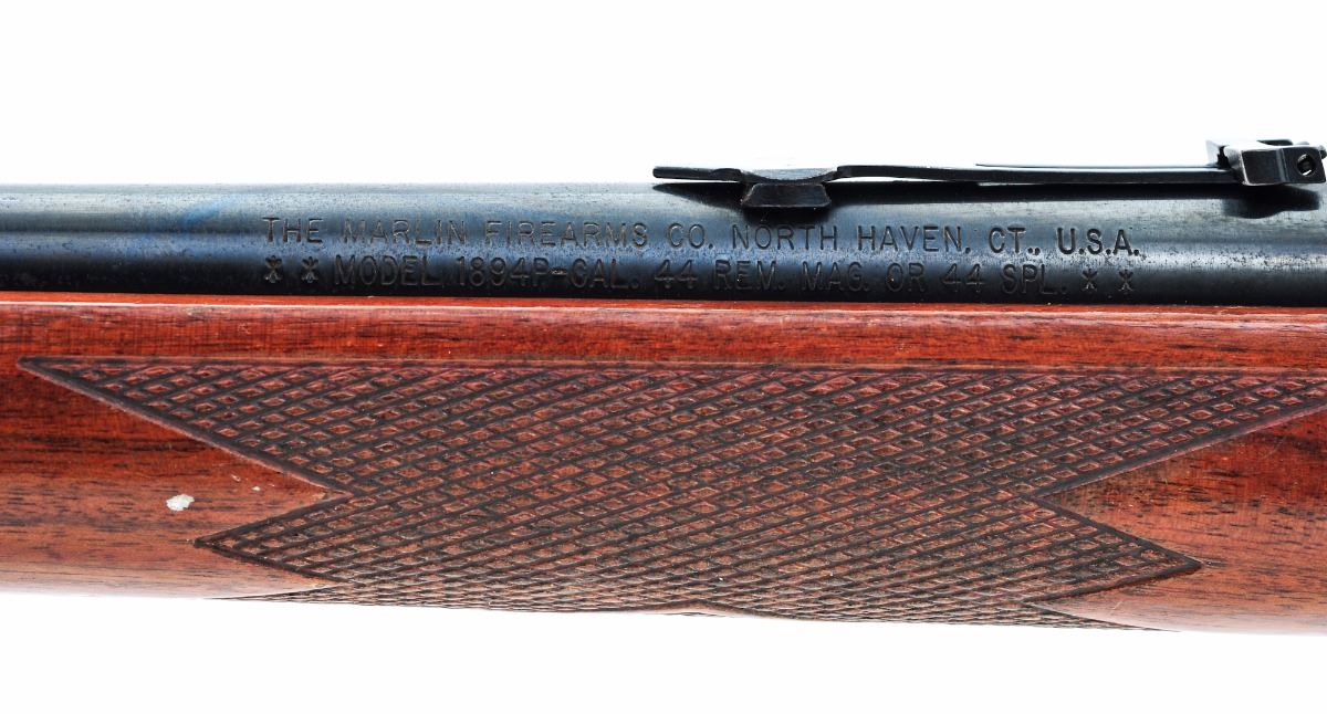 Marlin Model 1894P Lever Action Carbine, #00031810, .44 Rem. mag. or .44 Spec. cal., 16'' ported barrel, blue finish, straight checkered walnut stock and forend, factory black rubber Marlin recoil pad, with dovetail blade front sight, folding notched rear sight which is missing the elevator, and sling swivel studs. Condition is very good retaining approx. 97% blue. Metal surfaces with scattered pinprick pitting. Stock and forend with several scratches and marks, the most substantial to the right side of buttstock and right side of forend. Action is crisp, bore is fine. Est.: $400-$500. (Modern)