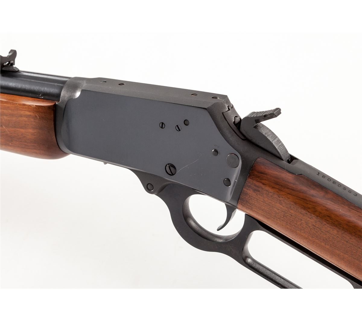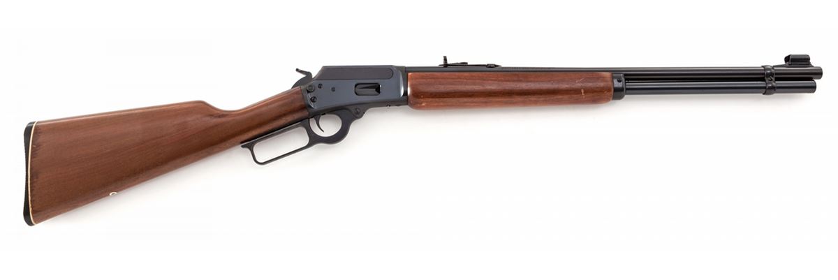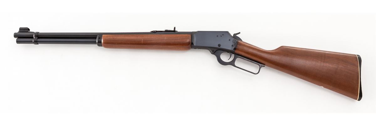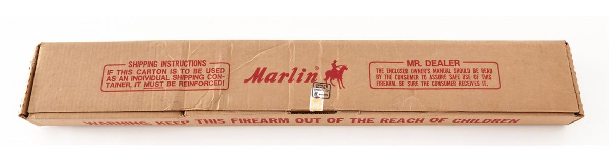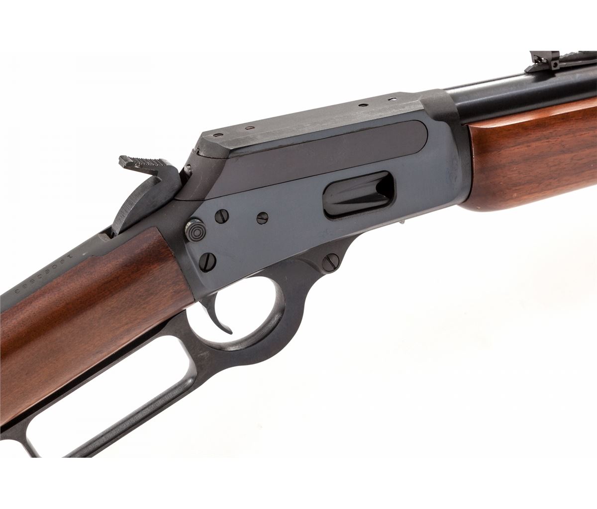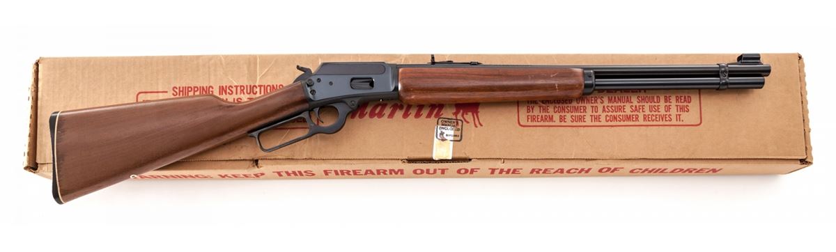 Marlin Model 1894S Lever Action Rifle, #16060563, .44 mag. or .44 Spl. cal., 20'' barrel, blue finish, smooth walnut stock and forend, Marlin hard rubber buttplate, adjustable semi-buckhorn rear sight, hooded front sight, in original box with matching end label. Condition is fine overall retaining approx. 98% blue, metal surfaces with micro-scratching, forearm with moderate scratches. Action is crisp, bore is bright. Est.: $550-$800. (Modern)