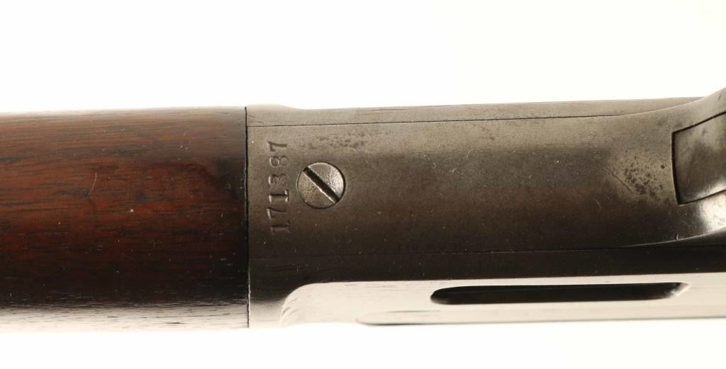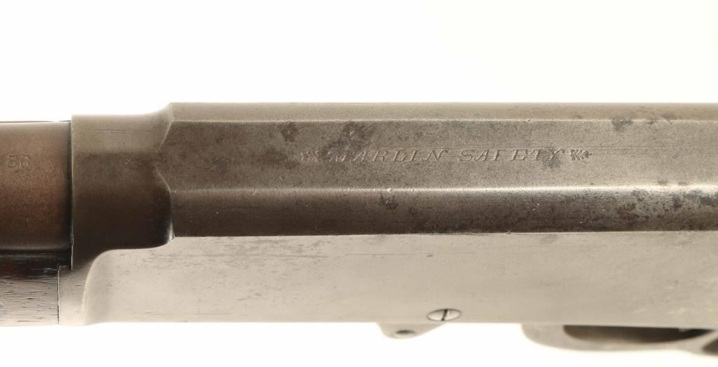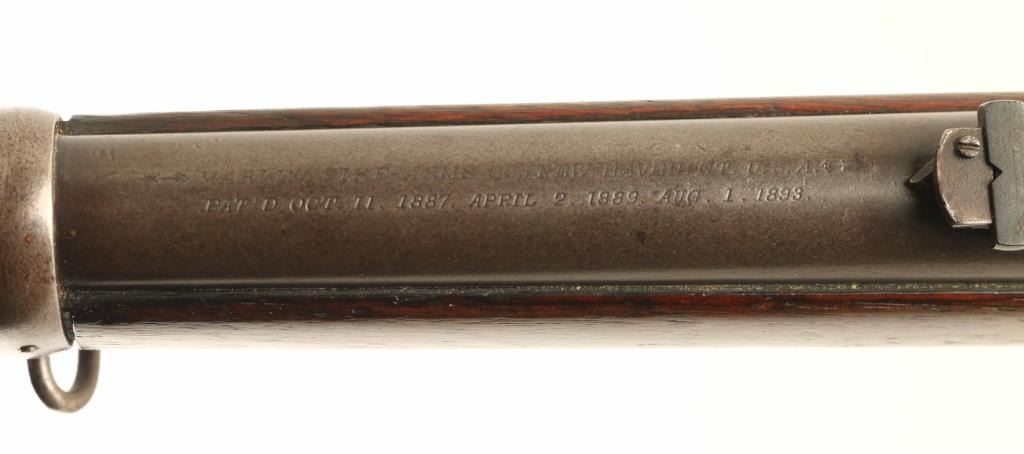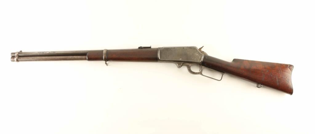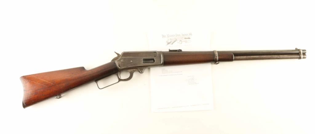 'Eastern Carbine' manufactured circa 1898. Features 22" round barrel, full length magazine tube, blade front sight, flip-up ladder type rear sight, straight grip, curved steel carbine buttplate, sling swivels. Bore is good condition, lightly frosted, with strong rifling. Metal surfaces display a grayish or brownish color, with dents & scratches, bare metal on sharp edges, small patches of patina in many places. Buttplate is bare metal with light coverage of patina giving a light brown color. Screw heads show lightly marred slots. Wood is good condition, varnished, overall good fit to metal, small wood loss at toe, scratches & shallow dents, some oil staining where wood touches metal. Large discolored scratches on left side of butt appear as possible letters or numbers, possibly just scratches. Action operates smoothly. Markings are sharp & readable, partially obscured by patina in several places. Includes letter from Cody Firearms Museum at the Buffalo Bill Historical Center describing features for this rifle contained in the original Marlin factory records. Condition is NRA Very Good (varnished wood) *** Antique Firearm ***