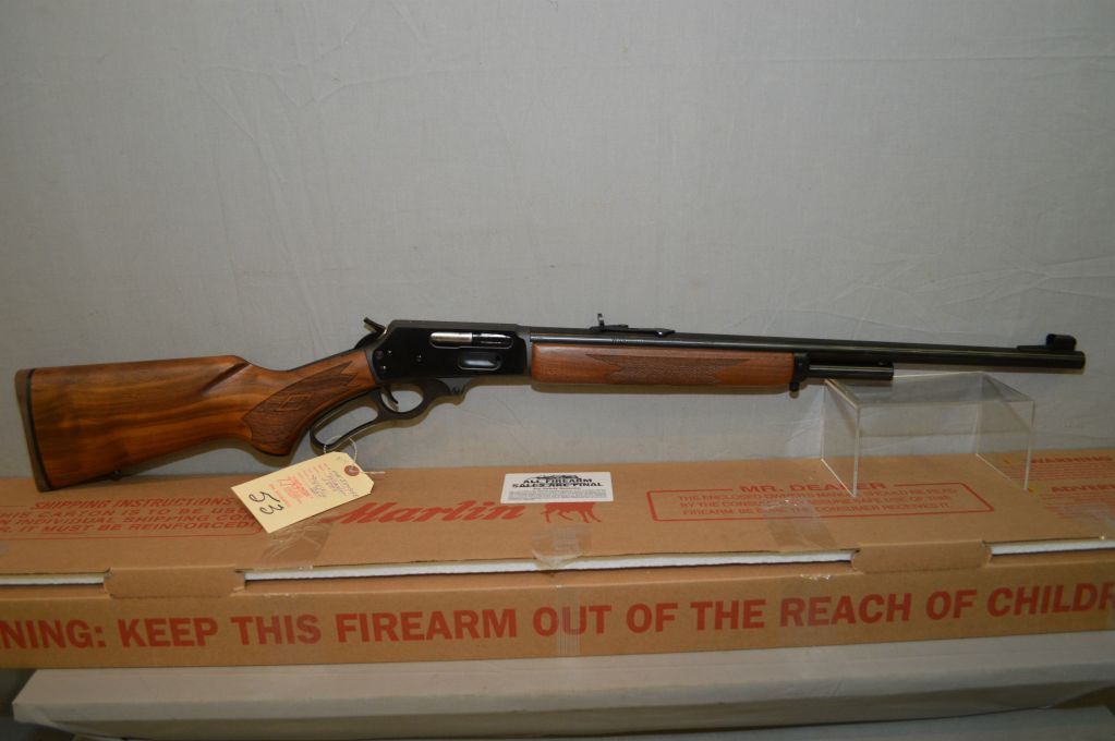 Marlin Model 1895 .45 - 70 cal Lever Action Rifle w/ 22 " bbl [ Appears as new, Unfired w/orib box, booklet & lock, blued finish, barrel sights, four shot mag, checkered walnut pistol grip stock & forend w/recoil pad ] Ser # MR 25734E