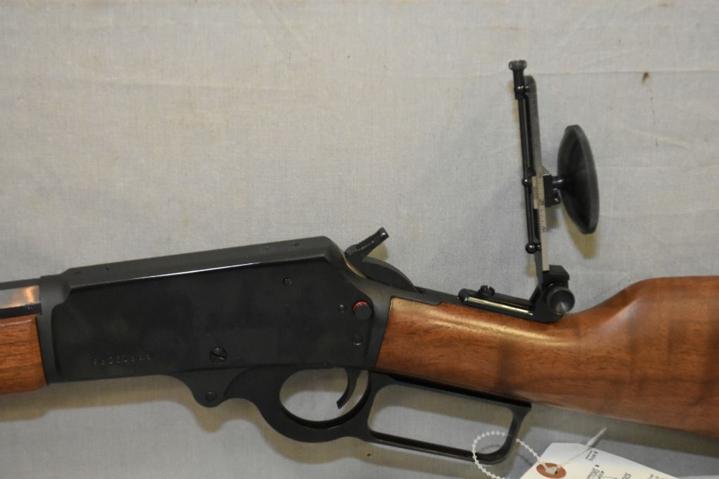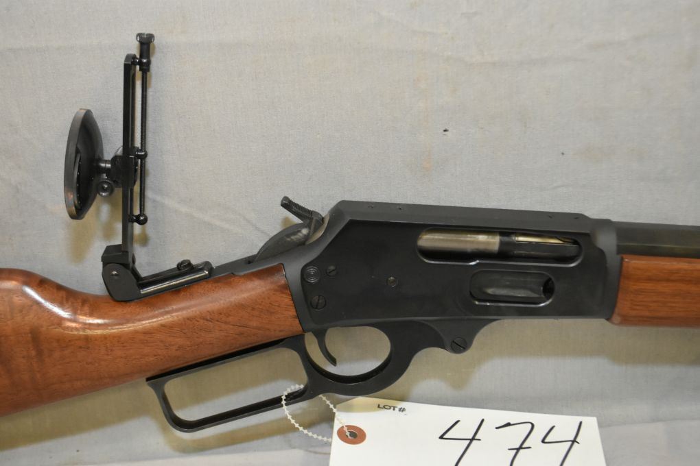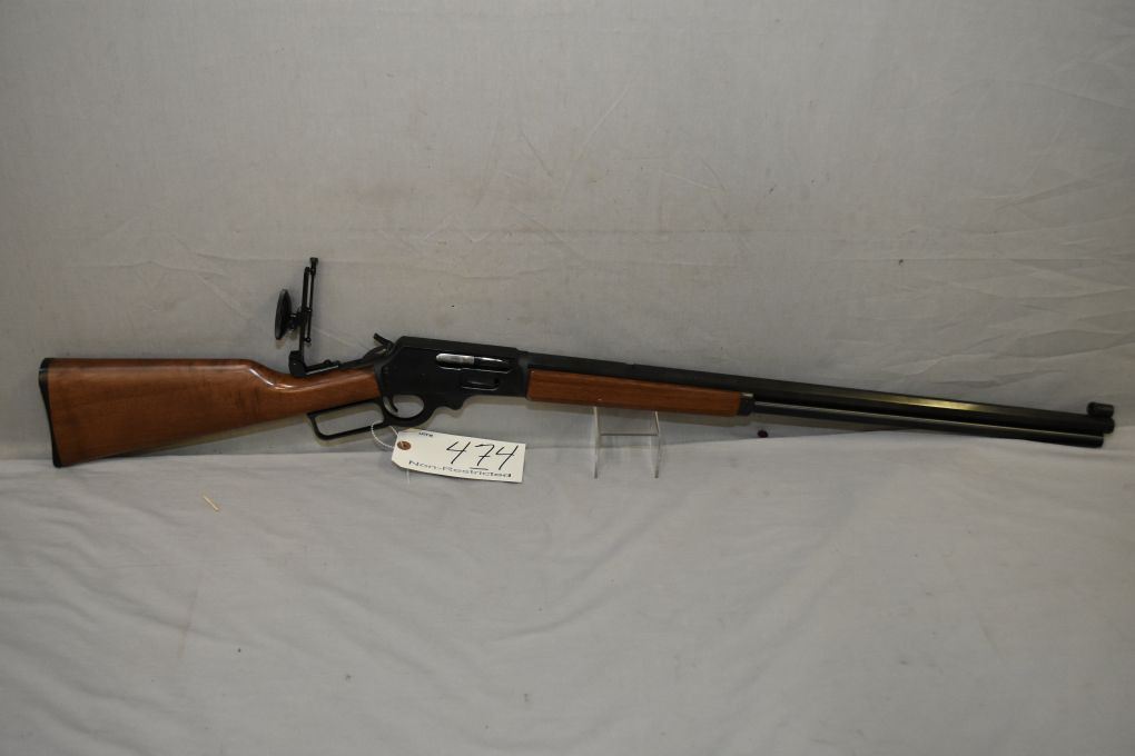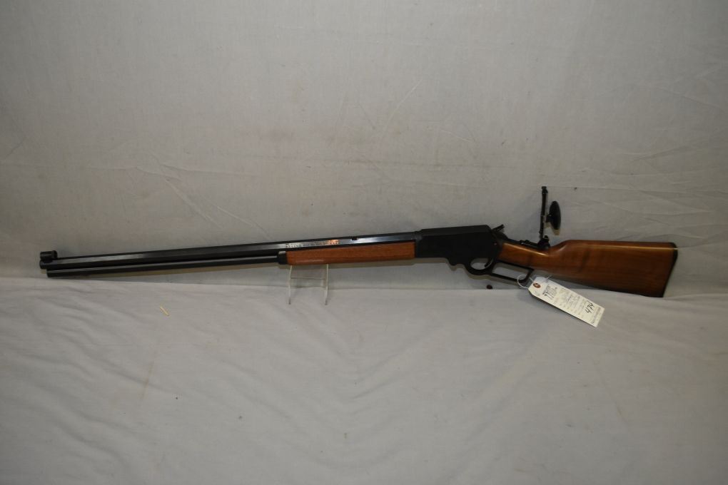 Marlin Model 1895 CB ( Cowboy Silouette ) .45 - 70 Govt Cal Lever Action Rifle w/ 26" octagon bbl full mag [ blued finish, back barrel sight removed, hooded target front sight, $ 600.00 Montana Vintage Arms Vernier Peep Style Peep Sight w/ approx. 2" Diameter adjustable peep, wooden stock & forend w/ Marlin butt plate, few slight marks ] Ser # 96201666