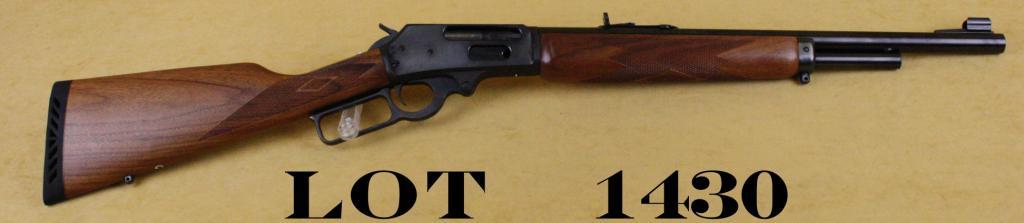 Marlin Model 1895M lever action short rifle with ¾ magazine, .450 Marlin cal., 18-1/2” round barrel, blue finish, checkered wood stocks, #94008057. This gun is in excellent condition showing approx. 99% originalfactory black finish, excellent bore, crisp action and markings, excellent wood stocks with black Marlin hard rubber butt pad. Est.: $400-$800.