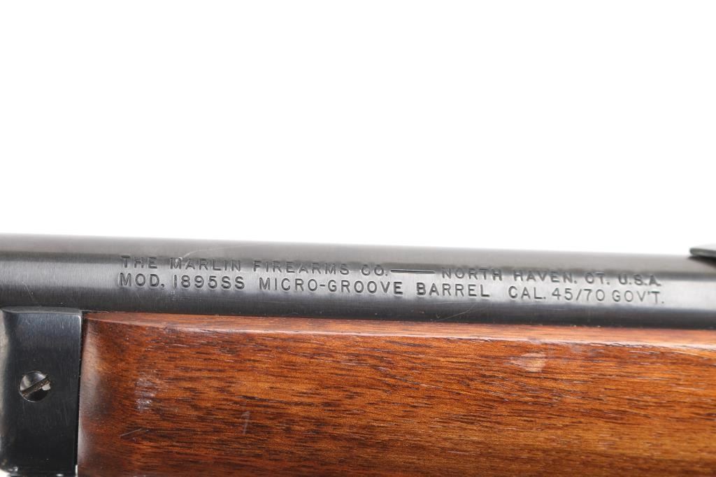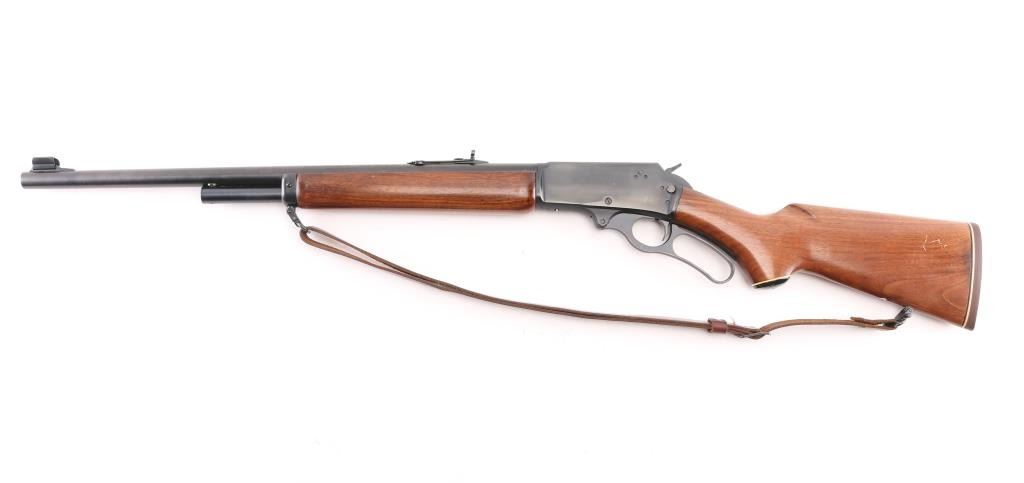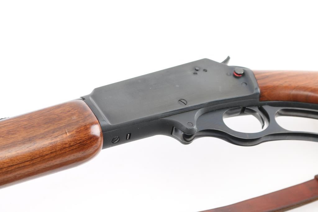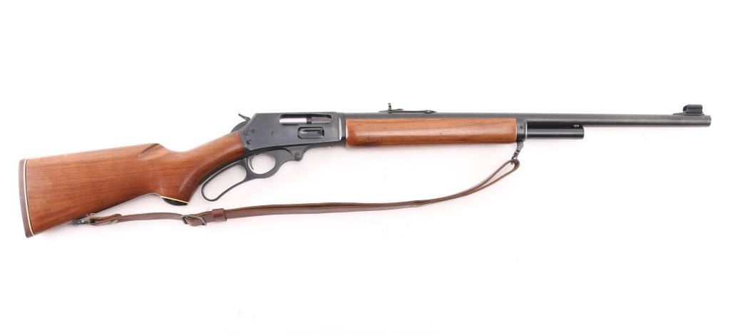 Lever action rifle manufactured circa 1989. Features blued finish, 22" barrel, hooded blade front sight (orange paint added), folding adjustable rear sporting sight, 2/3 length magazine tube, pushbutton safety, sling studs. Two piece smooth walnut stocks with curved wrist, brown rubber Marlin butt pad, blued steel forend cap, black plastic grip cap, white spacers. Bore is pristine. Retains 95% blue with handling marks, small scrapes to receiver edges. Wood is very good with scratches & dings. Includes brown leather sling. Condition is near NRA Excellent *** Modern Firearm ***