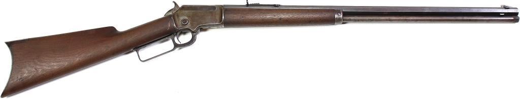 Marlin Model 1897 .32 rimfire SN 81941 lever action rifle with 24" octagon barrel, walnut stocks, crescent iron buttplate. Remains very good untouched original condition, barrel shows 30-40% blue drifting to plum, receiver gray brown, unsanded original lever action rifle with 24" octagon barrel, walnut stocks, crescent iron buttplate. Remains very good untouched original condition, barrel shows 30-40% blue drifting to plum, receiver gray brown, unsanded original stocks NO chips, cracks or repairs. Very good action and good bore. Outside of barrel show bulge 7" from barrel edge. Modern.