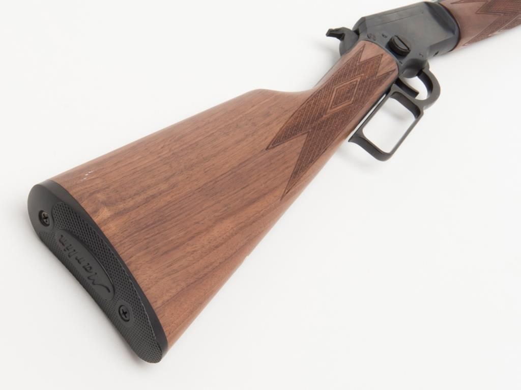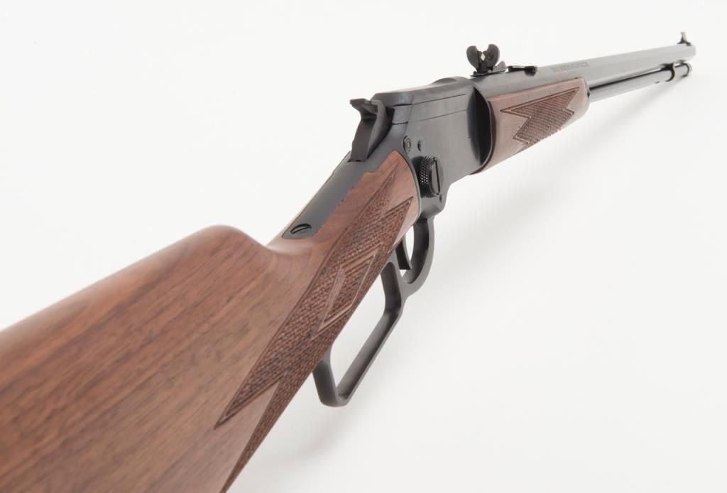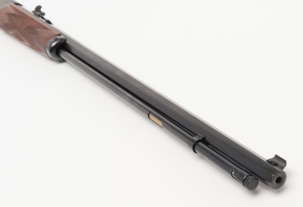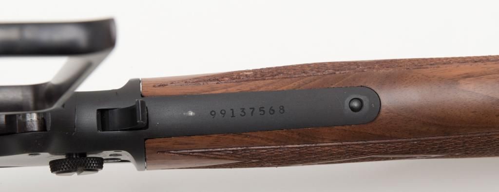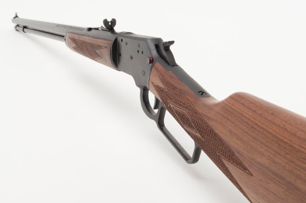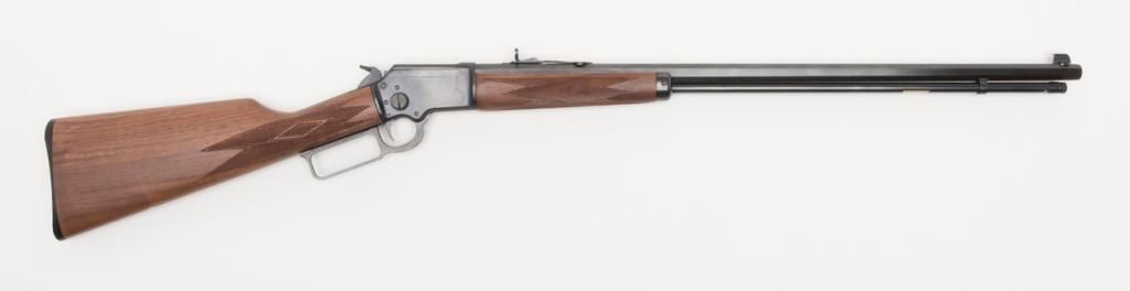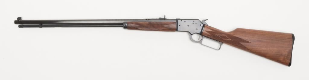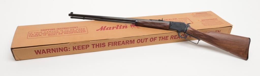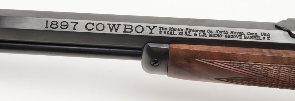 Marlin Model 1897 Cowboy lever action rifle, .22 short, long and LR cal., 24” octagon barrel, blue finish, checkered wood stocks, #99137568 in like new condition with factory cardboard box and insert. (Modern/PPT). Est.: $400-$800