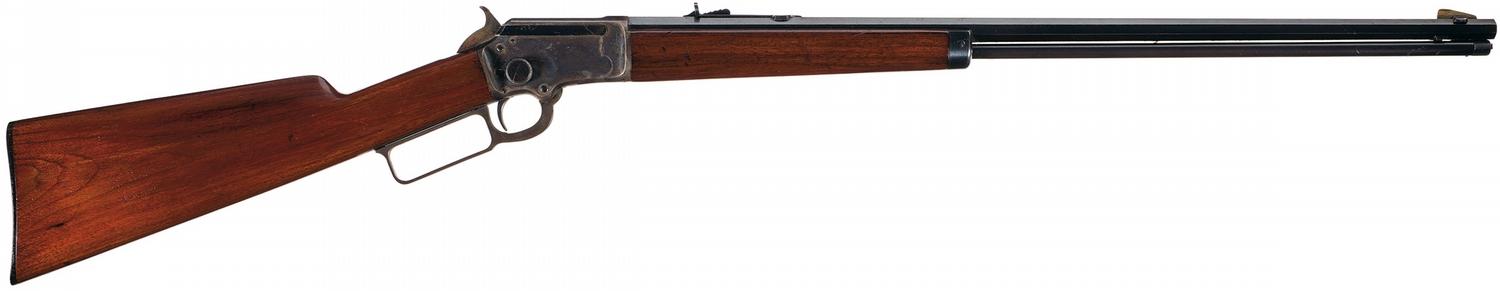 Manufactured from 1897 to 1917. German silver blade front and sporting type rear sights with top of receiver and upper tang drilled and tapped for sight mounting and full length magazine. Top barrel flat has the two line address/patent date marking and upper tang is marked "MARLIN / MODEL '97". Blue with casehardened takedown receiver, hammer, and lever. Smooth forearm and straight grip stock with iron forend cap and factory hard rubber buttplate.