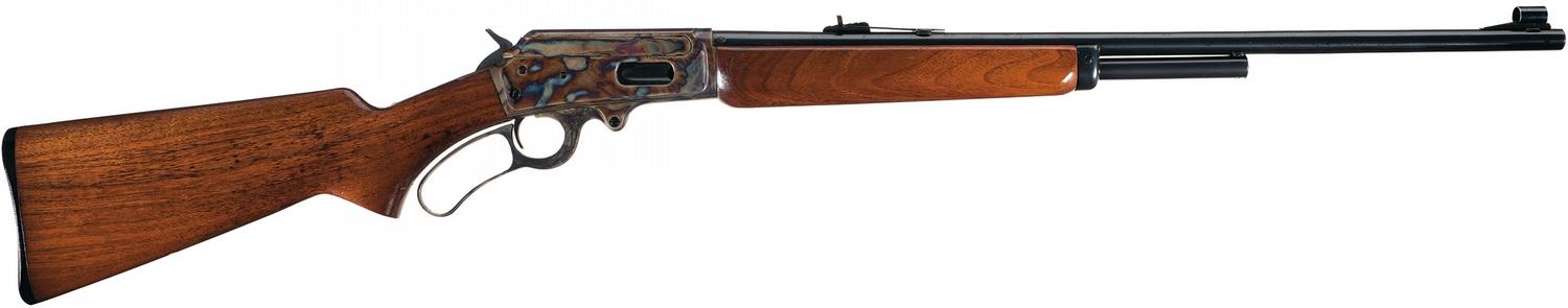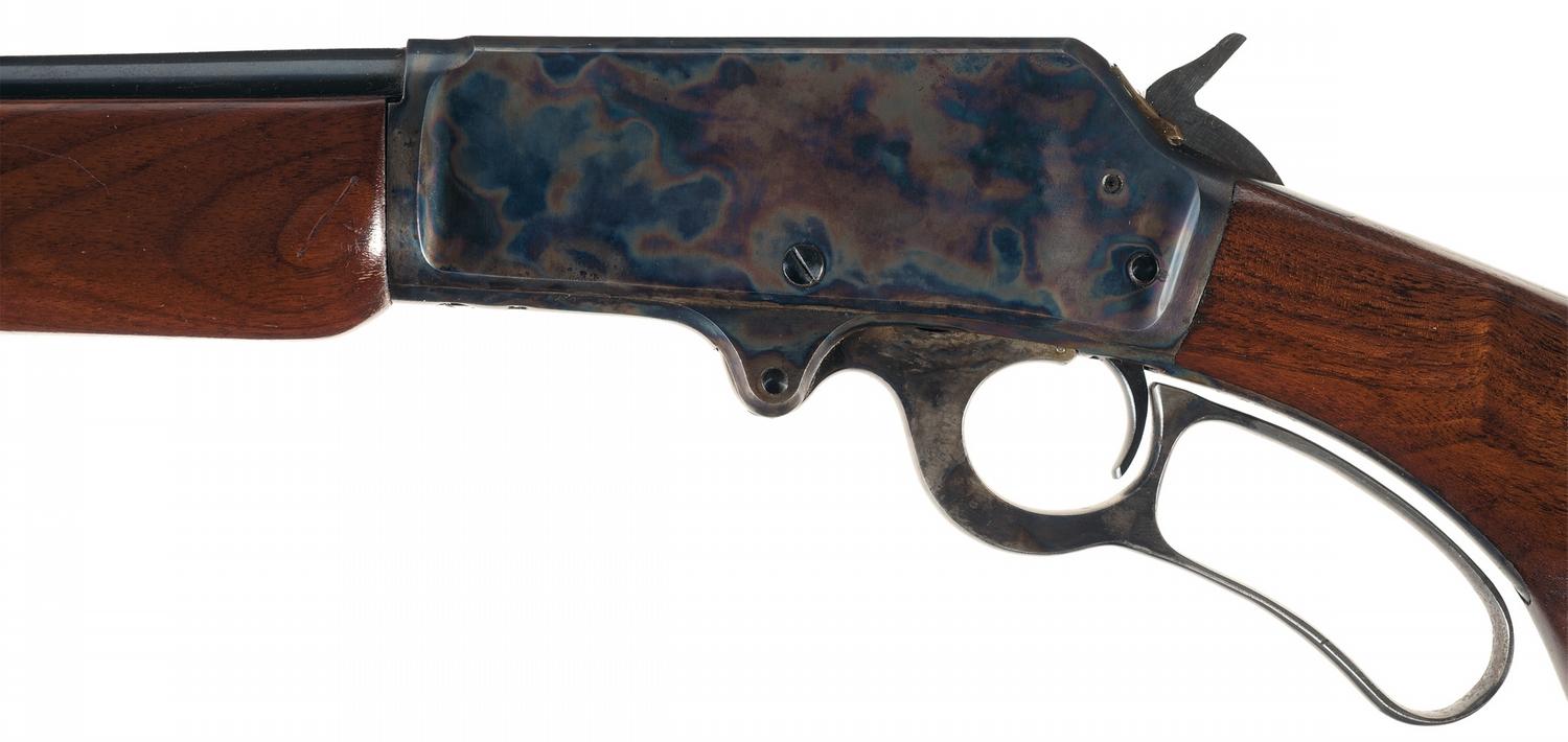 Condition: Excellent. The barrel and magazine retains nearly 97% original blue finish with some minor muzzle wear and some minor thinning along with some minor spotting. The receiver and lever retain 98% original vivid case colors. The lever retains 95% plus case colors. The wood is also excellent with most of the varnish remaining and some very scattered minor handling marks. The initials "JSC" are marked twice on buttplate.