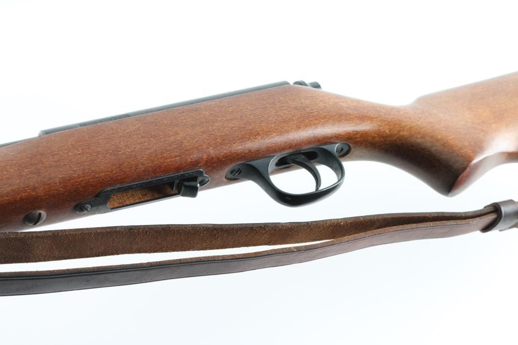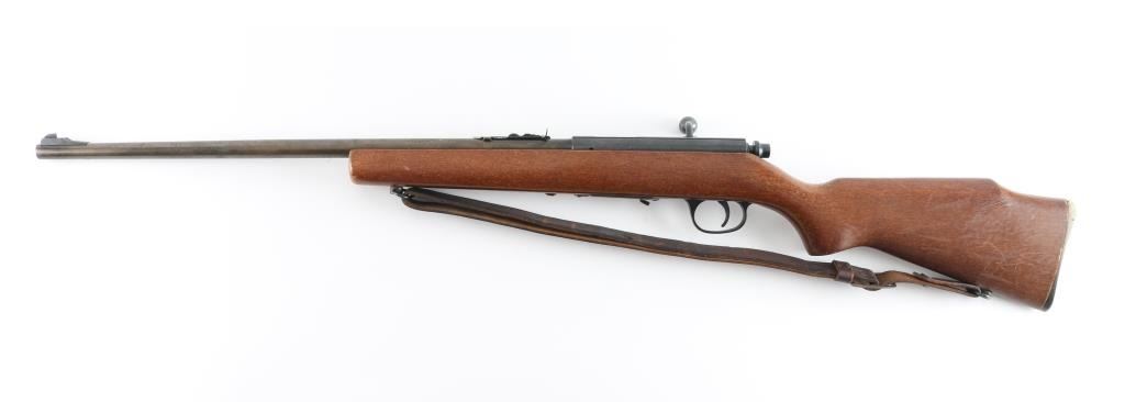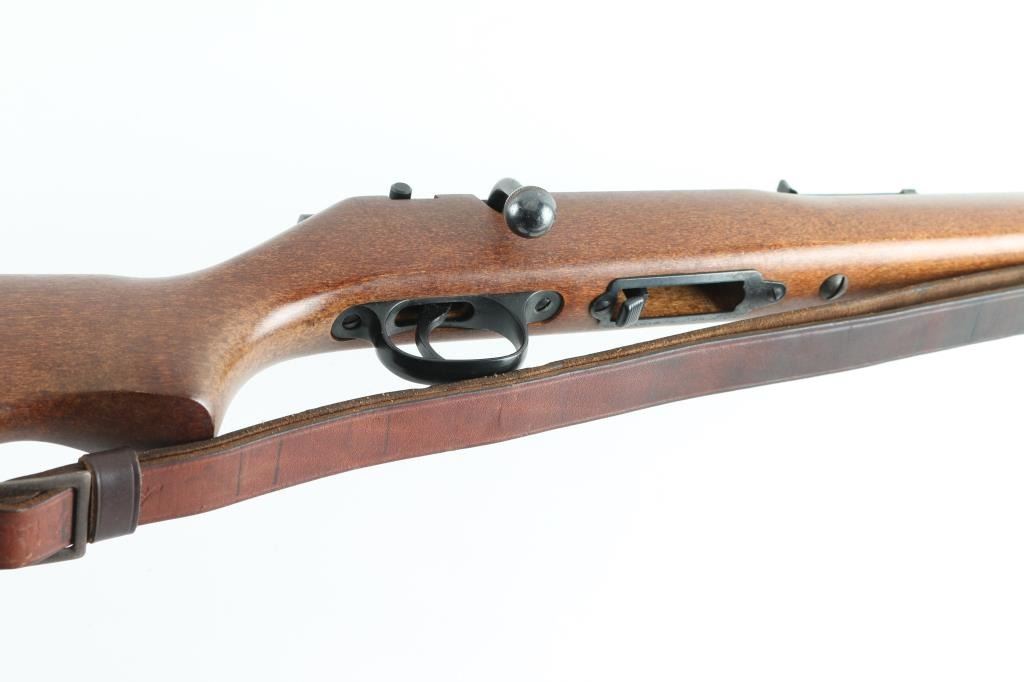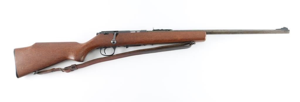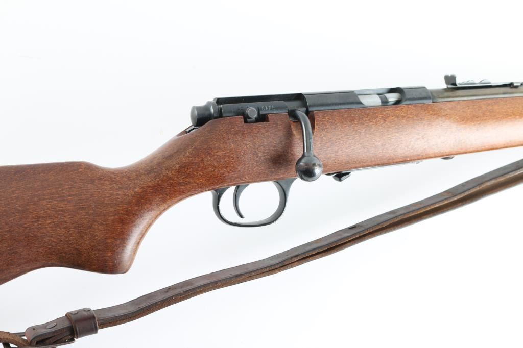 Bolt-Action rimfire chambered in .22 Mag. Fed from a box magazine (magazine missing) 22" barrel with sporting sights. Smooth walnut stock, black plastic buttplate, manual safety. Bore is very good, action is smooth, wood is sound with scratches, dings. Buttplate has some discoloration, blue is about 40%, with the barrel turning a gray patina. Brown leather sling attached. NRA Condition-Good/Missing Magazine. Modern Firearm.