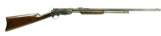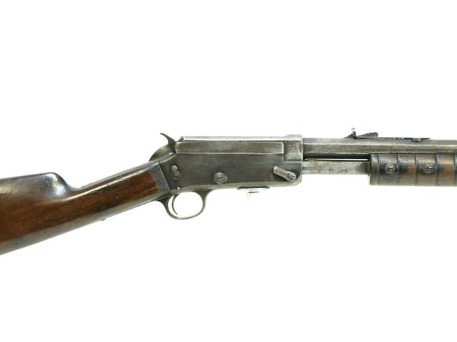 Marlin Model 27-S 25.20 Cal. NVSN pump action rifle with 24" barrel and walnut stocks. Rifle shows gray brown patina overall with light areas of scattered pin prick pitting. Action very good, bore fair. Manufactured 1910-1922 FFL required,