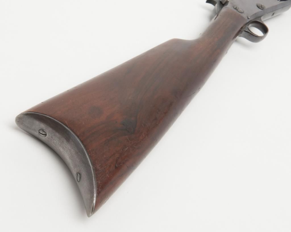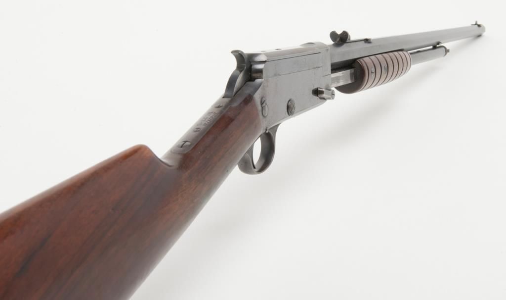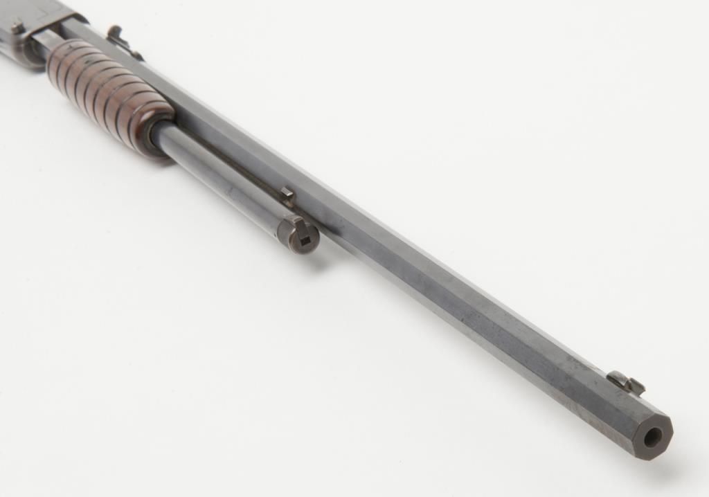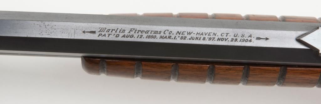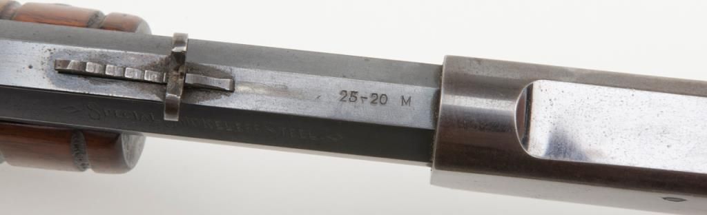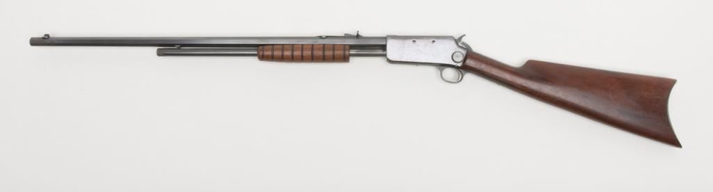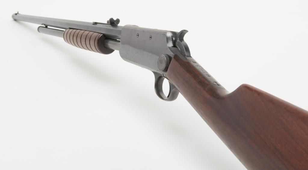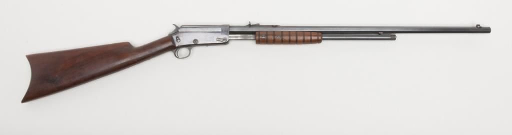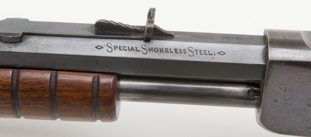 Marlin Model 27-S slide action takedown rifle, 25-20 caliber, Serial #NSNV. The rifle is in overall fine condition with a 22” blued, octagonal barrel, marked “Special Smokeless Steel”. The barrel and receiver retain nearly all of theirblued finish with some slight freckling and edge wear. The smooth wood stocks are in overall very good condition with small mars consistent with storage. The action has been drilled and tapped for both a top mount scope and side mount. Thetang is marked, “Marlin No. 27-S”. The bore is very good, action crisp and marking sharp on this Marlin takedown. (C+R/PPT). Est.: $400-$800.