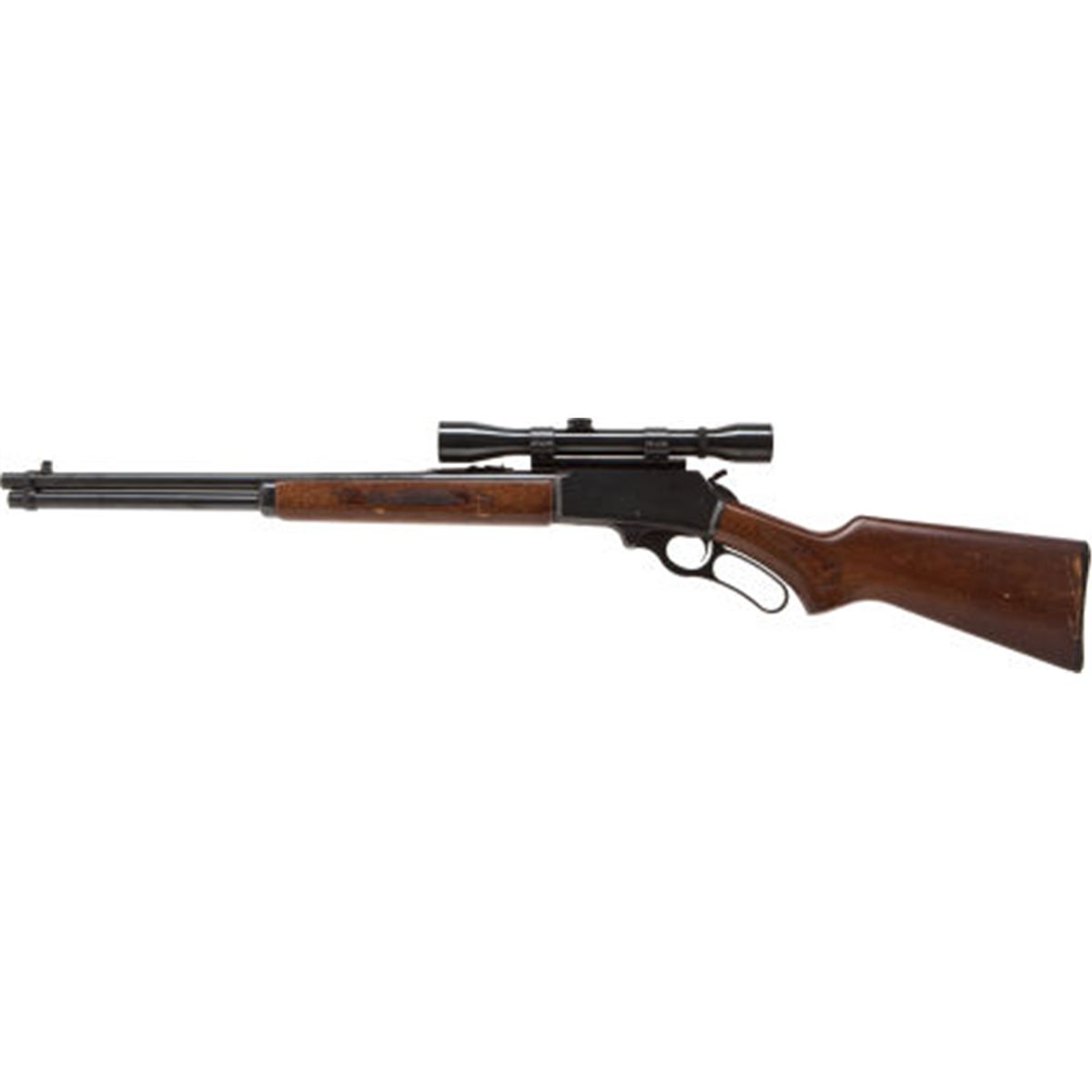 Marlin Model 30A Glenfield Lever Action Carbine with Telescopic Sight. Serial no. 21091481, .30-30 caliber, 20-inch barrel with standard sights. Mounted with Weaver Marksman telescopic sight. Blued finish. Side-mounted hammer shoe. Varnished press-checkered pistol-grip stock and fore-end. Condition: Very good. Retaining approximately 95-98% finish with minor wear and scratches present. Wood with minor wear and light marks. Action good.NRA FIREARMS FOR FREEDOM PROGRAM