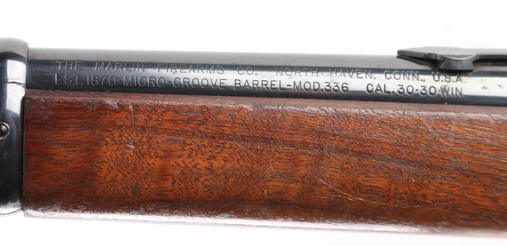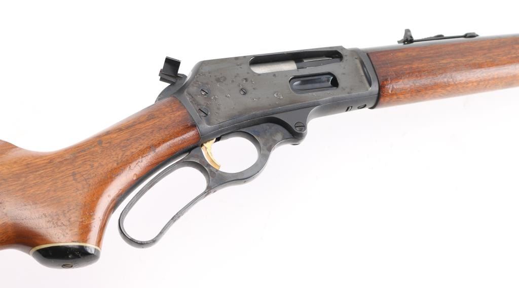 Lever action rifle. Features 20" barrel, hooded ramped blade/bead front sight, buckhorn rear sight, full length tube magazine under barrel, black plastic grip cap and buttplate with white line spacers, smooth faced gold accent trigger, serrated hammer spur with added side extension, curved finger lever. Receiver is drilled/tapped, no filler screws. Bore is very good condition. Retains about 90% blued finish, with minor scratches. The receiver & lever have scattered spots of pin-prick pitting. Smooth walnut stock & forend are very good condition with scratches and small dents. Condition is NRA Good. Modern Firearm.
