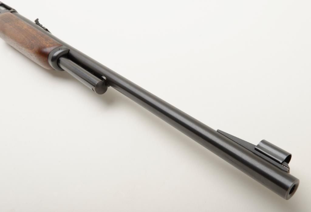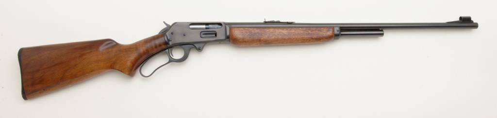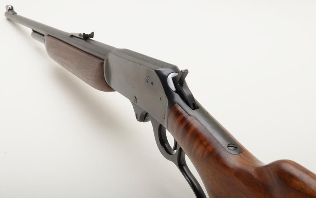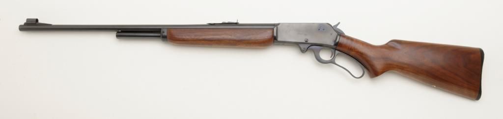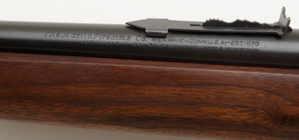 Marlin Model 336-A, lever action rifle in .30-30 caliber showing a excellent restoration and remaining in very good plus to near fine condition as restored, serial number 29431. The rifle shows factory 24” round barrel, half magazine, large fore end and retains its original Marlin butt plate. The stock is in fine to near excellent near perfectly restored condition. The action is good, the bore is very good plus and looks like it would clean to excellent. Est.: $250-$500