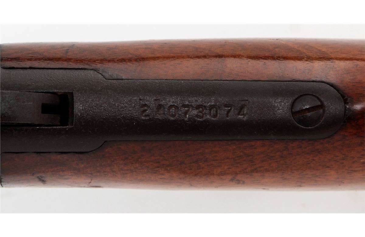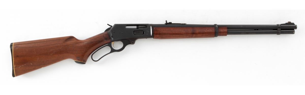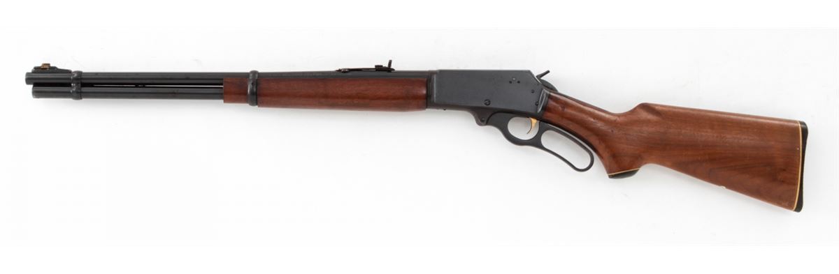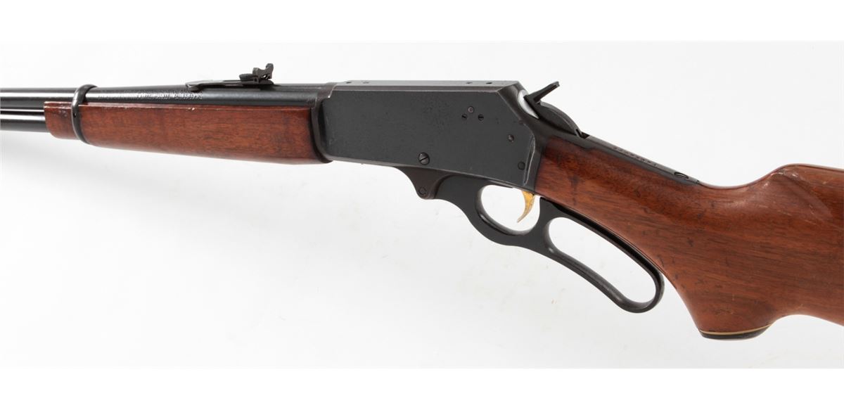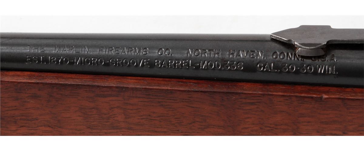 Marlin Model 336 Lever Action Rifle, #24073074, .30-30 cal., 20'' barrel, blue finish, walnut stock and forend, with gold trigger. Condition is very good to fine showing light to moderate field use, retaining approx. 92% toning blue. Stock with scuffs and nicks. Good action, bright bore. Est.: $400-$600. (Modern)