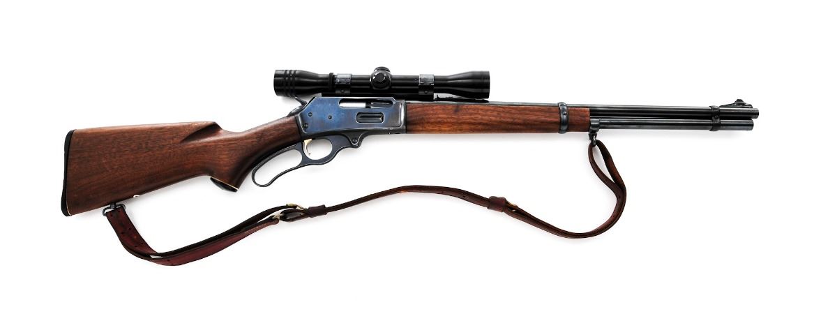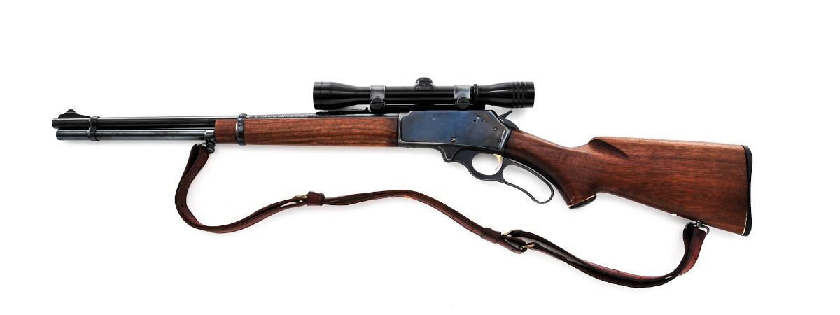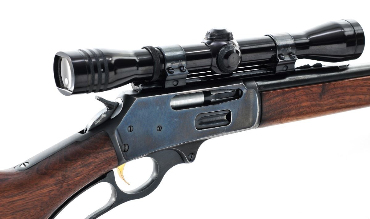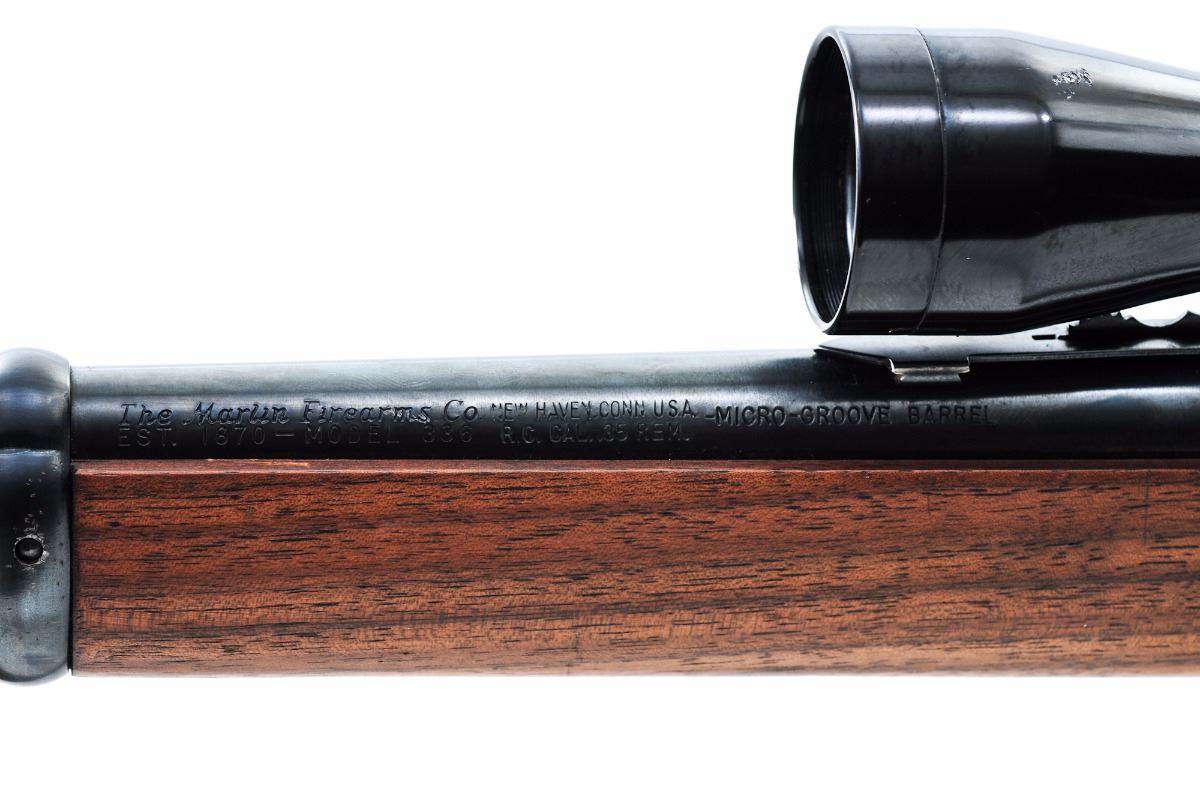 Marlin Model 336 Lever Action Rifle, #V21809, .35 Rem. cal., 20'' micro-groove barrel, blue finish, pistol-grip walnut stock and forend, decorative black pistol grip cap, factory black checkered Marlin buttplate, gold-plated trigger, with sling swivels and leather Hunter sling; standard original sights, as well as being topped with a Redfield 4x scope on one-piece base with Weaver rings. Condition is very good retaining approx. 80%-85% blue with wear to the high edges, as well as moderate scratches to the barrel and tube. Stock with marks and impressions from field use. White spacer to both the buttplate and grip cap are slightly undersized. Action is crisp, bore is fine. Est.: $300-$500. (C&R)