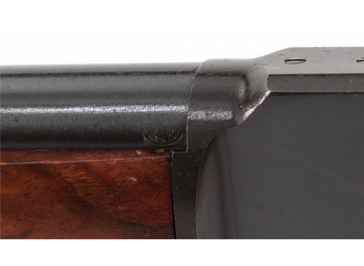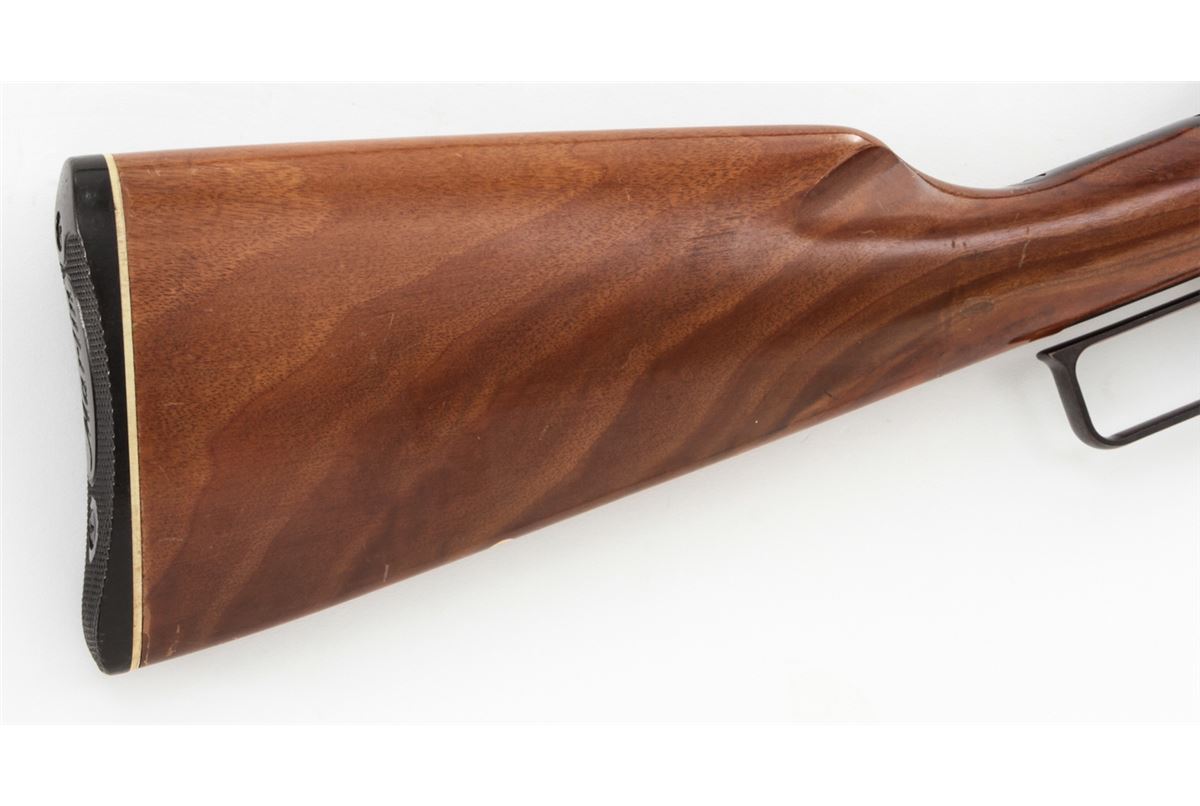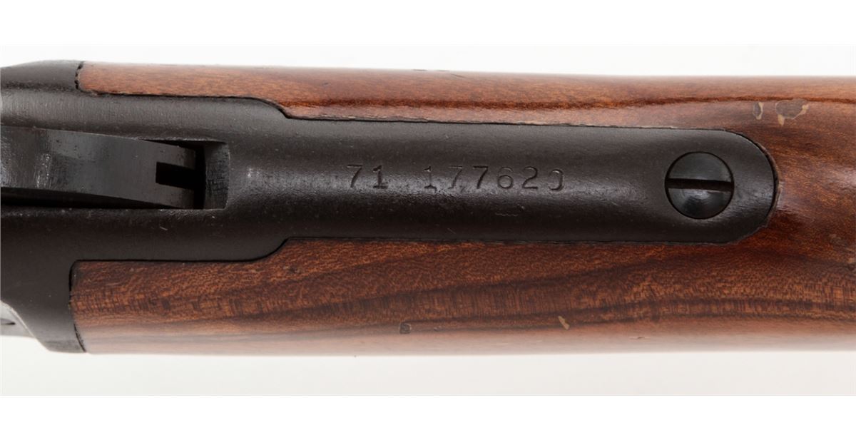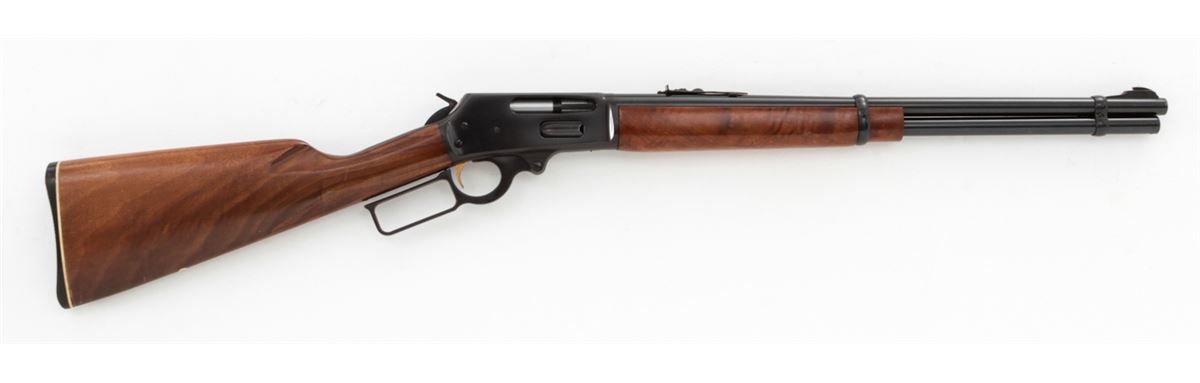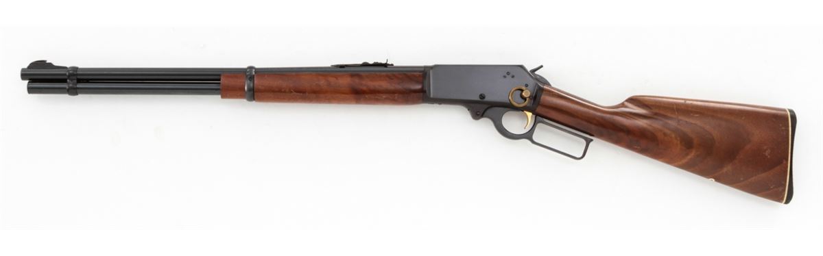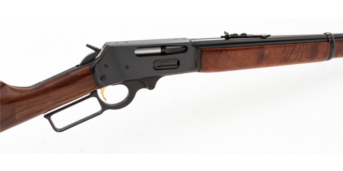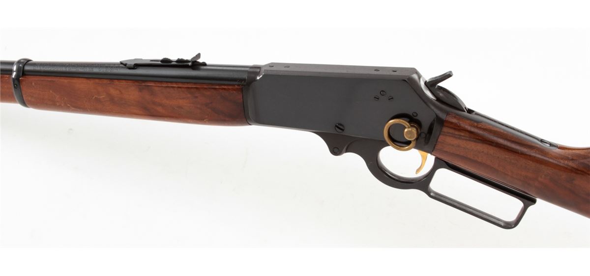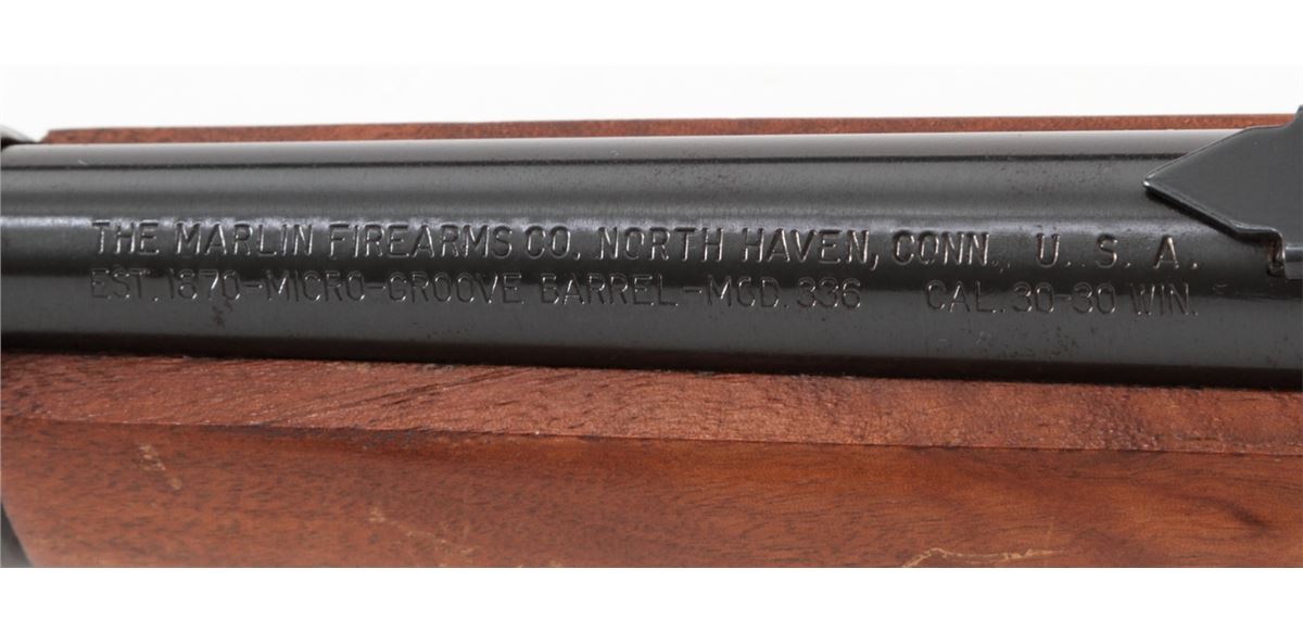 Marlin Model 336 Lever Action Saddlering Carbine, #71177620, .30-30 cal., 20'' barrel, blue finish, smooth walnut stock and forend, with gold saddlering and trigger. Condition is about fine retaining approx. 97% blue with some light scratching to flat surfaces. Stock shows field use with light to moderate scratching and minor finish loss. Crisp action, fine micro-groove bore. Est.: $300-$500. (Modern)