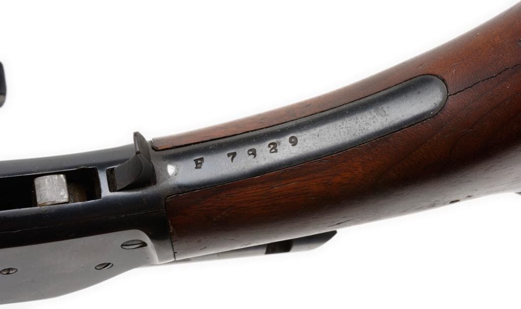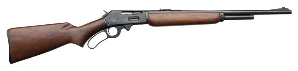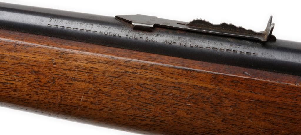 *Marlin Model 336 SC lever action carbine, 30-30 cal., serial #F7829. The carbine is in overall very good condition with a 20” round barrel with a ramp front and adjustable rear sights and ½ magazine. The barrel and magazine retain nearly all of their blued finish with only small scratches and a loss of finish at the muzzle. The receiver retains the majority of its blue with light dsurface rust and erosion present on the right side. The smooth wood stocks are in overall very good condition with small mars and compressions consistent with use. The buttstock ends with a hard plastic, Marlin marked butt plate. The bore is very good, the action crisp and markings sharp on this Marlin Sporting Carbine Model. Est.: $400-$600.