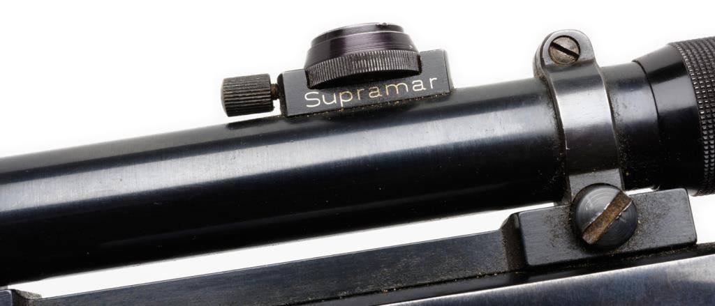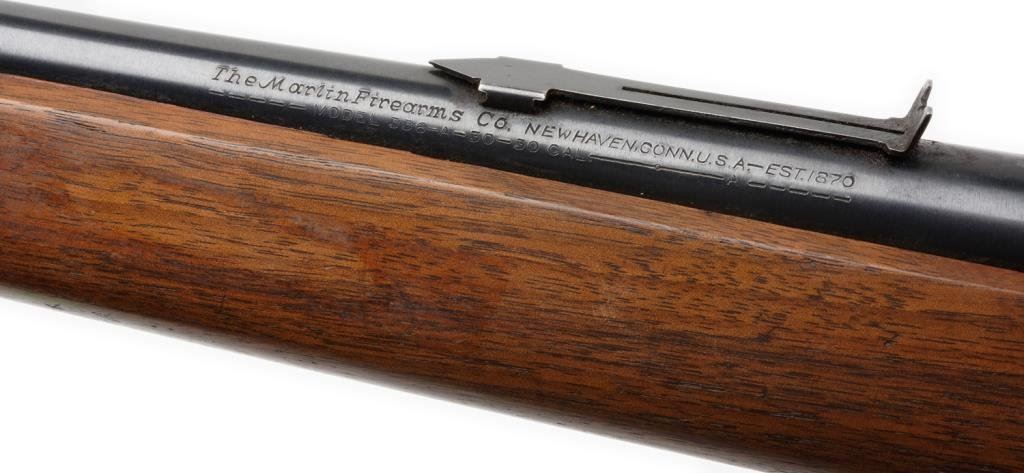 *Marlin Model 336A lever action rifle, 30-30 cal., serial #G41286. The rifle is in overall very good condition with a 24” round barrel, ½ magazine, ramp front and adjustable rear sights. The rear sight is missing the elevator at the time of description. The barrel and receiver retain the majority of their blued finish with some loss of finish at the muzzle. The smooth wood stocks are in overall very good condition showing tape residue on the fore end and buttstock. The stock ends with a hard plastic Marlin marked butt plate. The bore is very good, the action crisp and markings are sharp. The rifle is topped with a one-piece Redfield mount and a quality “Supramar” by “B. Nickel” 2 ½ x 52 fixed power scope with post and crosshair reticle. Est.: $400-$600.