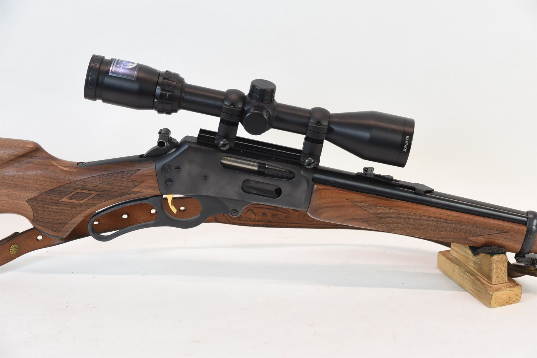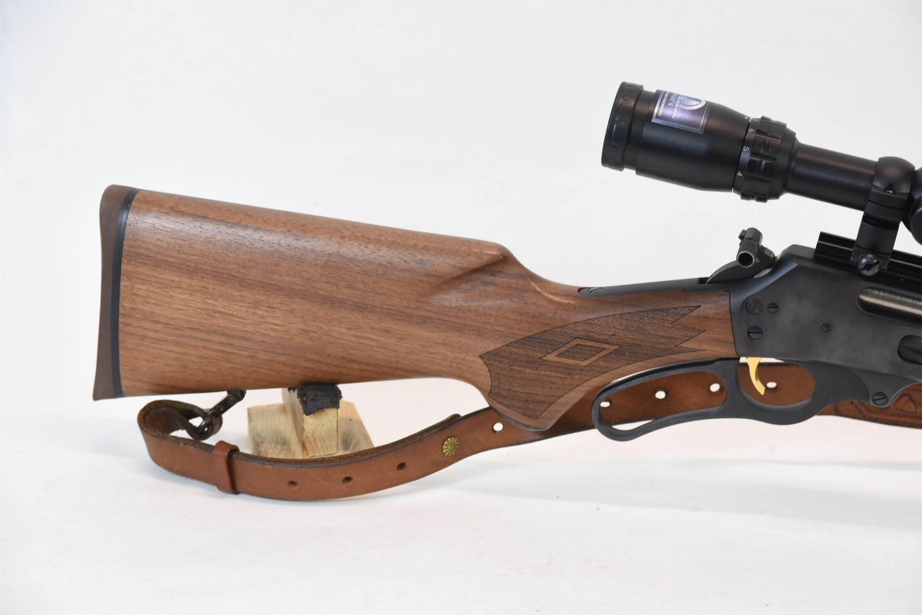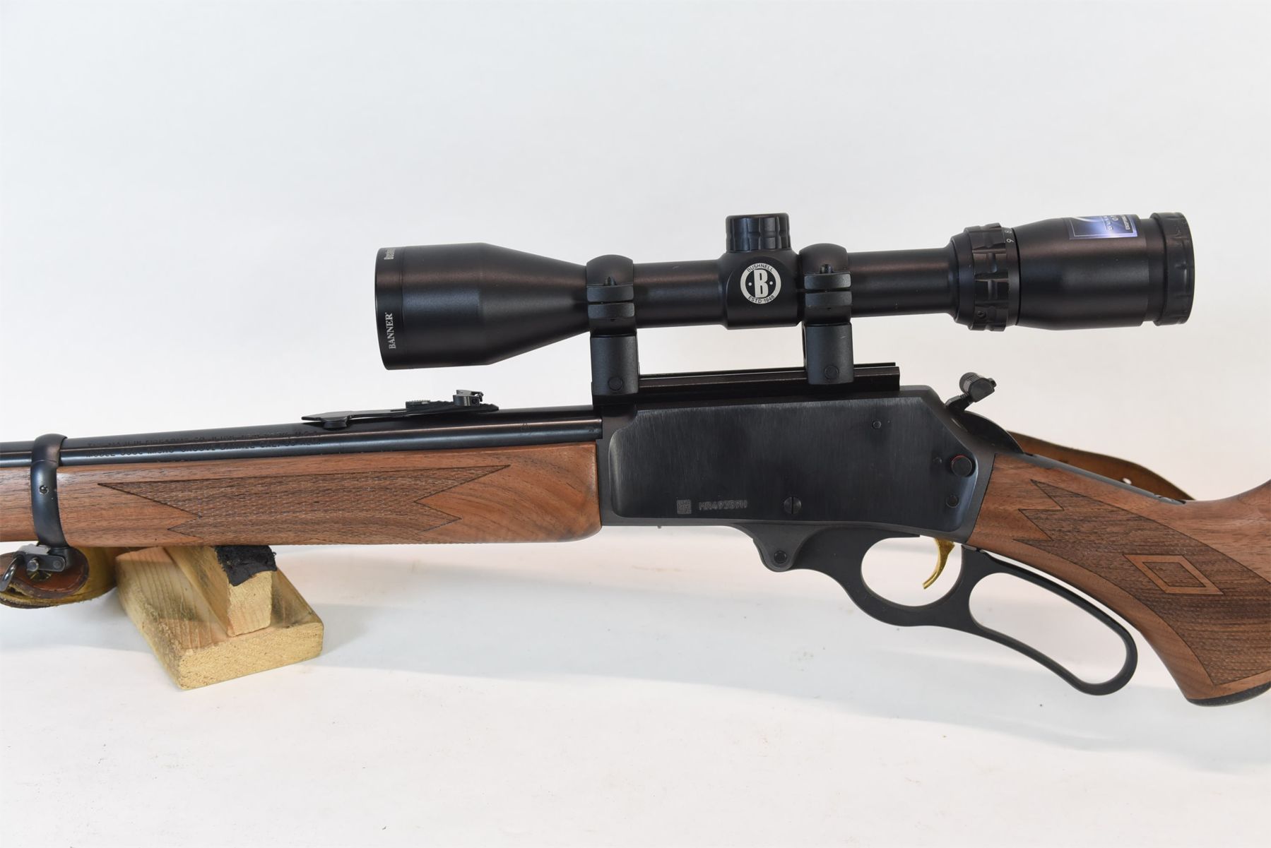 The wood has just a very few very light marks on the butt stock. The bluing is near excellent. The bore is excellent. Has a leather sling and hammer extension.