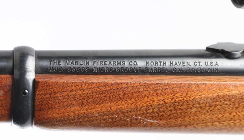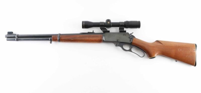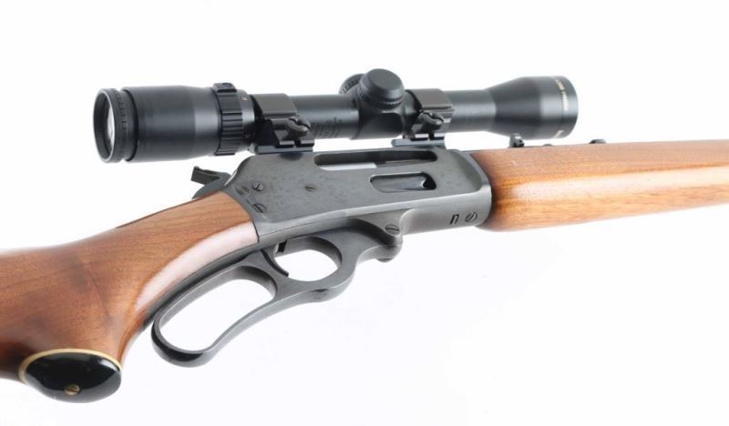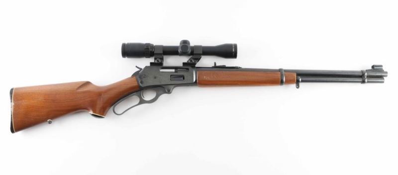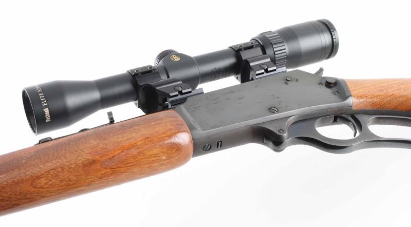 Lever action rifle features blued finish, smooth wood forend and shoulder stock, curved wrist & finger lever, 20" barrel, hooded ramp front sight, folding buckhorn rear sight, two piece Weaver scope base on receiver, full length tube magazine under barrel, black plastic grip cap & buttplate with white line spacers, sling studs, cross bolt safety in receiver. Bore is very good condition. Retains 80% blued finish, with scratches and scrapes, bare metal showing on sharp edges, light scattered patina on right side of action and rear portion of barrel. Wood is good or better condition, with scratches & shallow gouges, paint transfer rubs on butt. Mounts a very good condition (some scratches, dings to edge of objective lens) Bushnell Elite 3200 Firefly 2-7x scope with clear view, stepped thickness crosshair reticle. Condition is NRA Good++ *** Modern Firearm ***