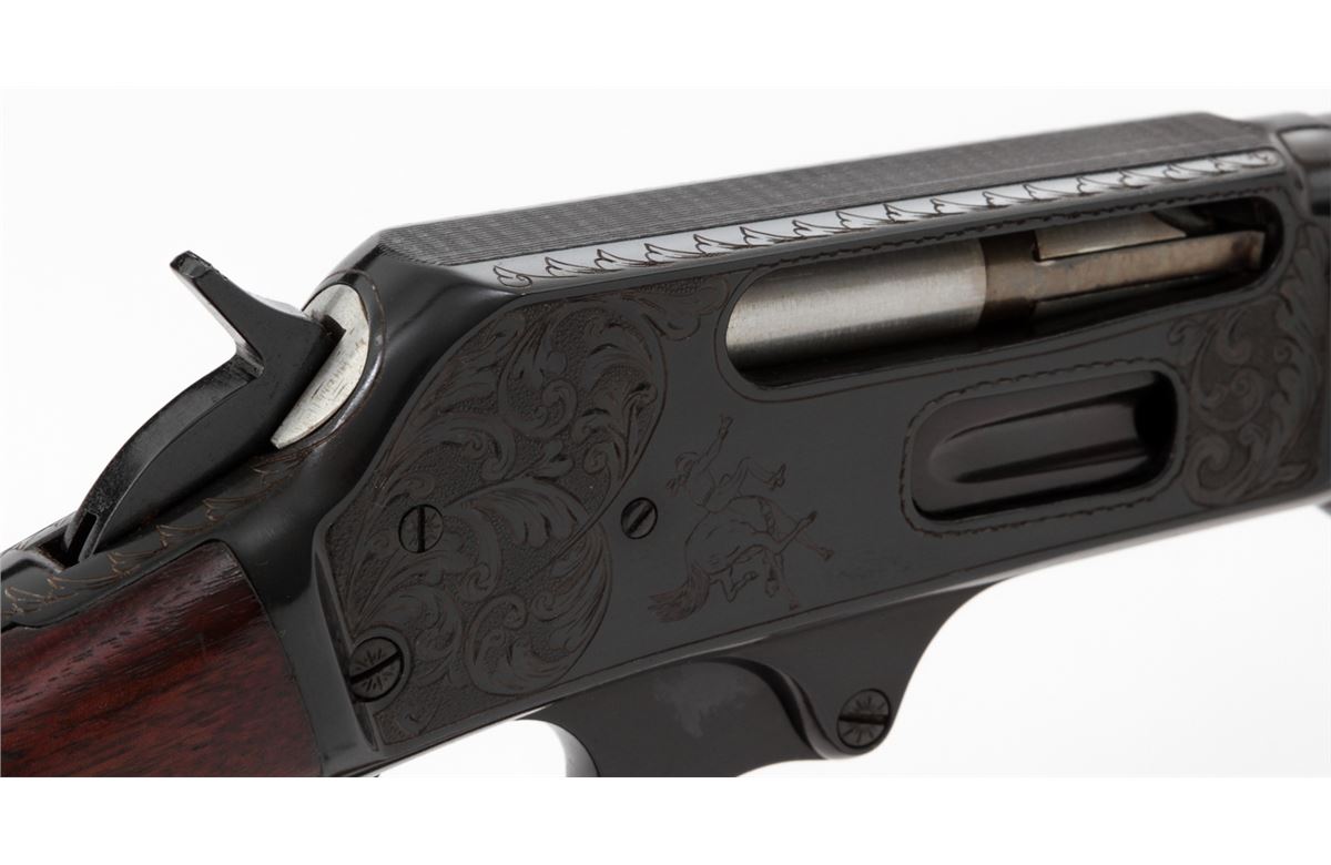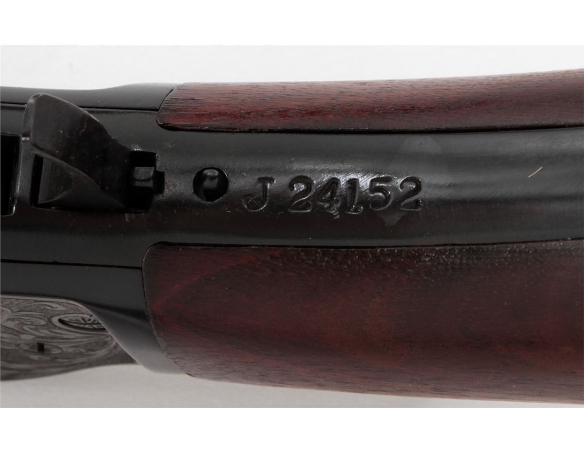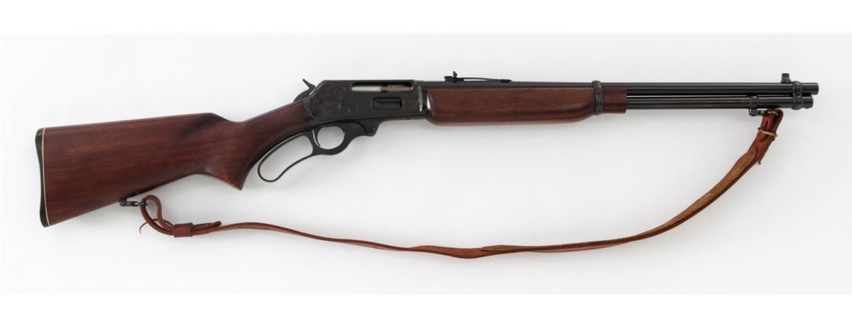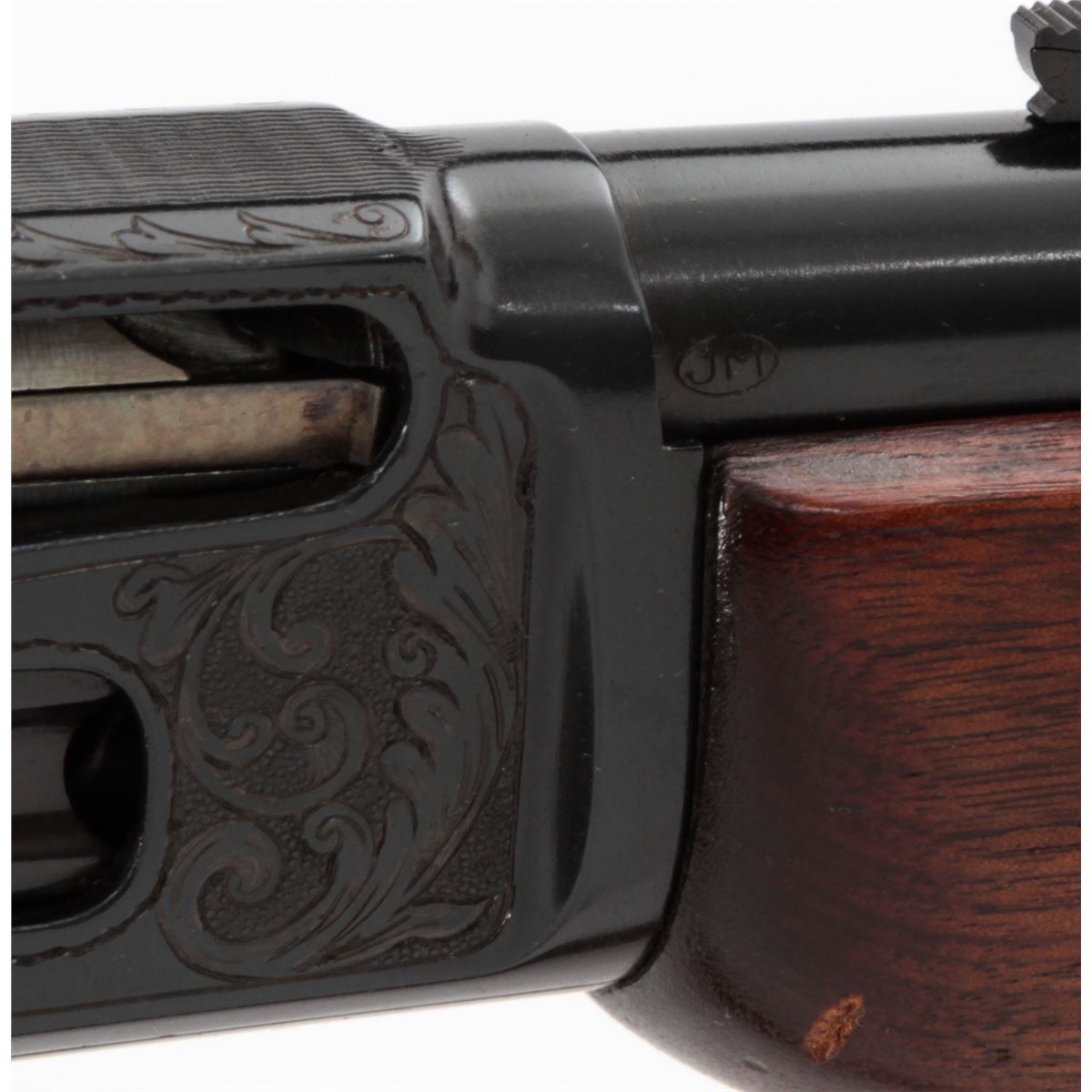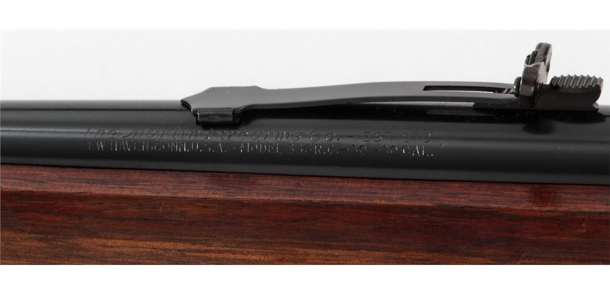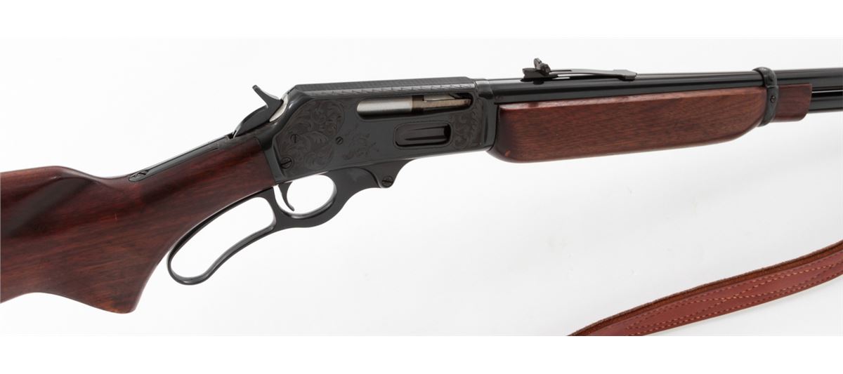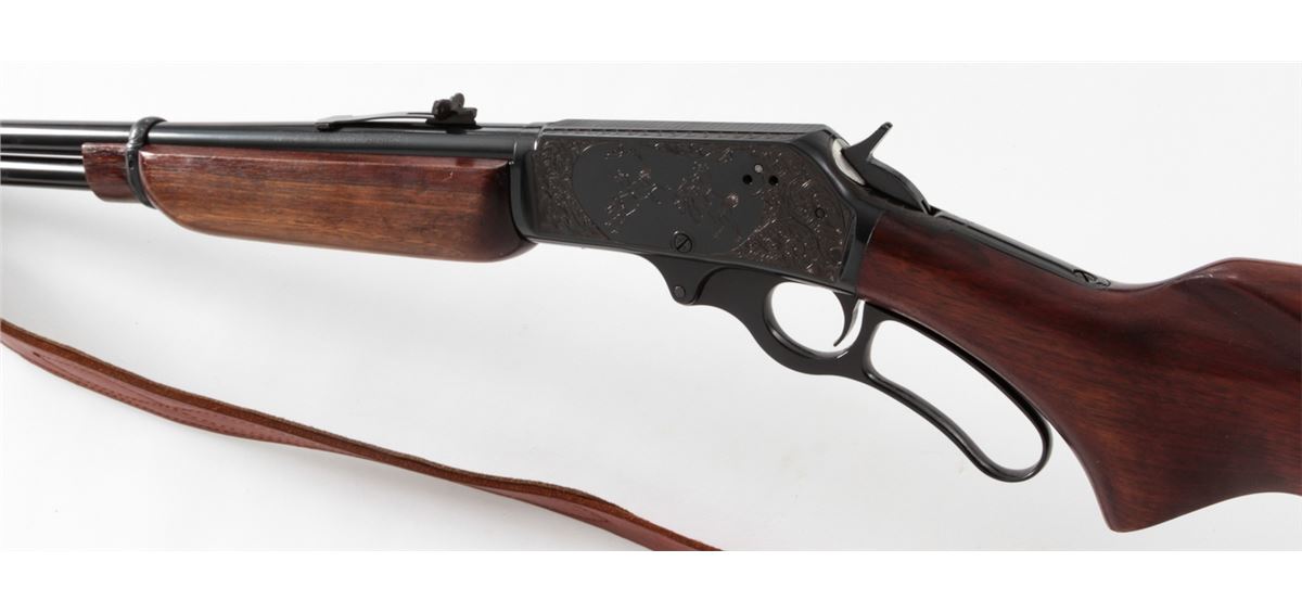 Marlin Model 336RC Lever Action Rifle, #J24152, .30-30 cal., 20'' barrel, blue finish, walnut stock, with leather sling. Nicely engraved with scroll scenes and cowboys on bucking broncos. Condition is excellent as later engraved and refinished, retaining approx. 97% blue. Stock with light dings and scuffs. Action is crisp, bore is excellent. Est.: $400-$600. (C&R)