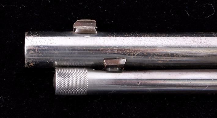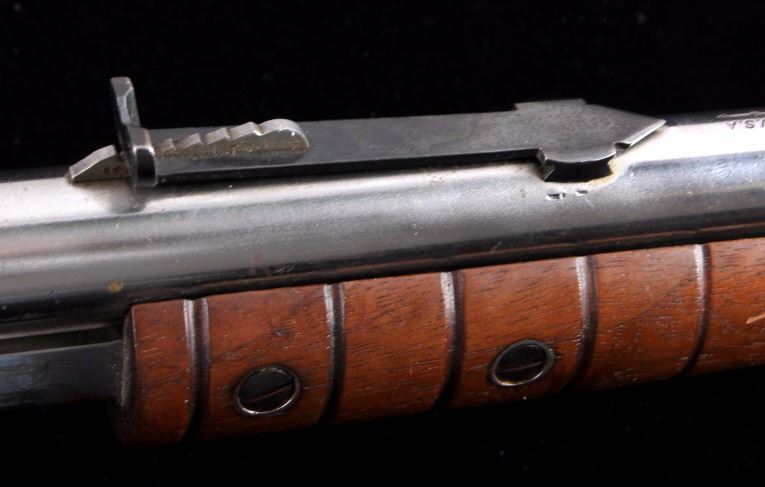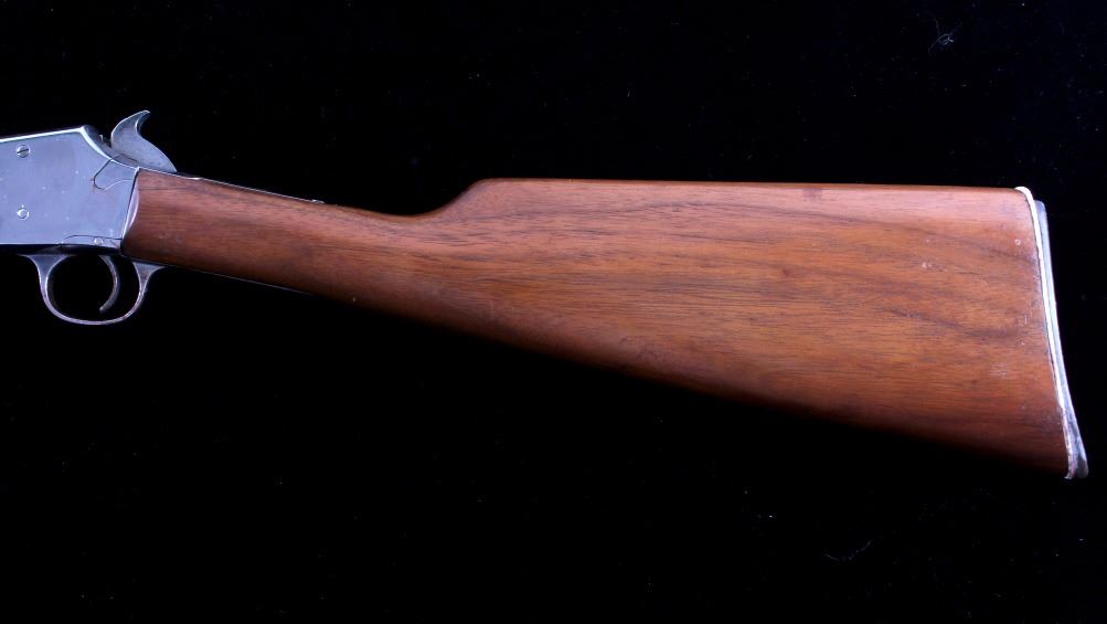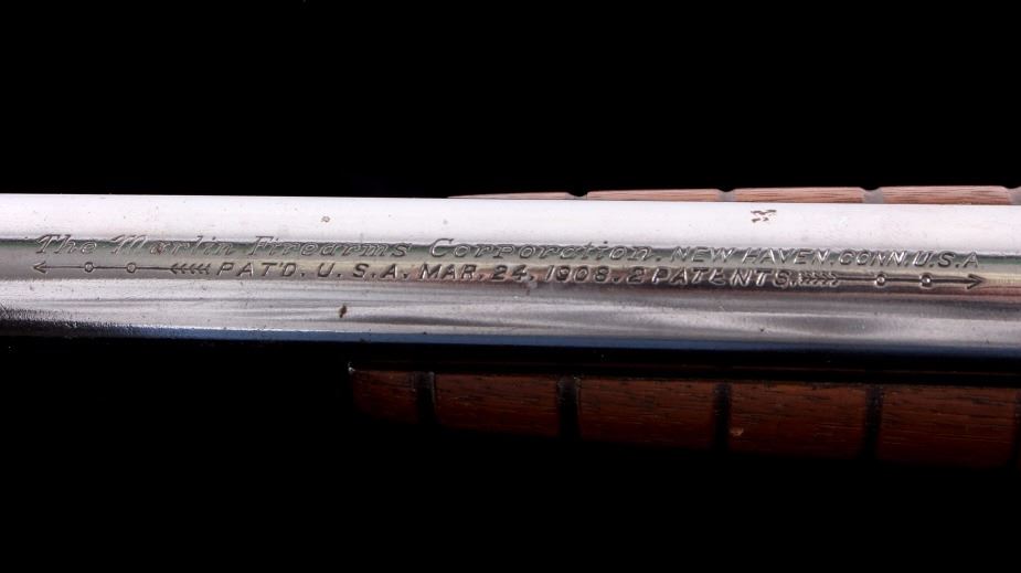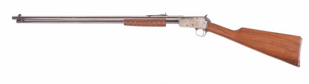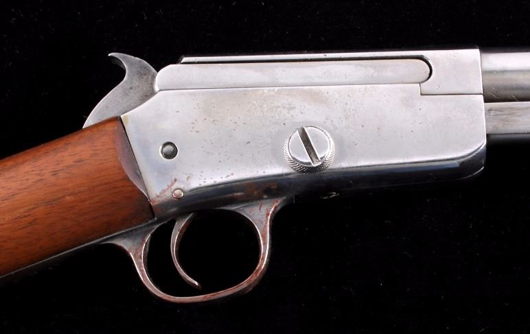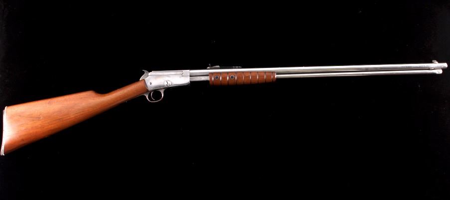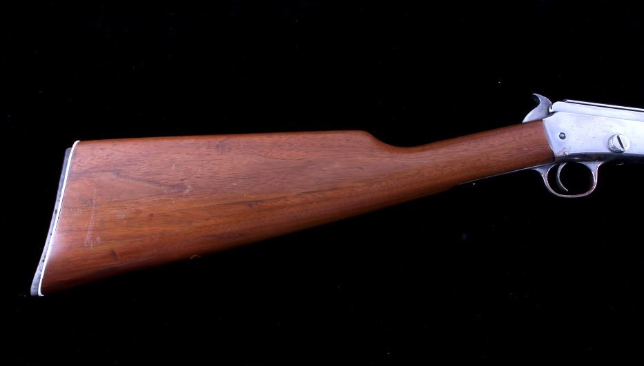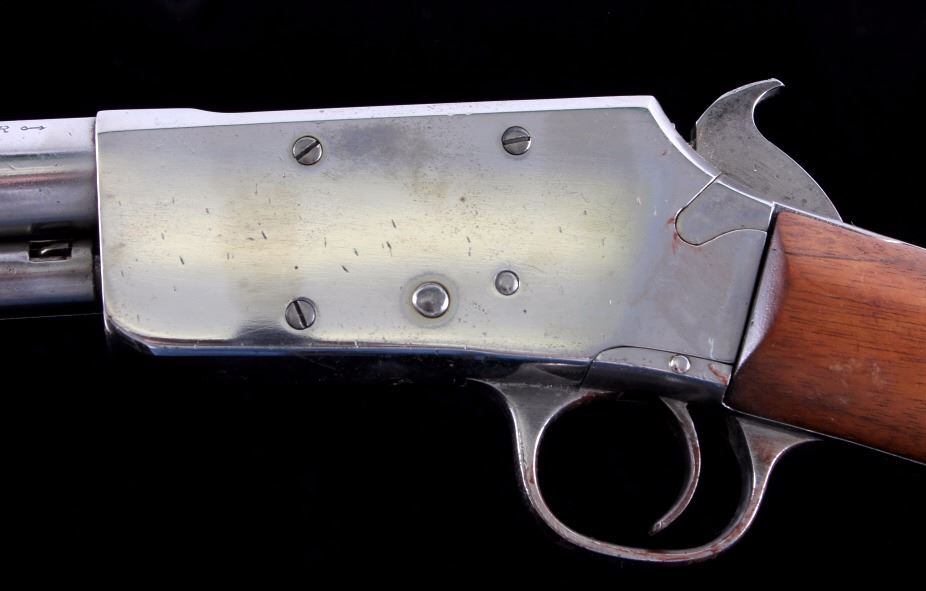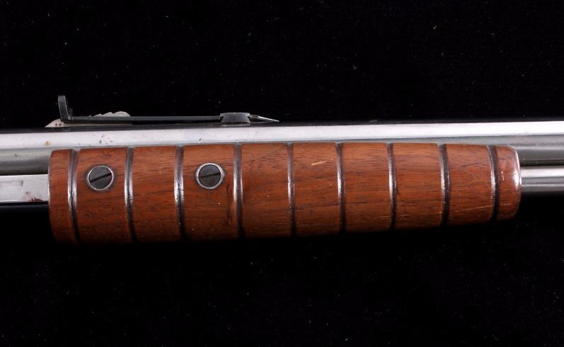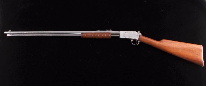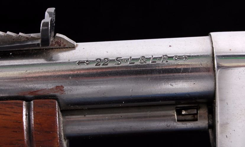 This is a Marlin Firearms Co. Model 37 slide pump action rifle in a 22 short, long, or long rifle caliber. This is a wonderful scarce slide action rifle with a serial number of 508 and was manufactured from 1913-1916. The rifle features a 24 inch round barrel and is the exceedingly rare original nickel finish with walnut stock. The barrel is marked "The Marlin Firearms Corporation. New Haven, Conn. U.S.A." and "22 S L & LR". The tang is marked "Marlin Mod. 37". The nickel finish is believed to be original and very rare with no other examples currently available for sale. Curio & Relic Long Gun FFL Transfer or NICS Background required.