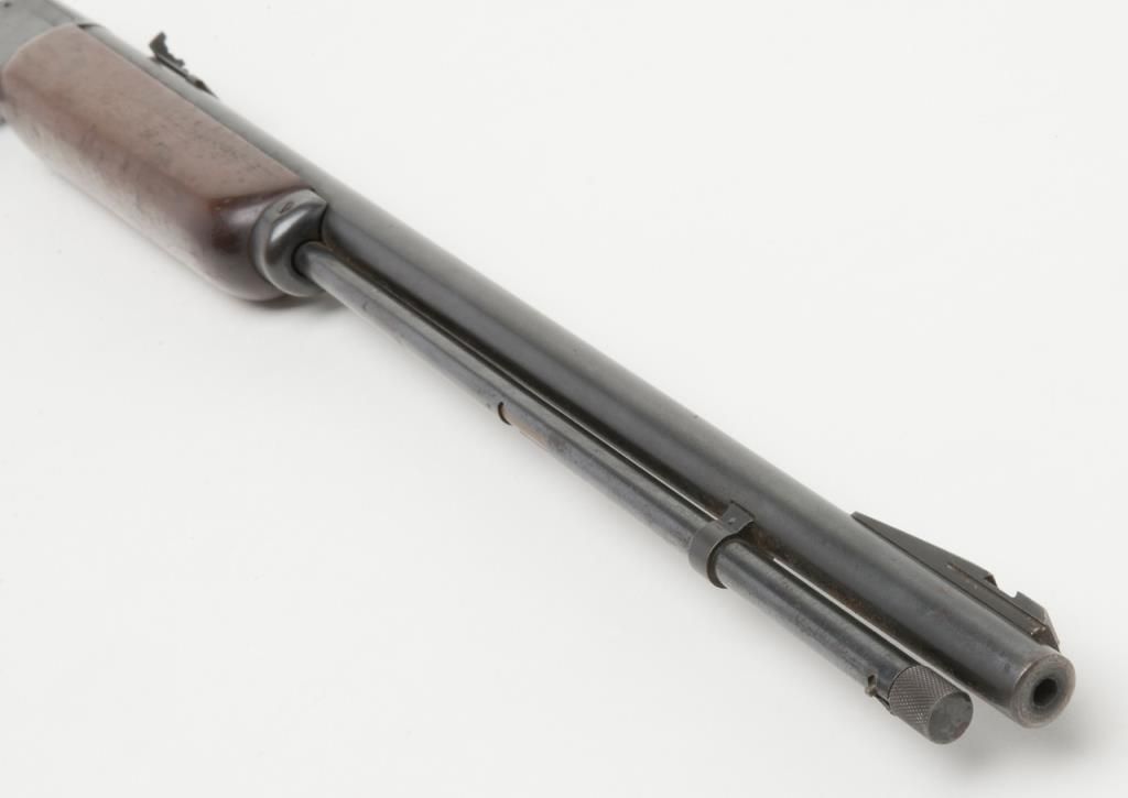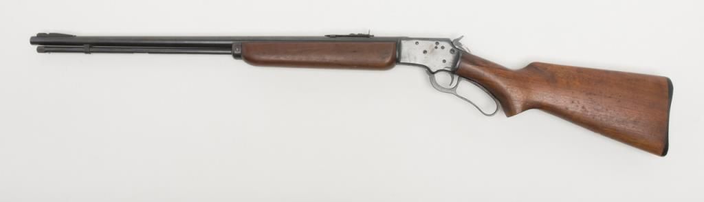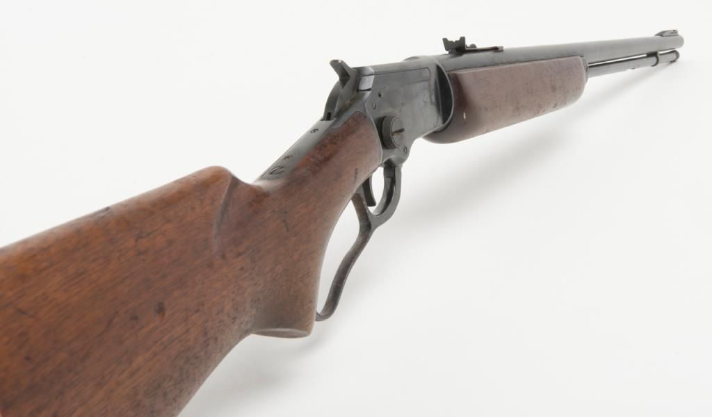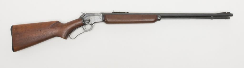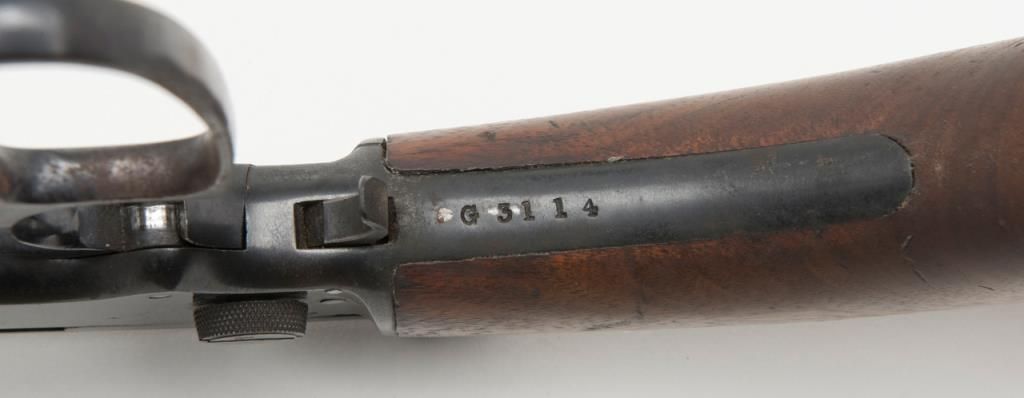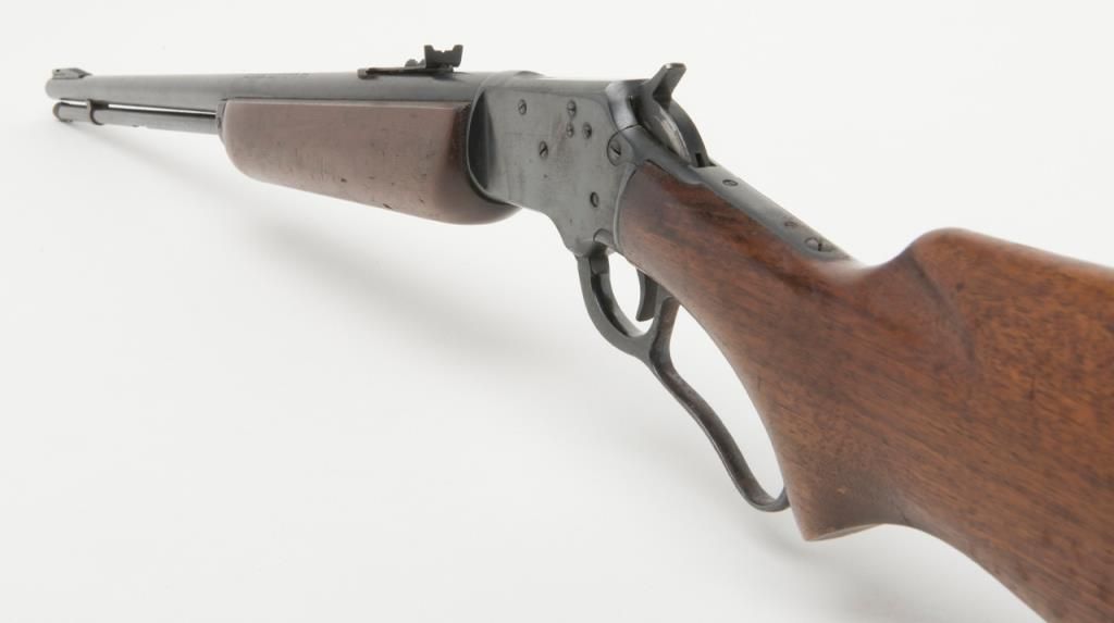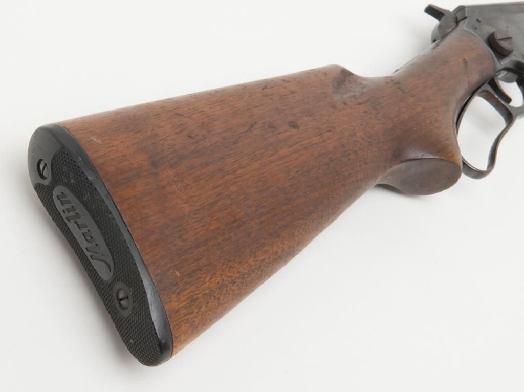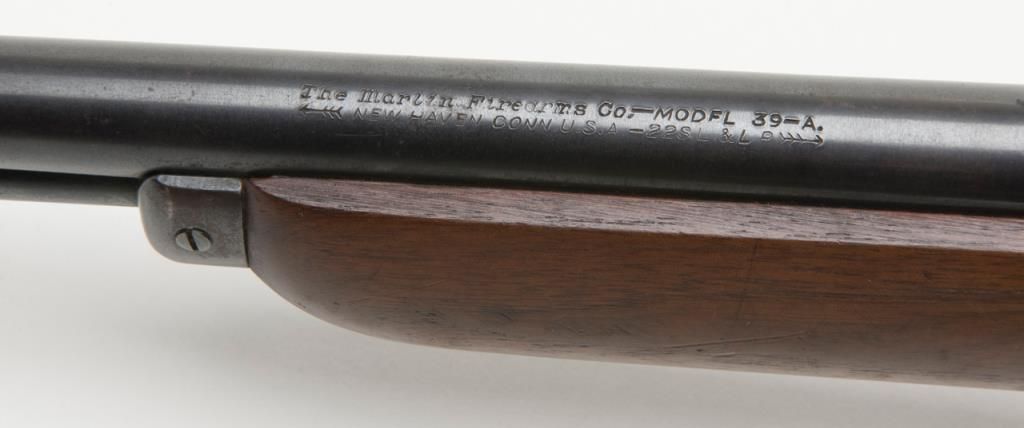 Marlin Model 39-A lever action takedown rifle, .22 Short, Long or Long Rifle caliber, Serial #G3114. The rifle is in overall good to very good condition with a 24” blued barrel, missing its front sight from the dovetail. The barrel andaction retain the majority of their blued finish. The barrel shows some freckling, while the action shows slight surface erosion and the lever moderate surface rust. The smooth wood stocks are in good condition with mars and compressionsconsistent with use and a hard rubber Marlin marked buttplate. The bore is good, action crisp and markings sharp on this Marlin. (Modern/PPT). Est.: $175-$350.