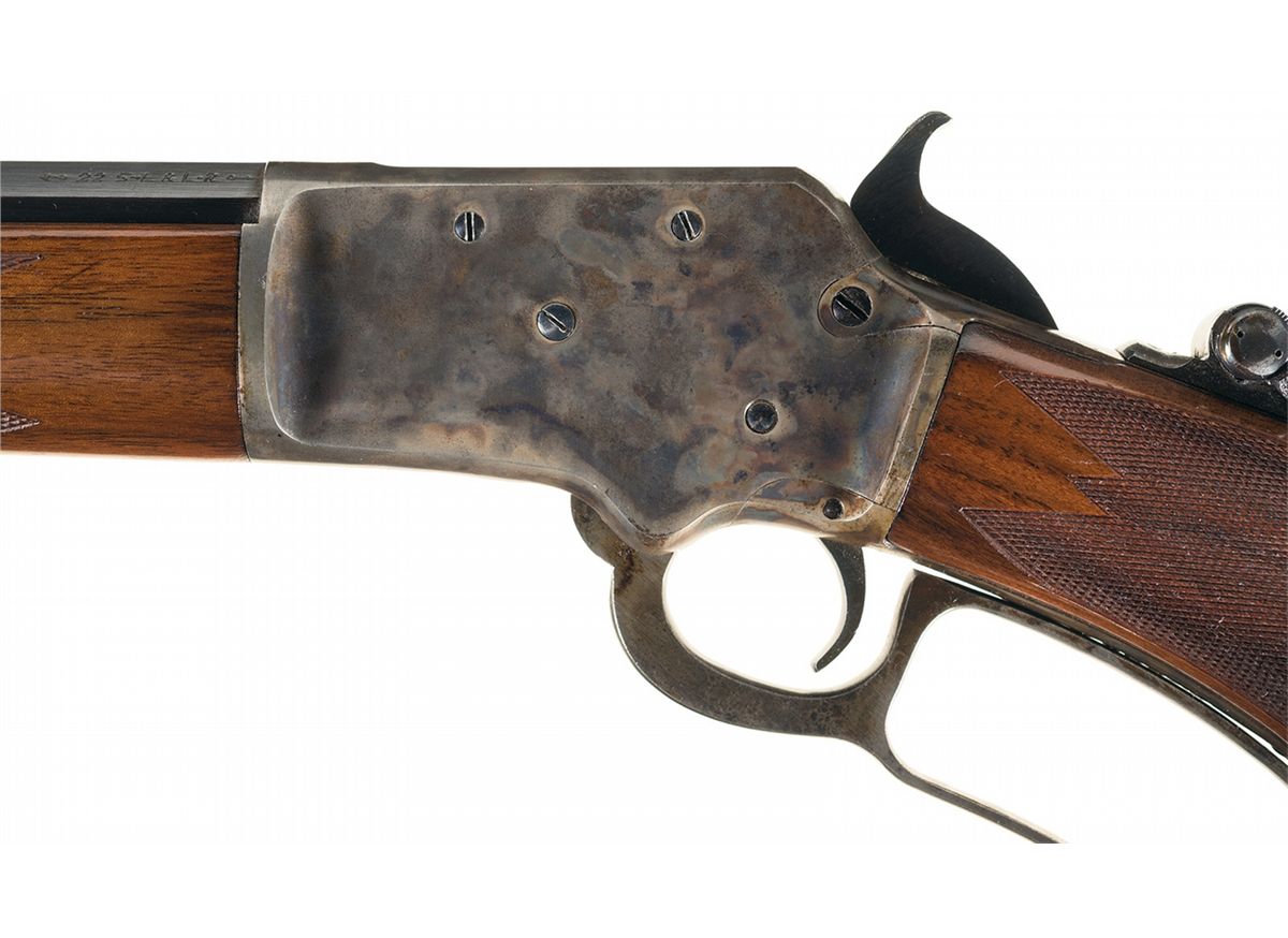 Very fine, 90% of the original blue finish remains with some scattered minor scratches, dings and wear. 70% of the original faded case colors remain with some areas still bright. The refinished and custom checkered wood is very fine with scattered minor scratches, dings and wear. Mechanically excellent.