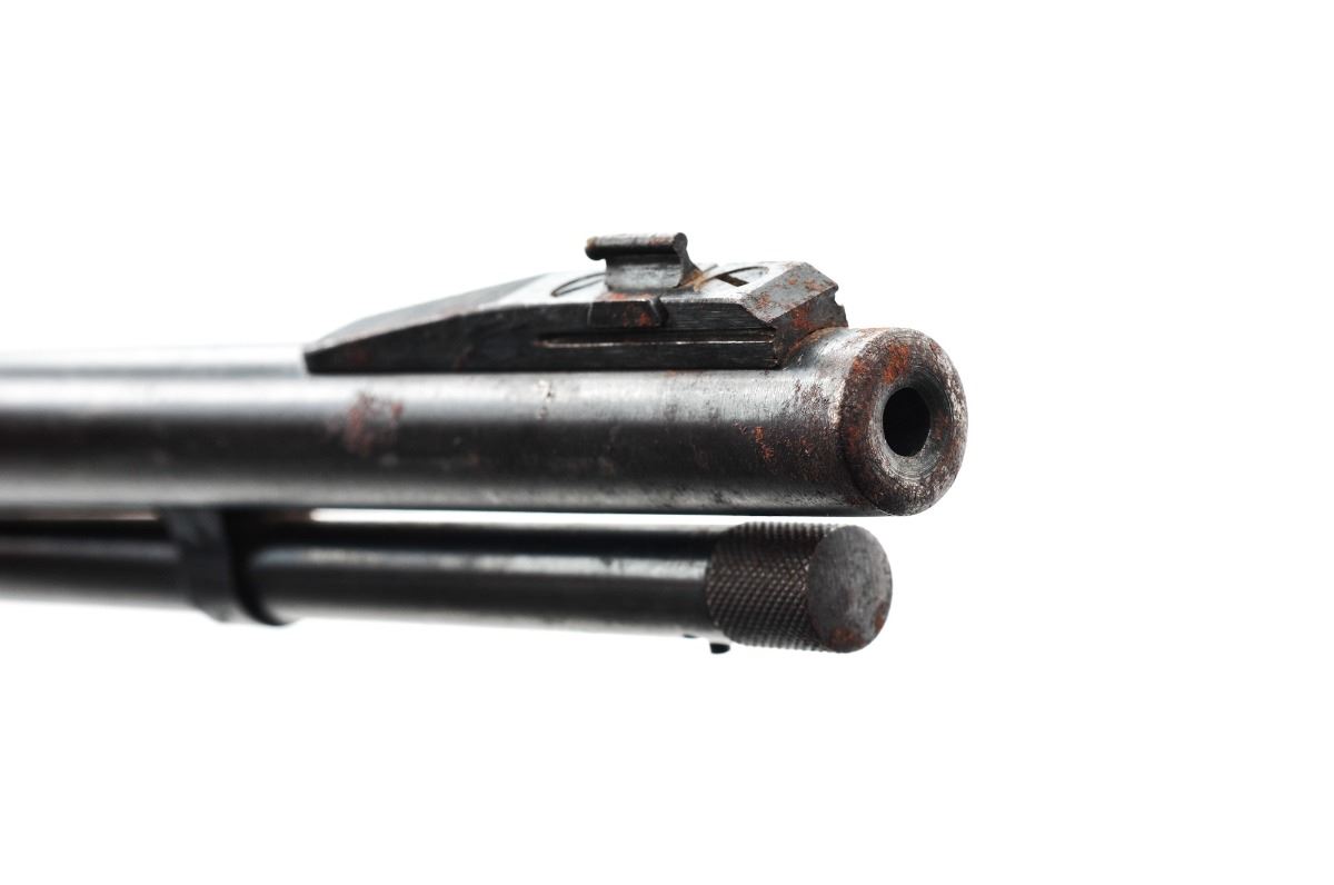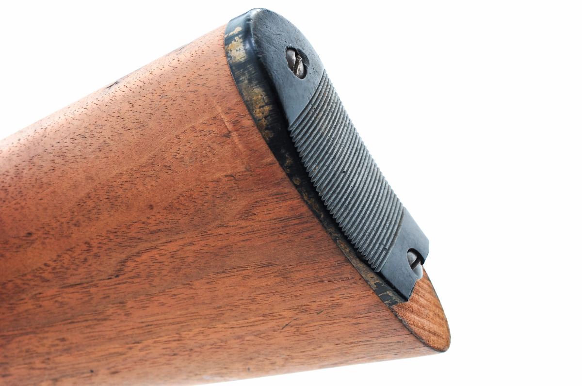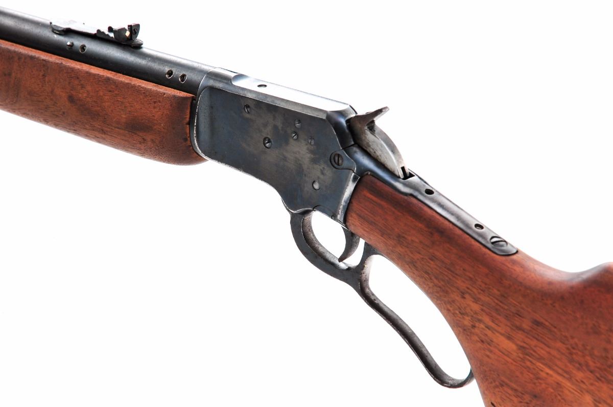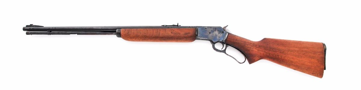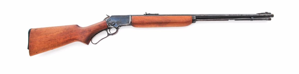 Marlin Model 39A Lever Action Rifle, #D12781, .22 S-L-LR cal., 24'' round barrel, blue finish, smooth pistol-grip walnut stock and forend, black plastic buttplate, ramp brass bead front sight and Marbles notched rear sight.  Condition is good retaining approx. 70% thinning blue with large amounts of scattered light surface rust.  Stock with no original finish; buttplate is missing 1'' portion at toe; mag tube with a few small dings.  Left side of barrel and tang are tapped for sights.  Action is crisp, bore is fine with nice rifling.  Est.:  $250-$400.  (C&R)