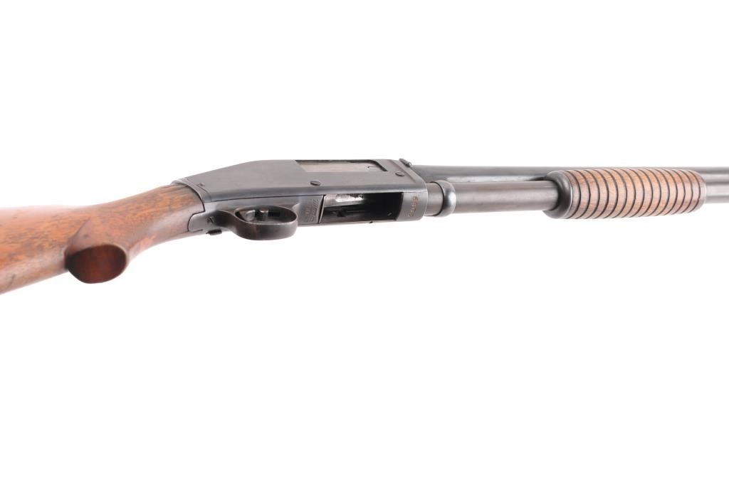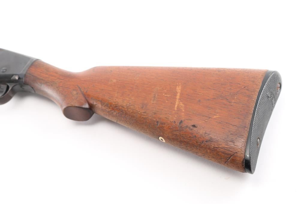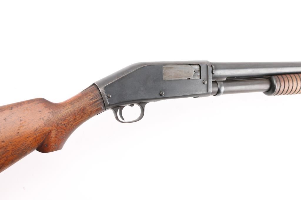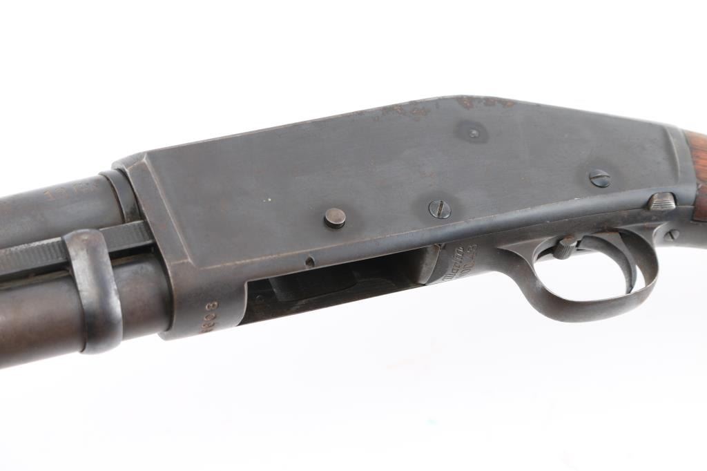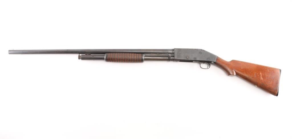 Vintage pump action shotgun manufactured circa 1920's. Accepts 2-3/4" shells. Features blued finish, ribbed walnut pump handle. smooth walnut shoulder stock, checkered black plastic buttplate (marked "BISHOP"), 30" plain barrel, brass bead front sight, fixed Full choke, manual safety inside trigger guard, Bore is very good condition. Retains 85% finish with scattered light patina, several scratches have developed thin rust, rub marks, edge losses. Pump handle is very good condition. Stock is fair condition, solid, with moderate losses at wrist, dented throughout. Condition is NRA Good+ *** C&R Firearm ***