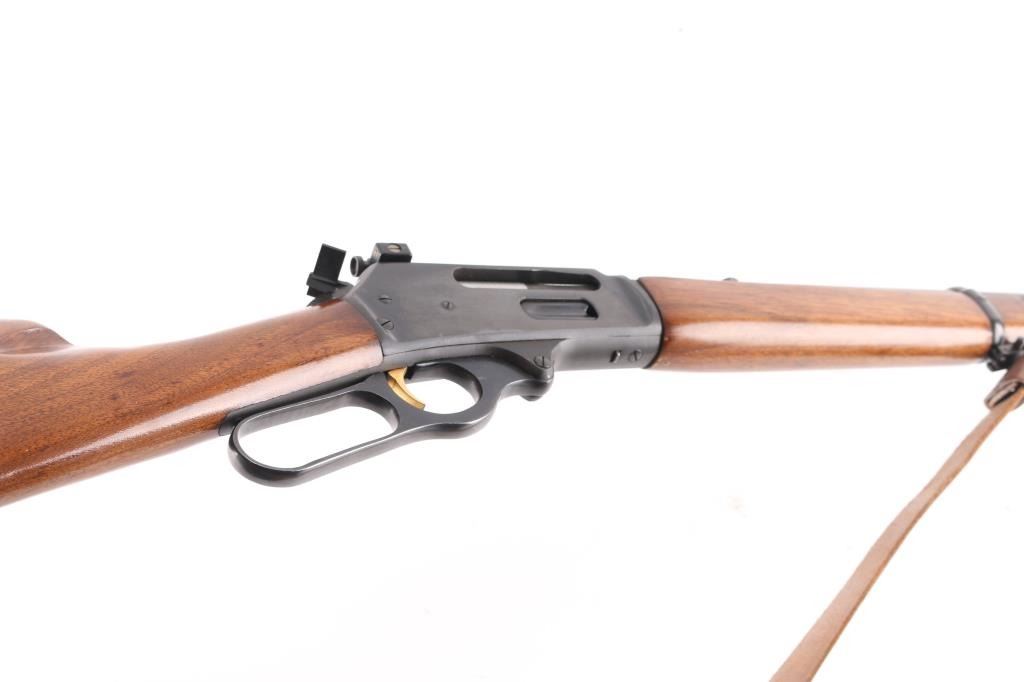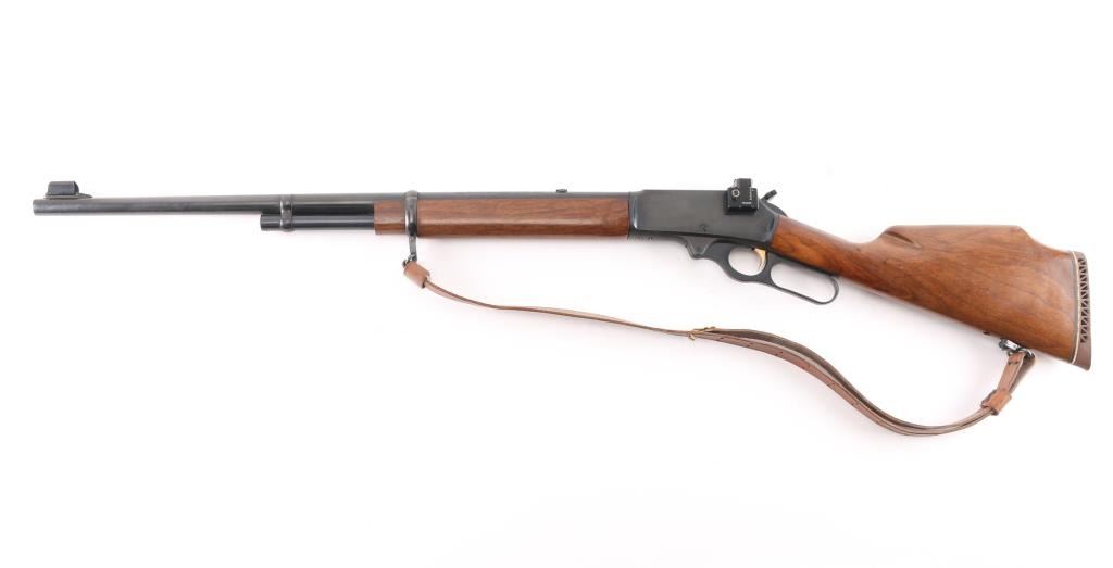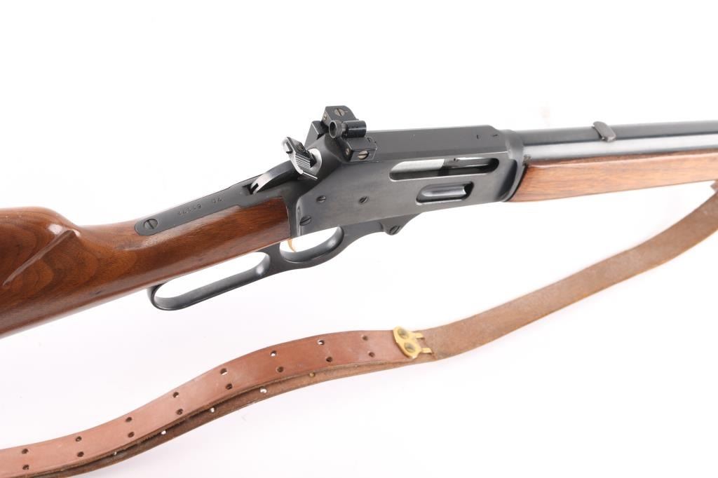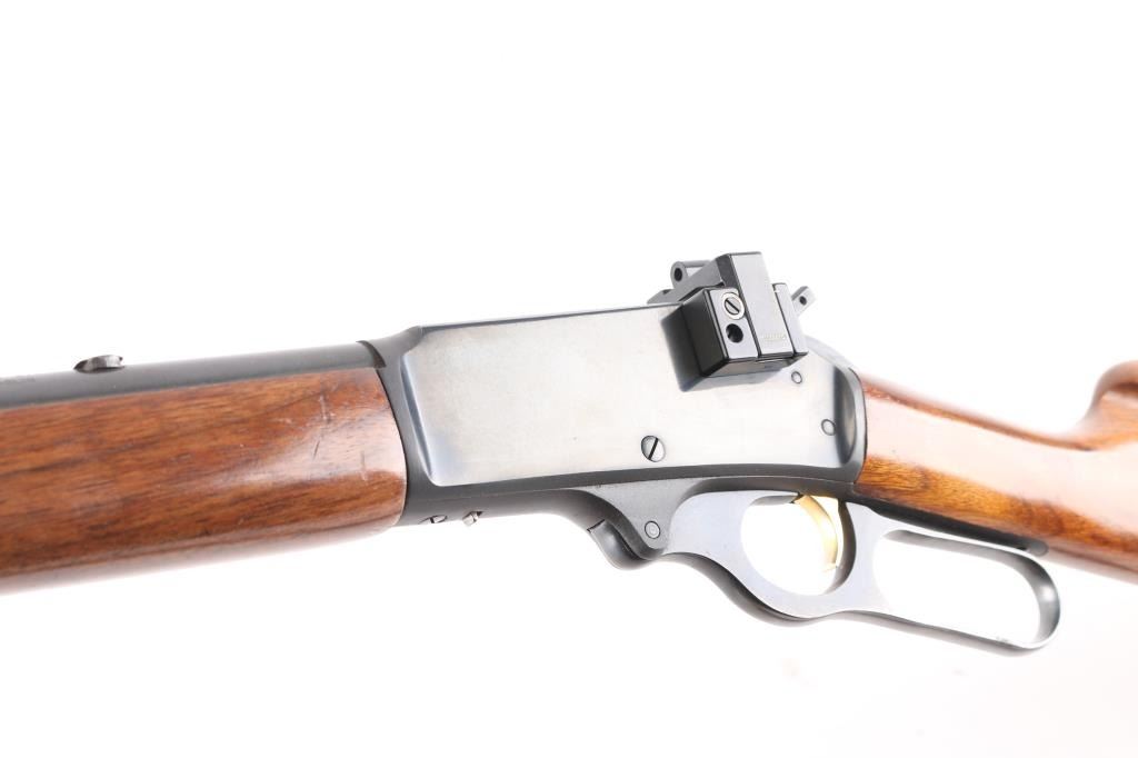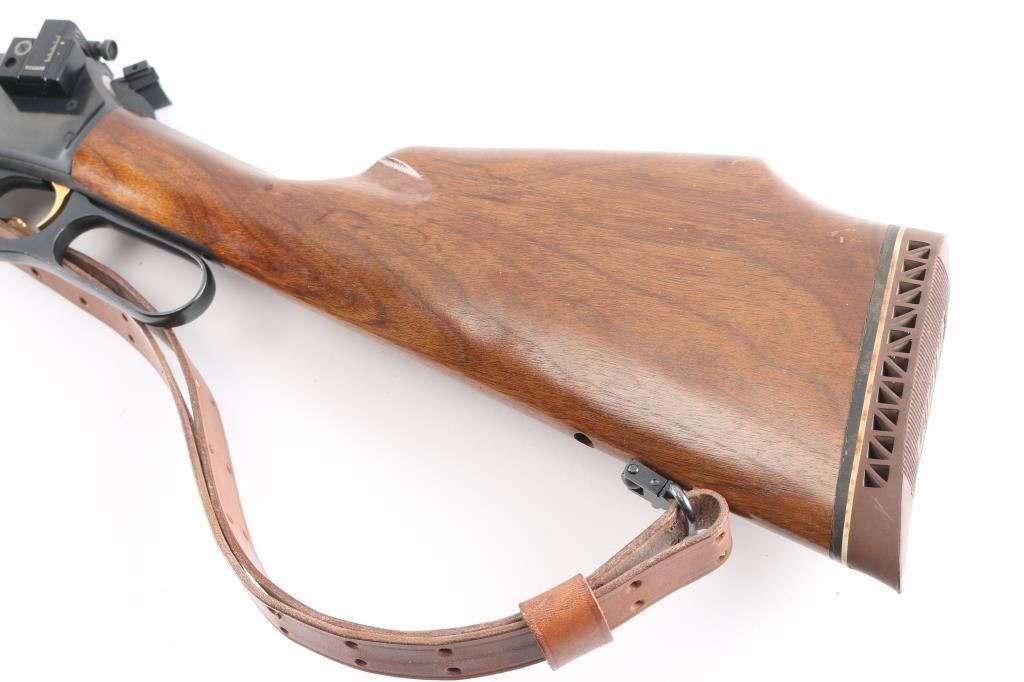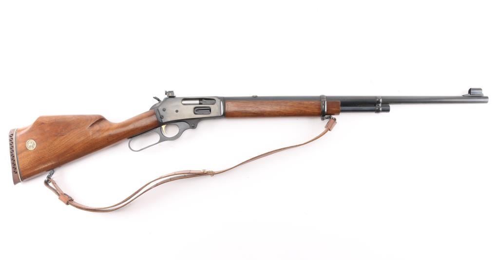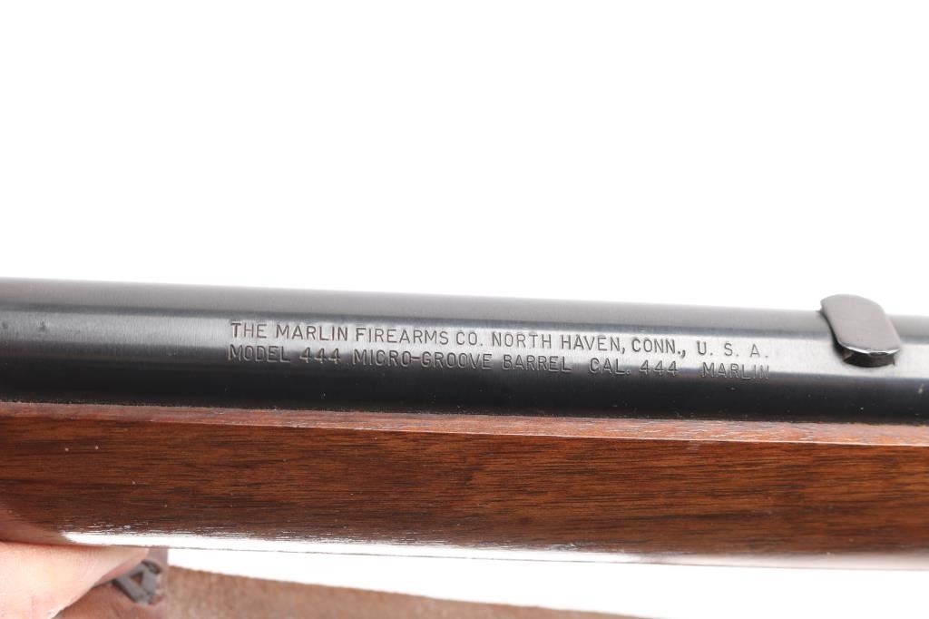 Big bore lever action repeating rifle chambered in .444 Marlin, Centennial Model with brass disc inletted in the left buttstock dipicting a man on horse holding a rifle with "Marlin 1870-1970". Features a blued finish, 24" micro-groove barrel, half length tubular magazine, hooded blade front sight with brass bead, rear sight removed with insert in the dovetail, a Williams adjustable aperture sight installed on the left receiver, smooth gold accent trigger, driller & tapped receiver, serrated hammer spur with offset "JM" extension installed, swivel studs, grip safety, smooth walnut forend and straight wristed high comb shoulder stock with ventilated rubber recoil pad. Bore is very good bright condition. Retains 95% finish with handling marks. Wood is very good condition. Includes good condition brown leather one hook sling.Condition is near NRA Excellent C&R Firearm.