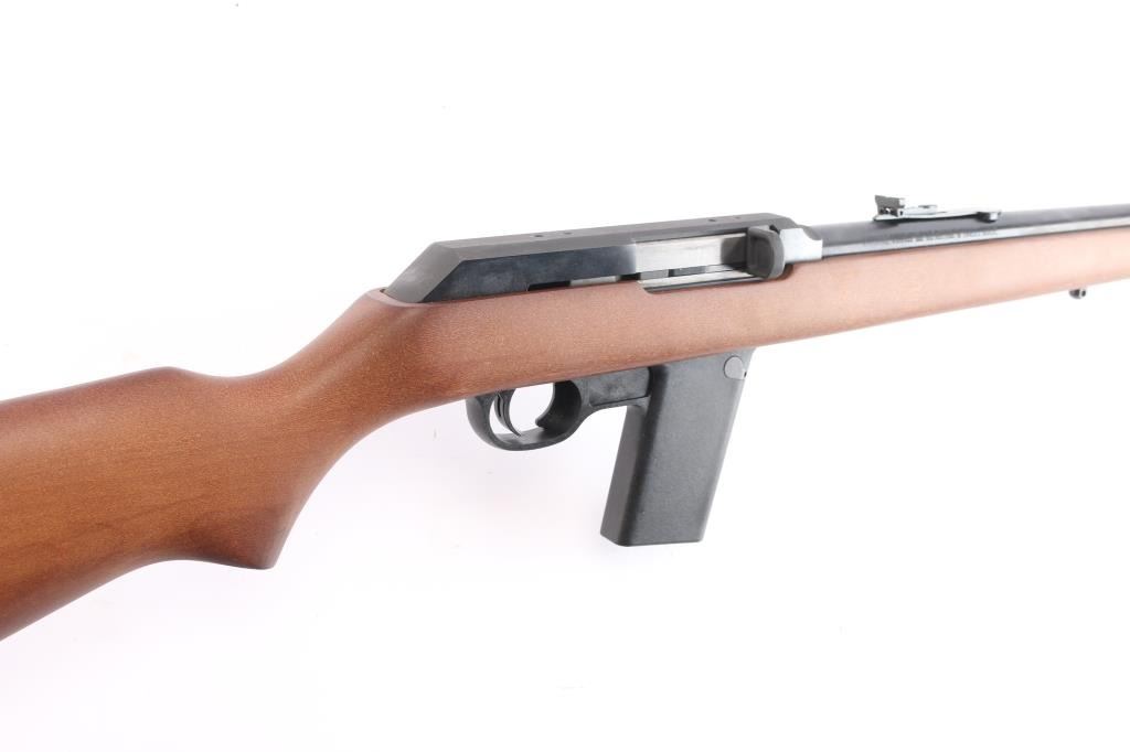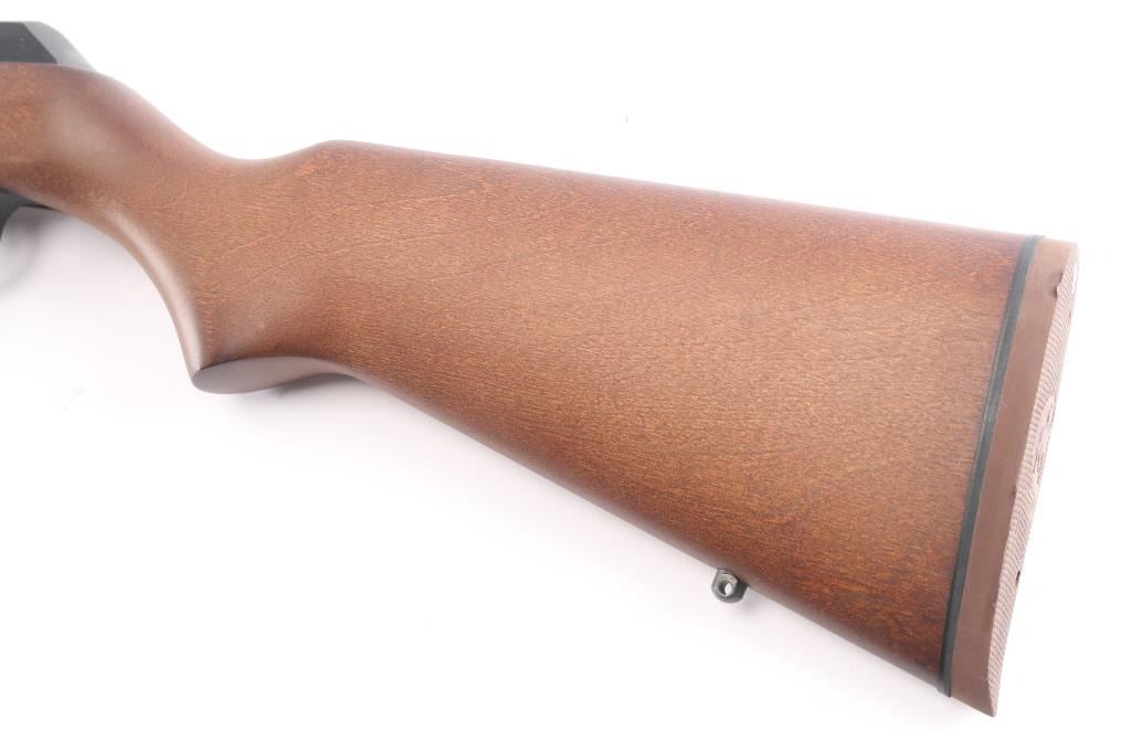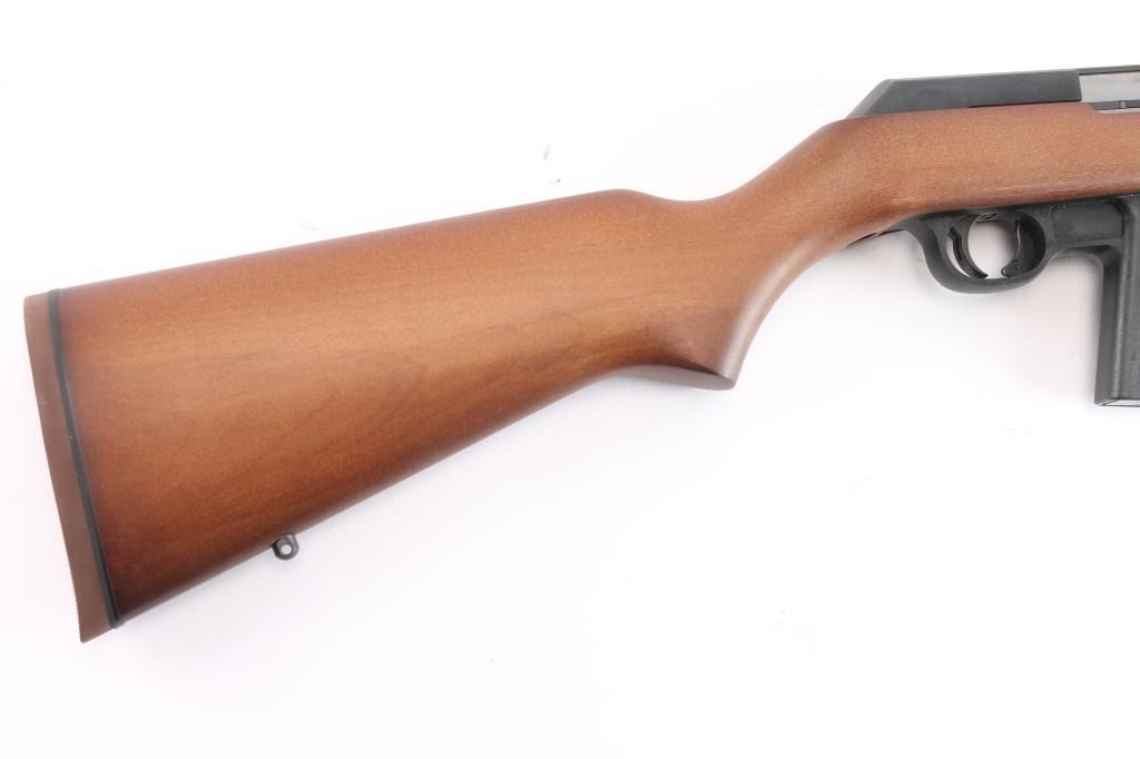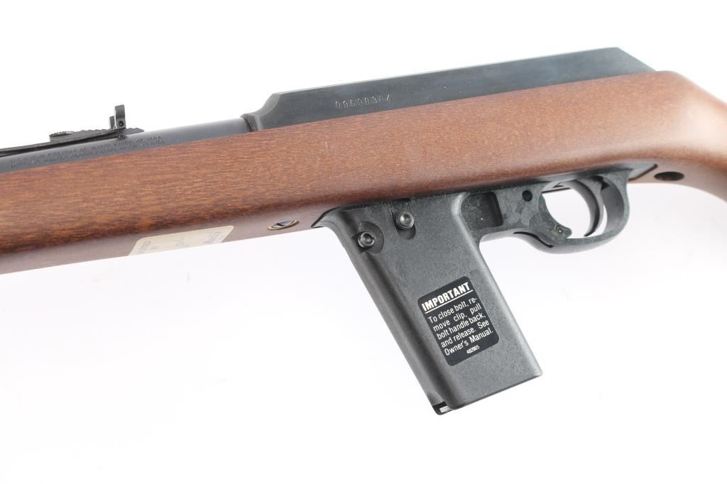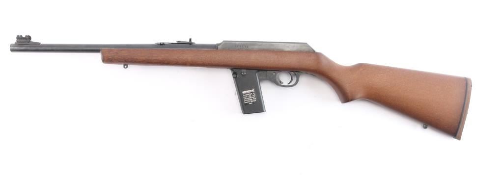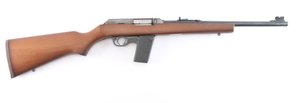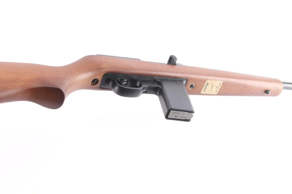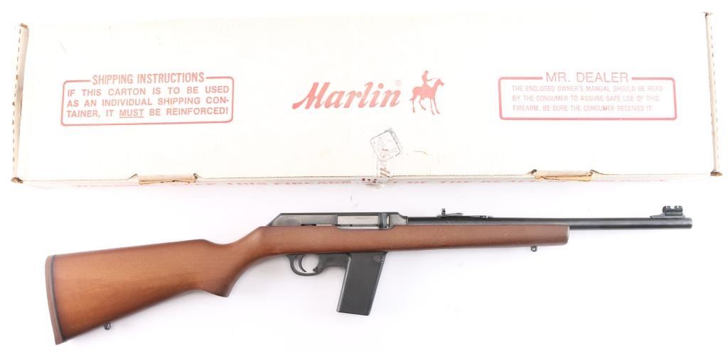 "The Camp Carbine". Semiautomatic carbine features 16 1/2" barrel, semi-buckhorn style sights with protected orange blade front sight, sling swivel studs, manual safety in triggerguard, thin rubber factory butt pad with black spacer, accepts detachable 1911 magazines. Polymer trigger guard and magazine well. receiver drilled/tapped for optics. Bore is pristine. Carbine is in like new condition, still has factory targeting label on stock. Comes with one Marlin magazine, factory box with matching label & manual. Manufactured 1991.
