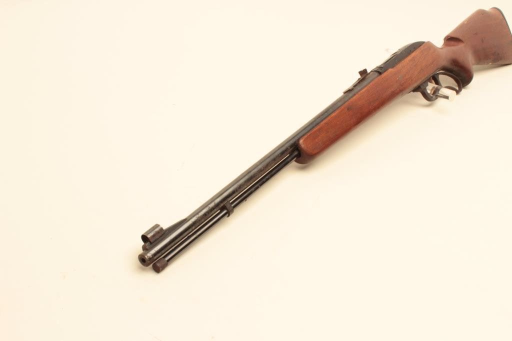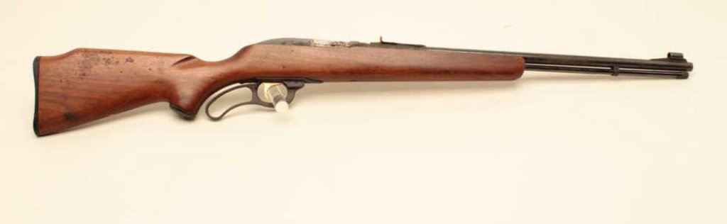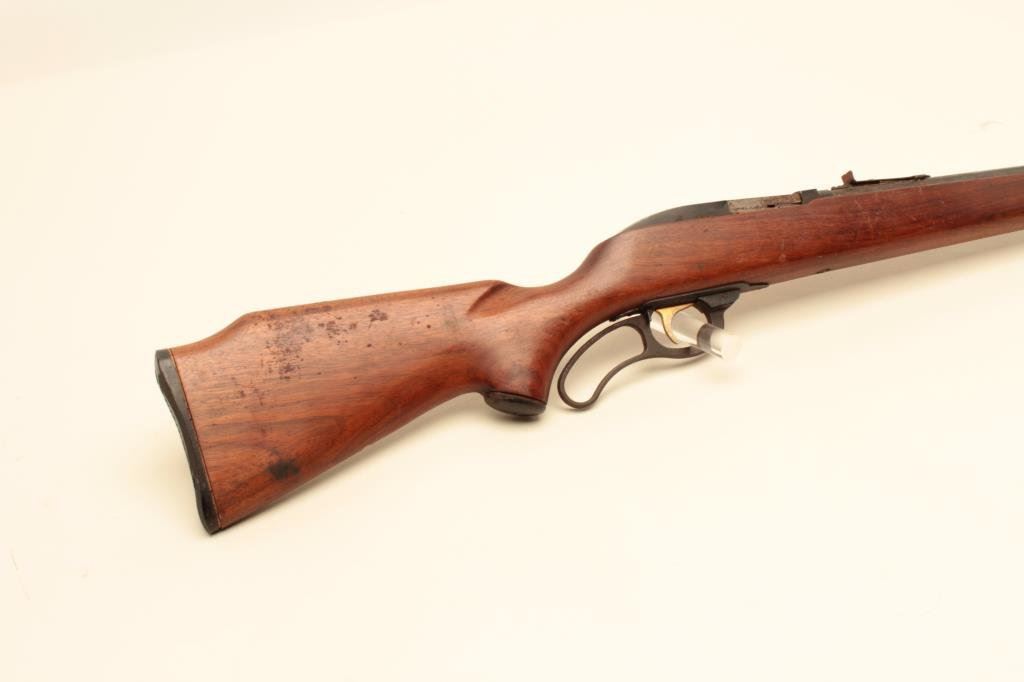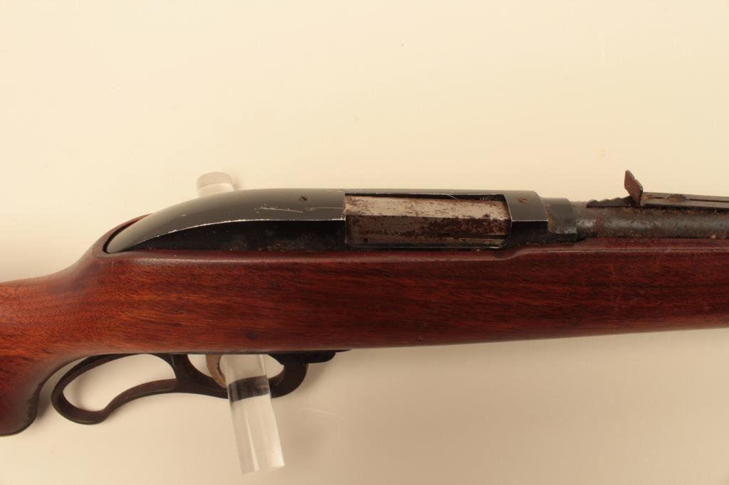 Long Rifle caliber, Serial #NSNV. The rifle is in fair overall condition with a 22” barrel with a hooded ramp front and adjustable rear sights. The barrel and magazine tube retain a significant amount of their blued finish with light to moderate surface rust the length of the barrel. The receiver retains the majority of its black finish with scratches and edge wear, the bolt shows moderate surface rust and erosion. The smooth wood stock is in good condition with mars, scratches and some loss of finish. The butt ends with a Marlin marked checkered plastic butt plate. The bore is fair, the action functions and the markings are legible. Est.: $100-$200.