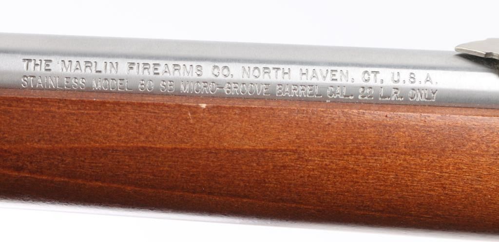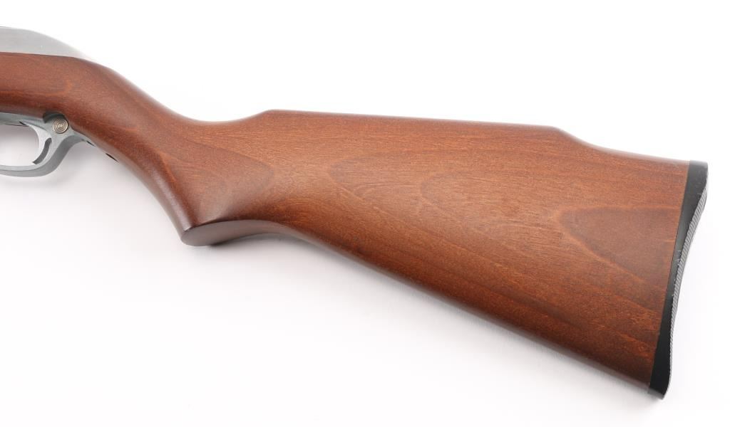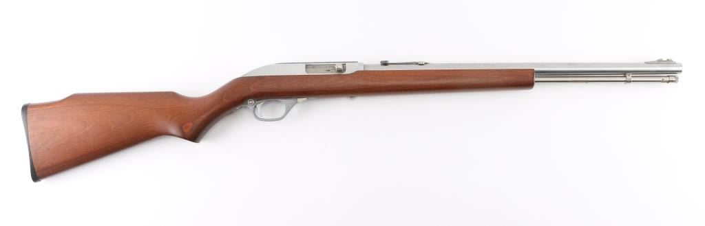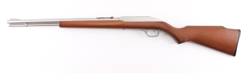 Semiautomatic rimfire rifle for 22 long rifle only. Features stainless steel construction, silver colored polymer triggerguard, smooth wood stock, black plastic buttplate, 19" barrel, full length magazine tube under barrel, blade front sight is missing from its dovetail, sporting rear sight folds (missing the elevation slider), grooved receiver, manual bolt hold open as well as automatic bolt lock back on empty magazine, push button safety. Stock appears to be laminated construction. Bore is very good condition. Overall excellent condition with minor handling marks. Condition is near NRA Excellent (missing front sight blade) *** Modern Firearm ***