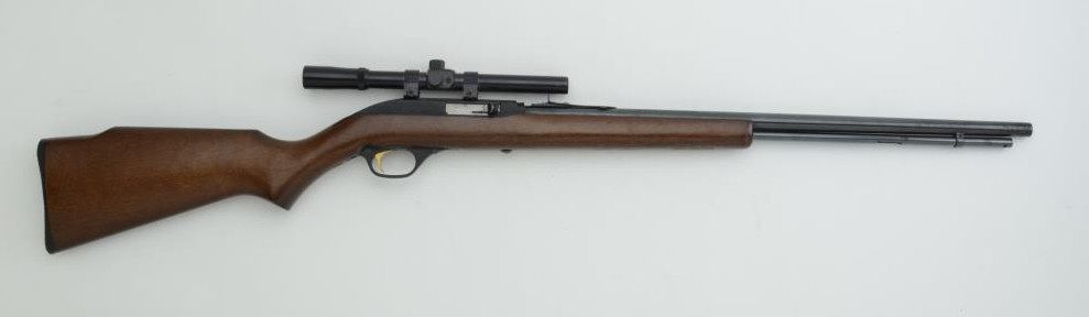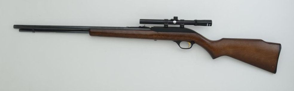 Marlin Model 600 semi-auto rifle, .22LR only cal., .22” barrel, blue finish, wood stock, missing loading tube, #12398307, mounted with Tasco 4X15 scope with good optics. This gun is in overall good condition with some spotsof surface rust and erosion, good action, bore, markings and wood. Est.: $100-$175.