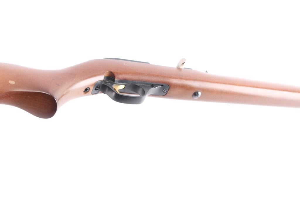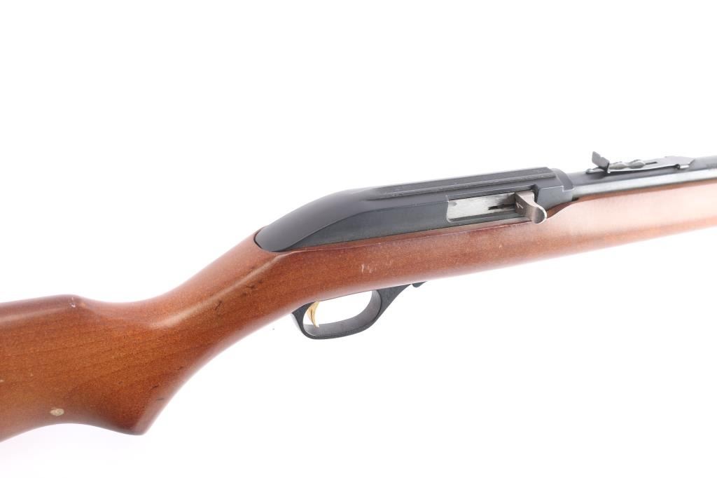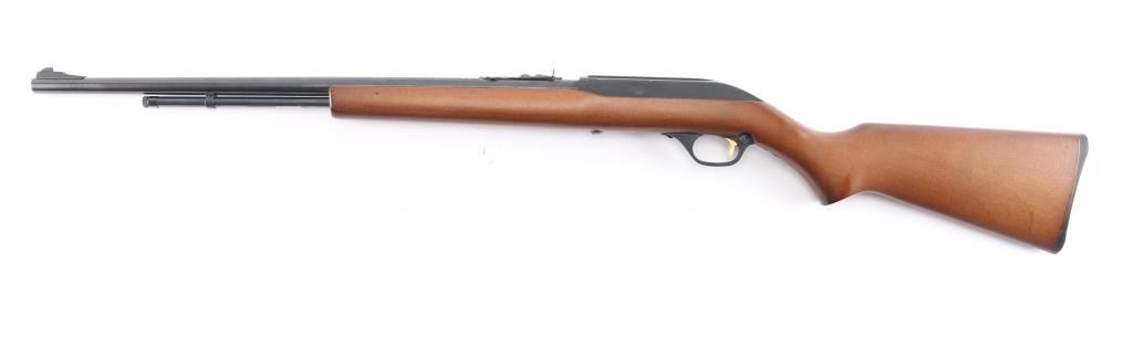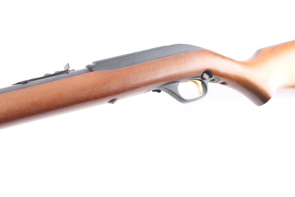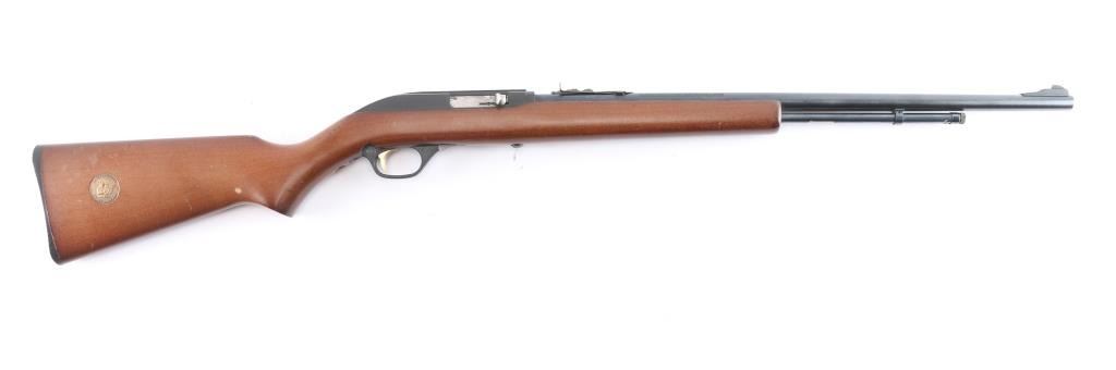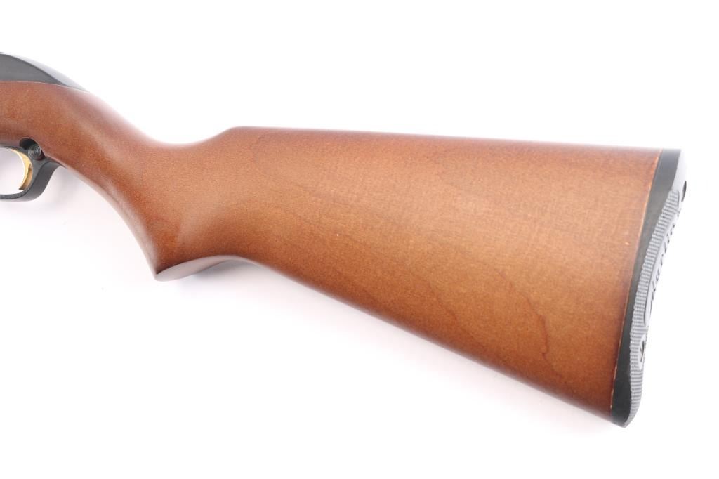 American made tube-fed semi-automatic rimfire sporting rifle chambered in .22 Long Rifle. Manufactured circa 1990 in North Haven, CT. Rifle features a blued 22" micro-grooved round barrel, fifteen-round tube magazine, serrated ramped blade front sight, adjustable rear sporting sight, integral optic rail cut into the receiver, serrated curved gold-toned trigger, annular cut push-button safety, bolt catch on the right side of the trigger guard, and 3/4 length magazine tube with knurled magazine button. The hardwood furniture consists of a smooth semi-pistol grip shoulder stock, smooth forend, an "Safety Ethics Sportsmanship" medallion inlayed on the right side of the stock, and a checkered factory black plastic butt plate. Rifle retains approximately 99% of its original blued finish showing very little wear. The receiver's satin black painted finish is very good to excellent with minor scratches and blemishes. Metal displays no rust, or deformation. Action is smooth and crisp, and the bore is bright with strong rifling. The hardwood furniture is very good to excellent with very light handling marks on the right side of the stock with one small tear drop shaped spot of finish loss.