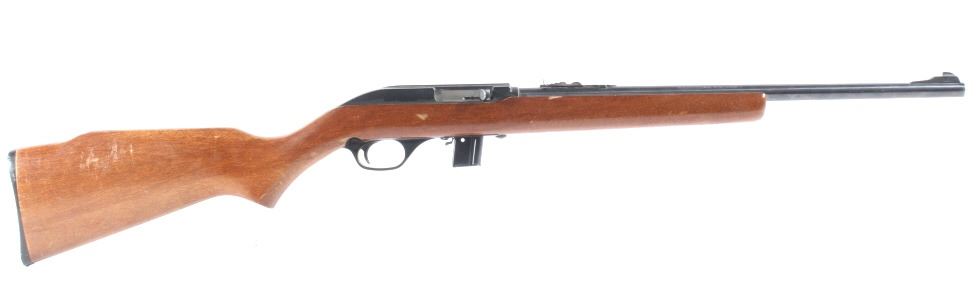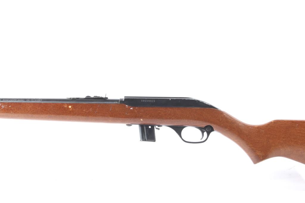 Offered for sale is a Marlin Model 70 .22 LR Semi Auto Rifle. The rifle features a 18" barrel, one 10 round magazine, walnut stock, adjustable rear sight, and blue'd finish. This rifle is in good condition, with handling marks and signs of use. This mechanics are in good condition, operating smoothly. The bore shows good rifle and a shiny bore. This is a modern firearm. FFL transfer or NICS background check required. The serial number is 18559971