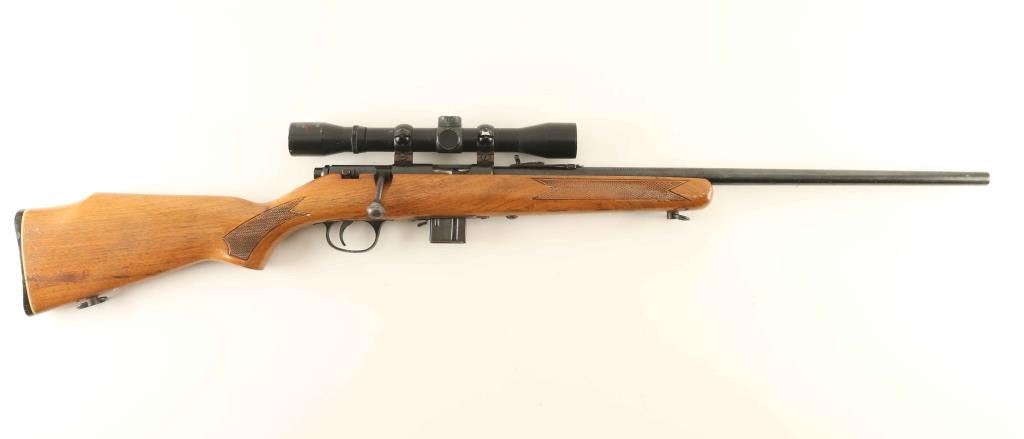 American made bolt action sporting rifle chambered in .22 Winchester Magnum Rimfire. Features a blued finish, 22" barrel, removed rear sight, elevation adjustable rear sporting sight, Tasco 4x 32mm scope, serrated trigger, alloy trigger guard, manual safety on the right side of the receiver, detachable magazine, sling swivels and press checkered pistol grip shoulder stock with high comb & factory buttplate. Rifle exhibits approximately 60% of it's original finish showing light muzzle wear and a heavy amount of scattered light surface rust. Action is smooth, the bore is very dark, optics are hazy and the wood stock is good. Condition is NRA Poor. ***Modern Firearm***
