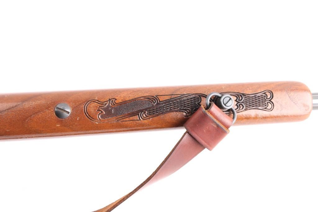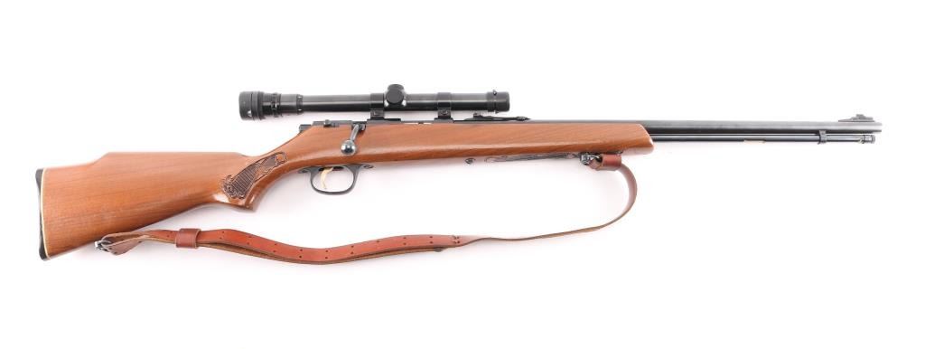 Bolt action tube fed magnum rimfire rifle chambered in .22 Magnum, manufactured circa 1980. Features a blued finish, 22" micro-groove barrel, full-length tube magazine, blade front sight, elevation adjustable rear sporting sight with folding leaf, Weaver V22-A 3-6x scope installed utilizing the integral scope rail cuts in the receiver, serrated gold tone trigger, alloy trigger guard, manual two-position safety on the right side of the receiver, turned down & swept back bolt handle, sling swivels, press checkered wood semi-pistol grip shoulder stock with high comb, inlayed bull's eye & factory buttplate. Bore is pristine. Retains 95% finish with handling marks. Scope is very good with clear view. Wood is very good, some scuffs, some losses to finish. Includes good condition brown leather sling.