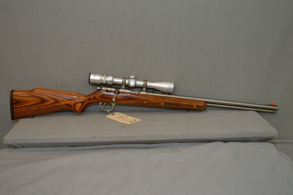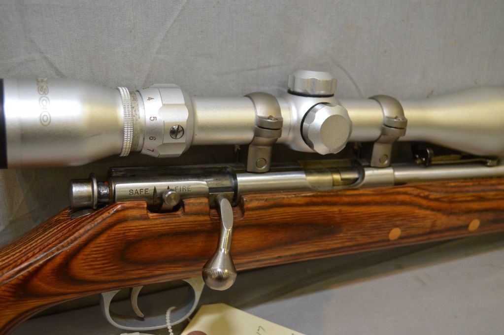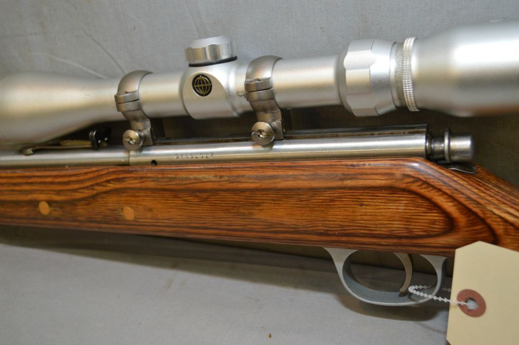 Marlin Model 883 SS .22 Win Mag Cal Tube Fed Bolt Action Rifle w/ 22" bbl [ stainless finish, barrel sights, also fitted w/ Tasco World Class 3 x 9 variable scope in satin finish, laminated pistol grip stock w/ three repairs to forewood, note wood filler on both sides, Marlin recoil pad ] Ser # 07651017