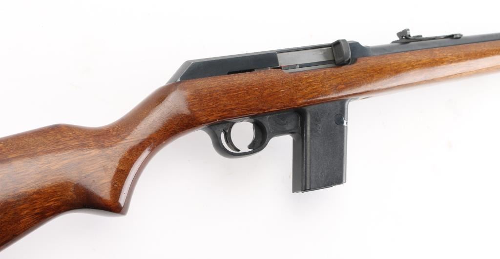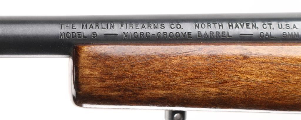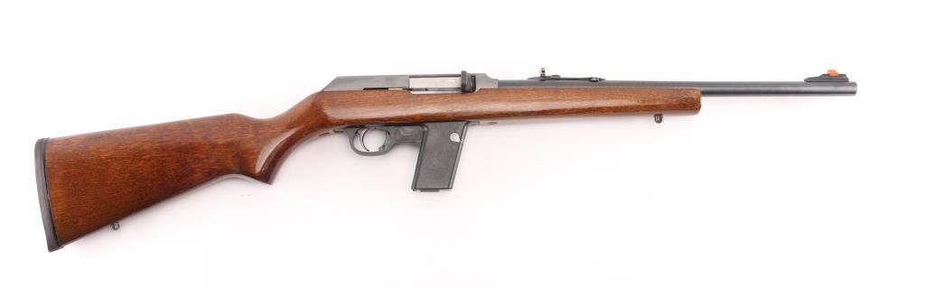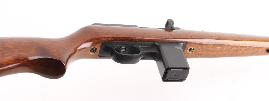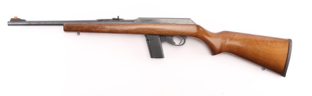 SN: 11575971. 'Camp Carbine'. Semiautomatic carbine features approx 16" barrel, buckhorn style sights with front sight with orange insert, sling studs, manual safety in triggerguard, thin rubber butt pad, receiver drilled & tapped for scope base, accepts detachable magazines (one 12 rd included). Accepts S&W 59 series magazines. Bore is very good or better condition, needs cleaning. Retains 96% blued finish with bare metal at sharp edges. Plastic trigger guard and magazine well is very good condition. Wood stock is very good with some minor scratches and dings. Manufactured 1986-99. Condition is NRA Very Good. Modern Firearm.