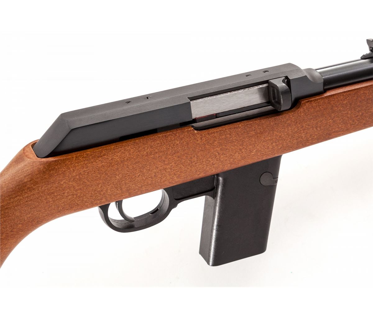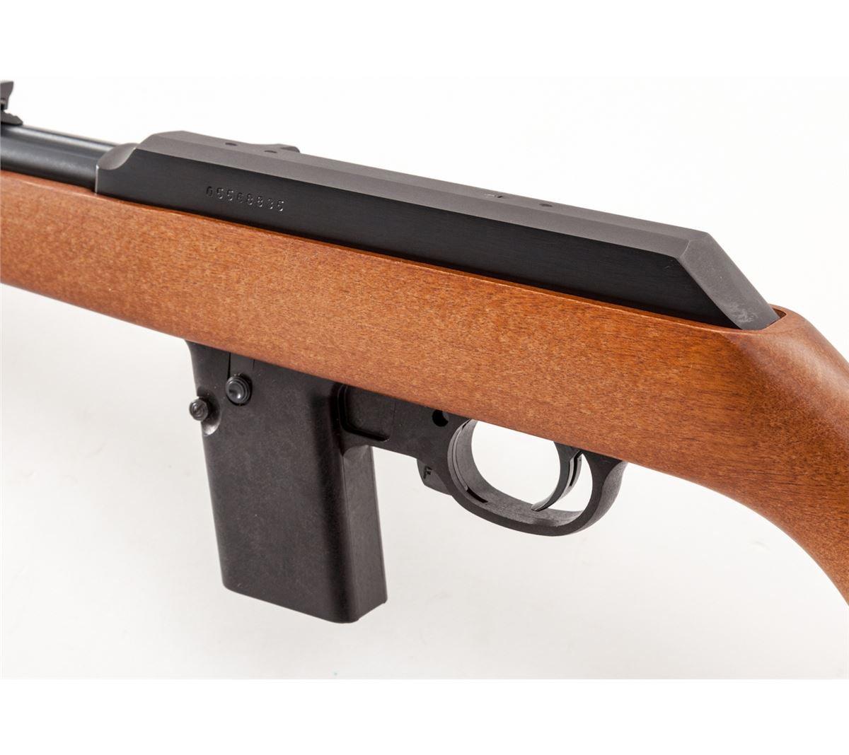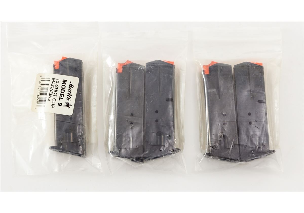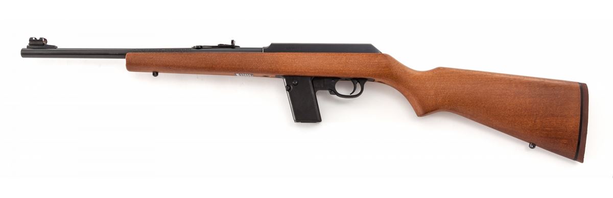 Marlin Model 9 Camp Carbine, #05568835, 9mm cal., 16-1/2'' micro-groove barrel, blue finish, smooth pistol-grip walnut stock, Marlin hard rubber buttpad, adjustable open rear sight, semi-hooded orange front sight, with six (6) magazines, in original box with matching end label and owner's manual. Condition is excellent, appearing as new. Forend with the original warning sticker intact. Est.: $600-$800. (Modern)