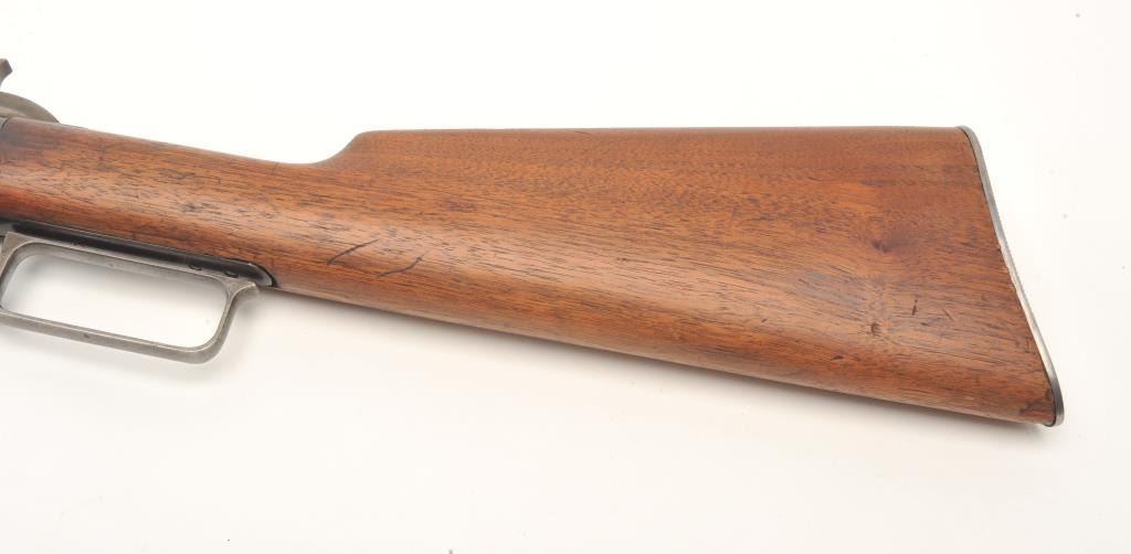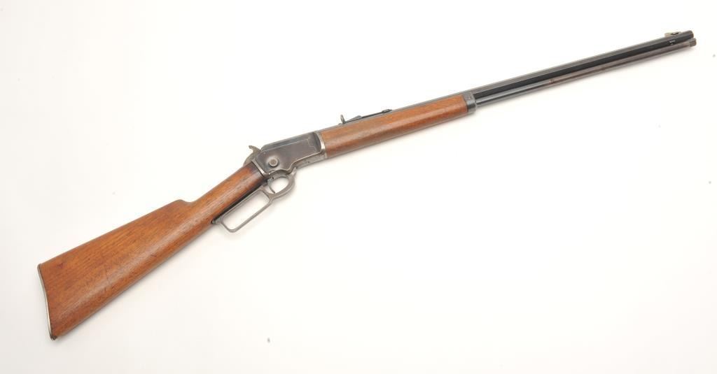 Marlin Model 92 takedown lever action rifle, .22 caliber, serial #374282. The rifle is in very good overall condition with a 24” octagon barrel with a silver knife blade and buckhorn rear sights. The barrel and fulllength magazine retain the majority of their thinning blued finish with sharp edges and some knackering at the muzzle. The receiver shows significant amounts of original blued finish with the remainder going to plumpatina, while the top has been drilled and tapped for a scope mount. The smooth wood stocks are in good condition with a small crack at the wrist and the steel butt plate becoming proud due to shrinkage of thesurrounding wood. The bore is fair, the action crisp and markings are sharp on this nice, old Marlin. (C+R) Est.: $300-$600.