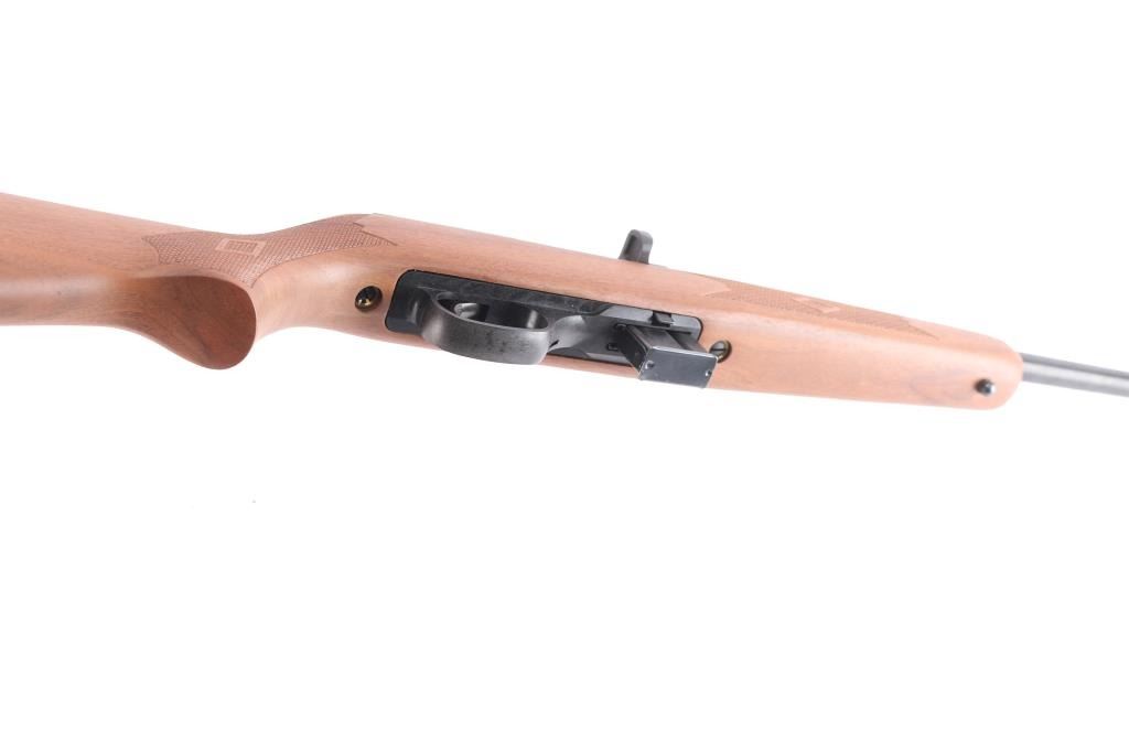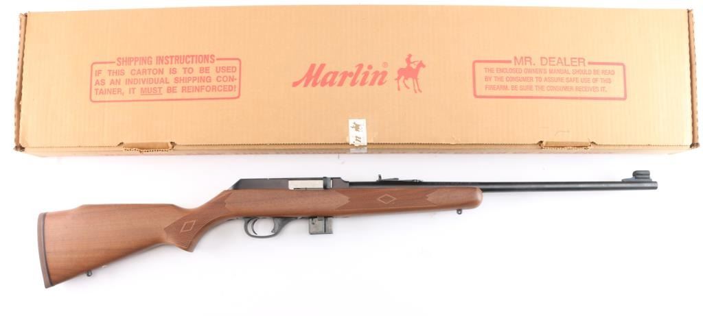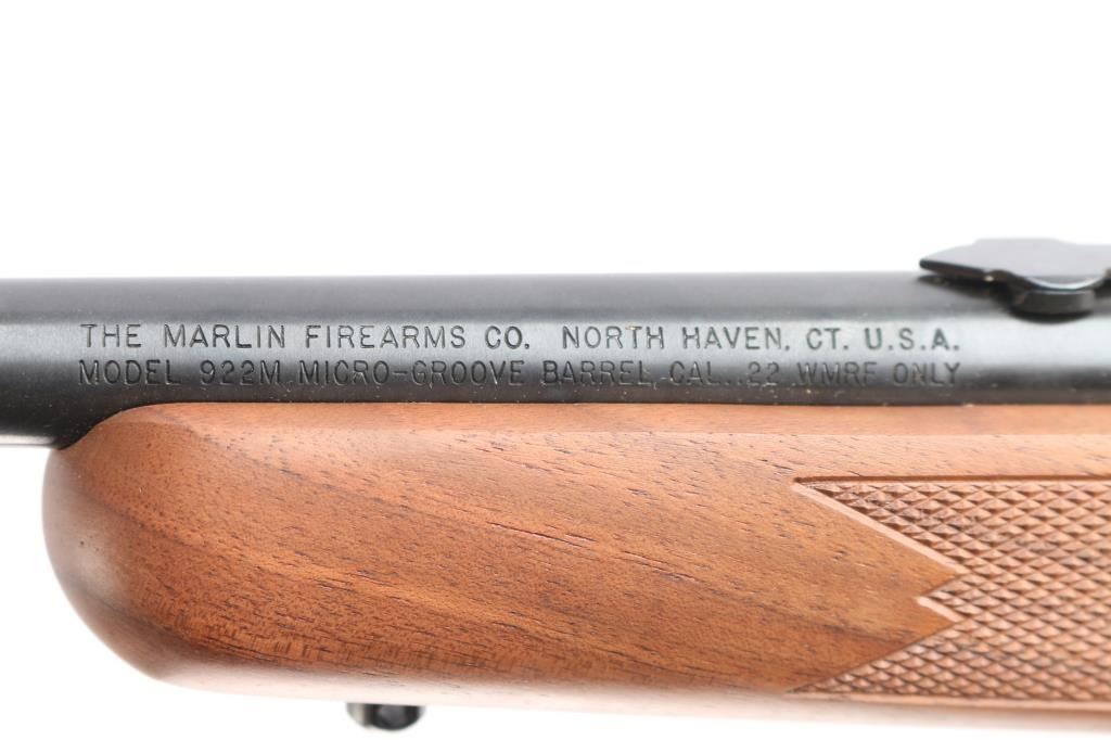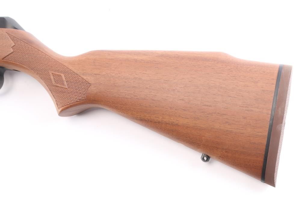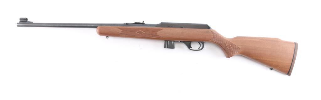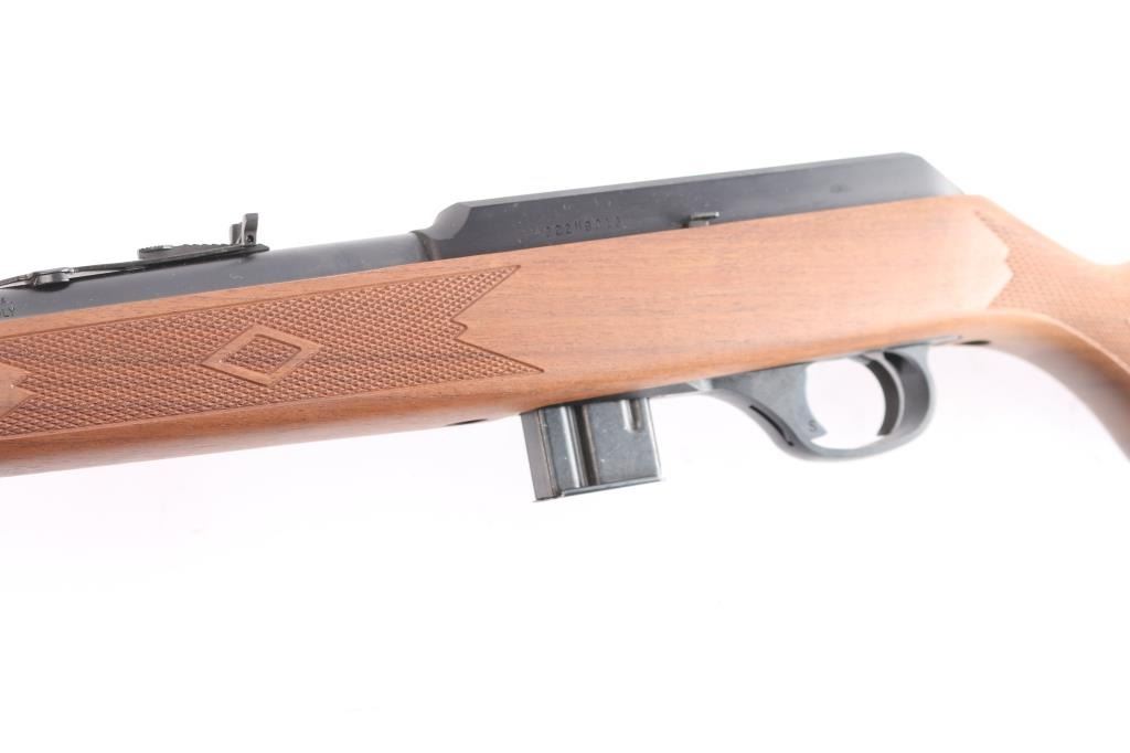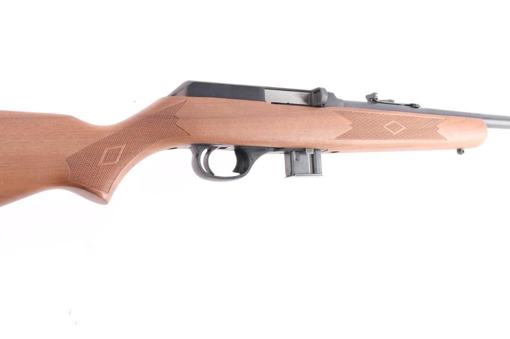 Semi-automatic rimfire rifle chambered in .22 Magnum. Features a blued finish, 201/2" barrel with hooded blade/bead front, adjustable rear sporting sights. manual safety in triggerguard, wide serrated trigger, walnut semi-pistol grip stock, sling swivel studs, thin rubber factory recoil pad with black spacer, checkered panels at wrist & forearm. The bore is pristine, rifle is in like new condition. Comes with factory blue steel magazine, factory box with matching label and manual.